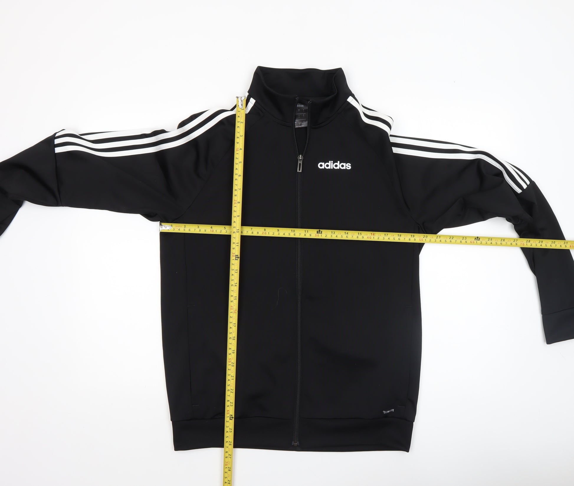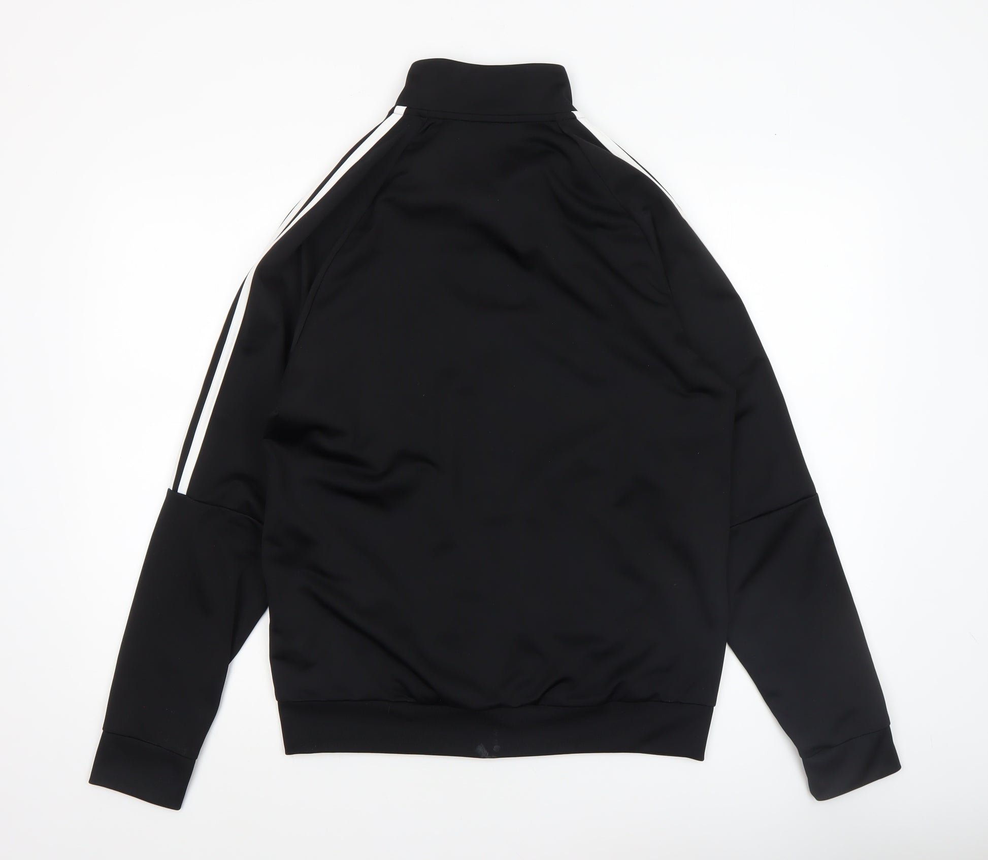 This adidas men's black full zip sports jacket offers a sleek and versatile design ideal for active or casual wear. Made from soft polyester jersey fabric, it delivers durable comfort with a smooth finish that is perfect for workouts, travel, or everyday use. The jacket features the classic adidas three-stripe detail along the sleeves and an embroidered logo on the chest, maintaining a timeless sporty appeal. With a regular fit and mid-length cut, this jacket allows comfortable freedom of movement while maintaining a clean silhouette. Designed with practicality in mind, it includes handy side pockets to keep essentials secure and a full front zip closure to easily adjust ventilation throughout the day. The high stand-up collar adds extra warmth and a sharp, structured look, complementing its modern aesthetic.Built for transitional weather, this piece is both breathable and lightweight — suitable for spring and autumn wear. Its polyester construction ensures machine washability, making maintenance simple without compromising quality. Ideal for gym sessions, running, jogging, or casual leisure activities, this jacket blends performance with effortless style.Conditioned in excellent pre-loved shape, it shows minimal signs of previous wear with no significant marks or damage. A reliable, functional choice for men who prioritise comfort, durability, and sporty sophistication in their outerwear, this adidas jacket captures the essence of an active lifestyle while fitting seamlessly into everyday wardrobes. Whether worn over a t-shirt for warmth on cooler days or layered for athletic performance, it’s a must-have versatile addition to your collection.
