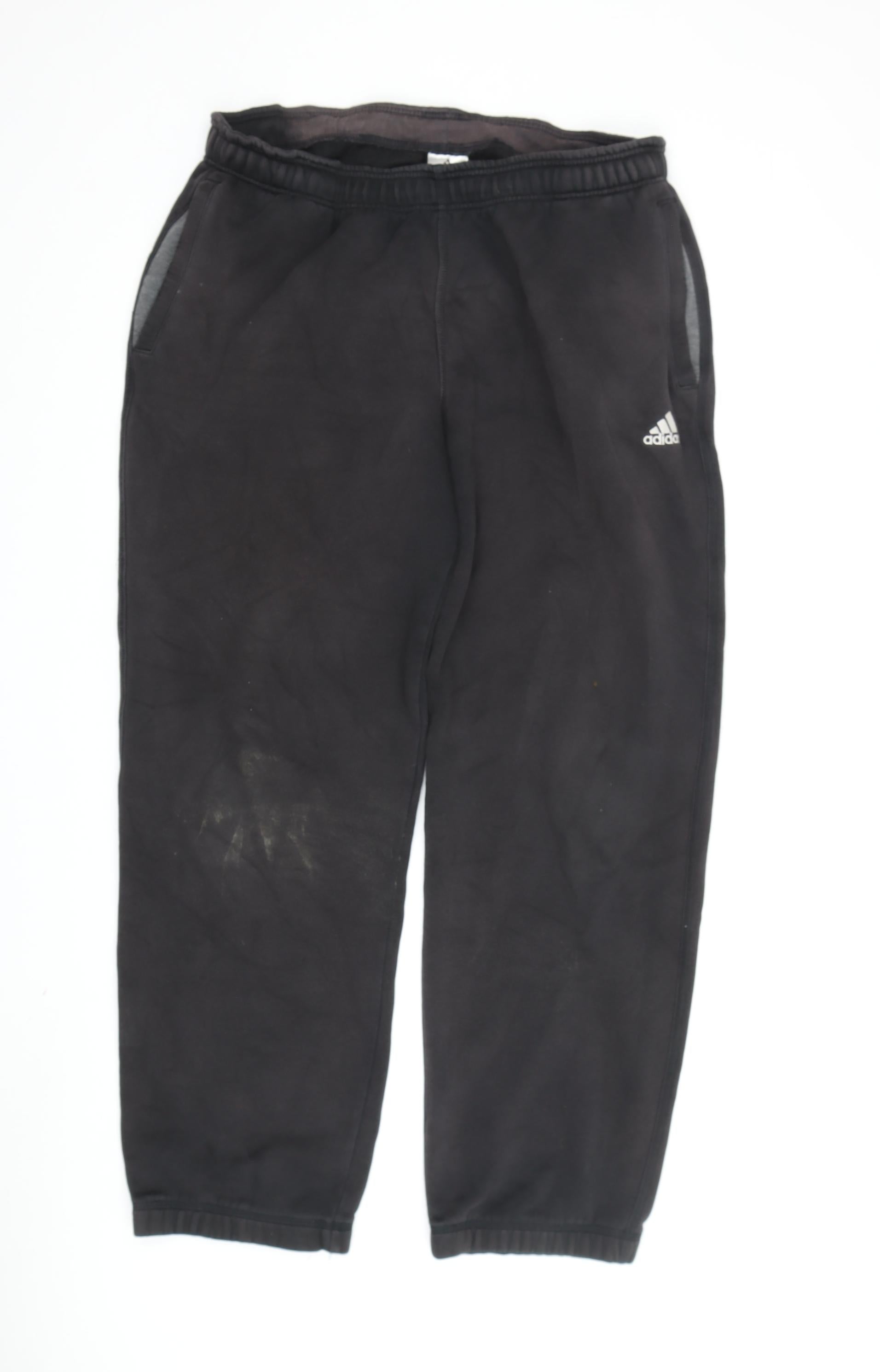 These Adidas Men’s Joggers in classic black offer an ideal blend of comfort and style, perfect for both gym sessions and casual outings. They are crafted from a soft fleece fabric that incorporates 70% cotton and 30% polyester, providing a cosy yet durable experience suitable for autumn and winter conditions. These joggers come in a regular large size and feature an elasticated waist and pockets, ensuring both comfort and functionality whether you're training or relaxing.Designed with a regular fit and tapered leg style, they present a sleek silhouette that complements various builds. The simple, unpatterned design adds versatility, making these joggers easy to combine with other activewear or casual attire. They're particularly well-suited for active occasions such as gym training, running, and jogging, but versatile enough for everyday wear.While the joggers are in good condition, some visible wear and minor fading give them a rugged edge that doesn’t compromise their excellent utility or style. Machine washable for easy care, they maintain their features without extensive maintenance, ensuring long-lasting use.Whether you're on the treadmill or simply enjoying a day out, these Adidas joggers are a reliable and fashionable choice, and at an affordable price point, they provide excellent value for your active lifestyle. Enhance your wardrobe with a piece that combines Adidas's trusted quality with practical design.