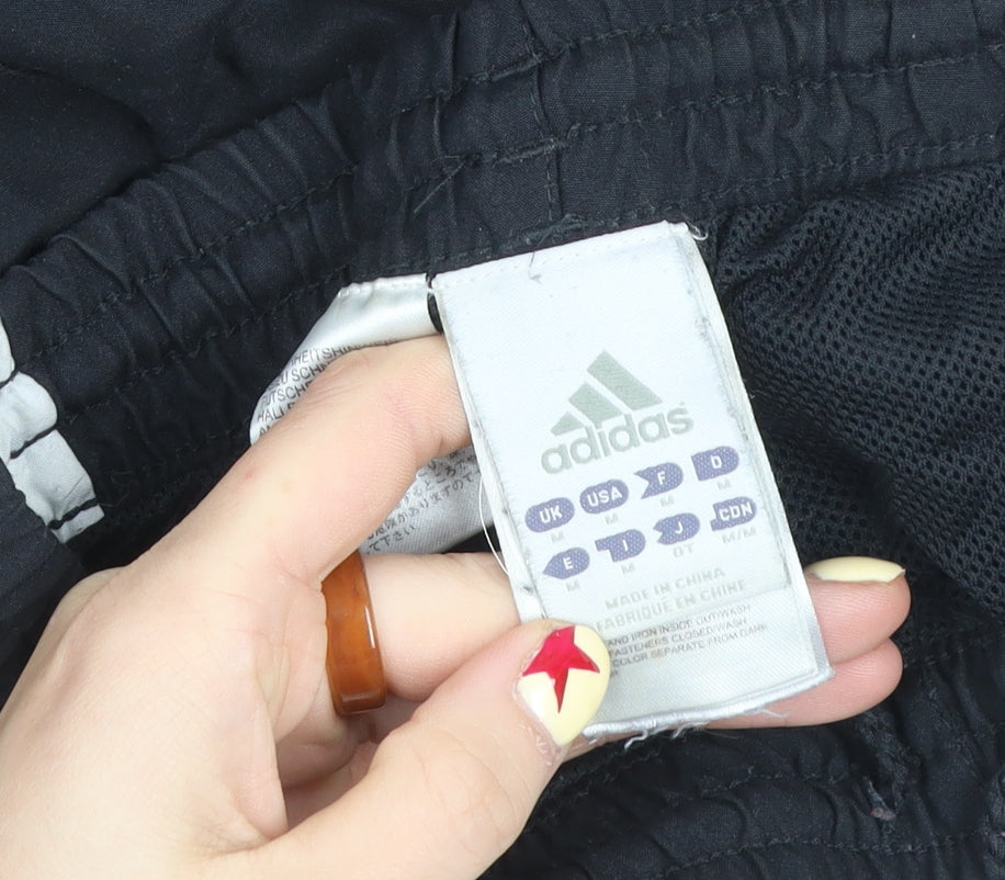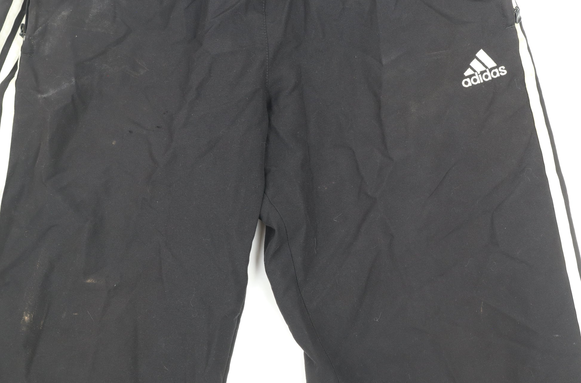 Step out in classic sports-inspired comfort with these Adidas Men’s Black Track Pants, designed for all-season wear and a variety of active pursuits. Made from lightweight woven 100% polyester fabric, these trousers provide durability, breathability, and moisture-wicking performance for your daily workouts or casual training sessions. The versatile black design, accented with Adidas’ signature white side stripes and logo detail, gives a timeless athletic style that fits effortlessly both on and off the field. The trousers feature an elastic waistband with an adjustable drawstring for a secure fit, along with multiple zip pockets that add both practicality and convenience, keeping your essentials safe while on the move. The straight leg with discreet ankle zips allows easy wear over trainers or boots, making them ideal for pre- and post-training sessions. Suitable for running, football, gym workouts, and general activewear, these track pants also double perfectly for laid-back leisurewear thanks to their modern, sporty silhouette and comfort-first design. In a versatile medium size, they cater to a wide range of builds, ensuring freedom of movement during any activity. With minimal signs of use and minor marks consistent with gentle wear, the trousers remain in very good condition—clean, functional, and ready for immediate wear. Machine washable for easy care, these Adidas track pants combine practicality, durability, and style in one essential piece. Whether worn during training, outdoor running, or simply as part of your casual wardrobe, their performance-driven construction ensures lasting quality and a timeless athletic edge. A great value option for anyone seeking reliable and stylish activewear from one of the world’s leading sports brands.