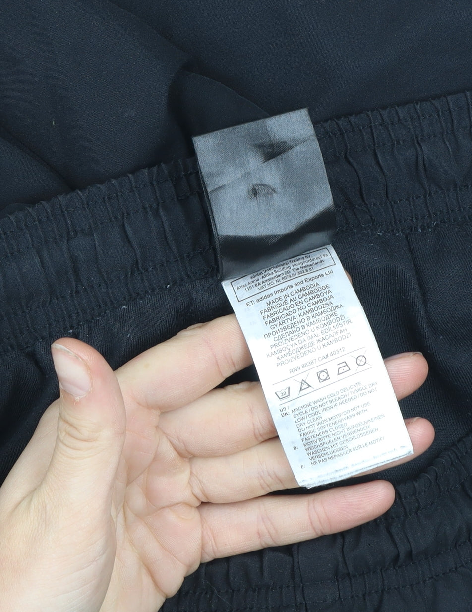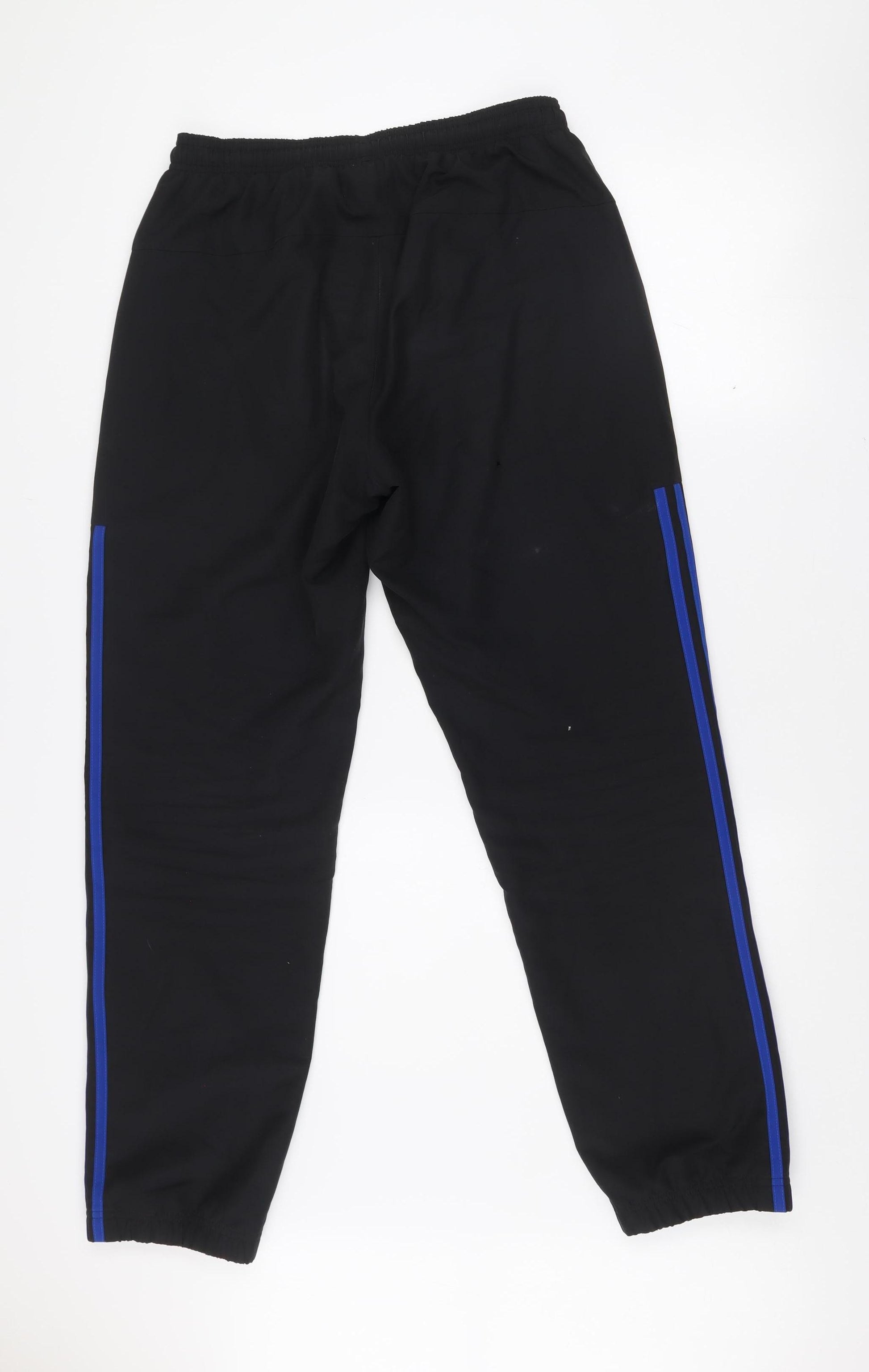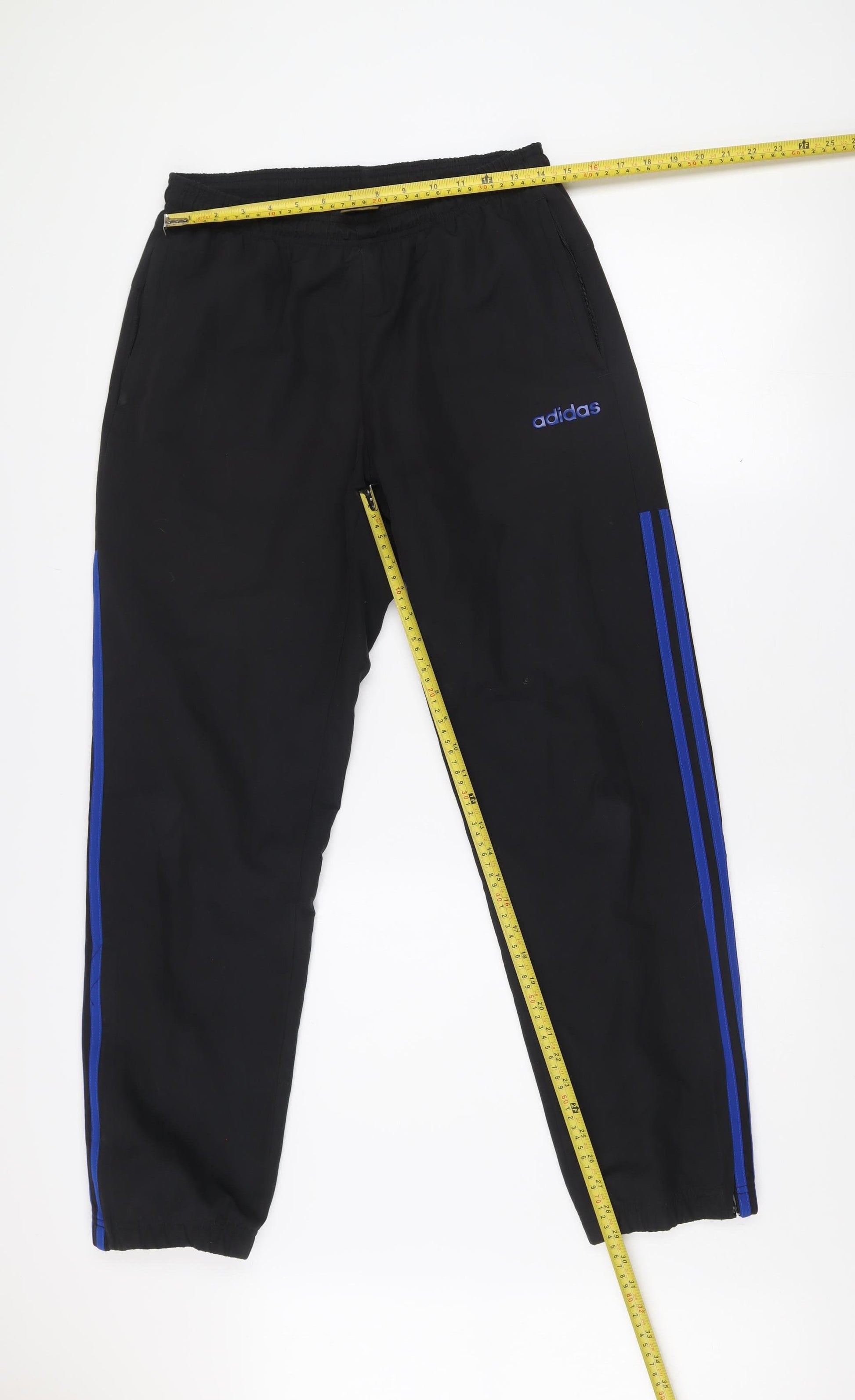 These adidas men's black track pants offer a stylish and practical option for activewear and casual wear alike. Designed for comfort and movement, they are made from high-quality woven polyester, known for its durability, lightness, and breathability. The pants feature the iconic adidas design with bold blue side stripes along the legs, adding a sporty touch that remains timeless. The regular fit and tapered leg style ensure an athletic and flattering silhouette suitable for gym sessions, football training, running, or laid-back days out.Constructed with an elasticated drawstring waist for a secure and custom fit, these track pants provide ease of wear and flexibility during any activity. They also include handy side pockets for practicality, making it easy to carry small essentials while on the move. The fabric is soft and comfortable against the skin, combining performance efficiency with everyday comfort. Being fully machine washable, they are easy to care for and maintain their shape and colour wash after wash.Ideal for spring, summer, and autumn use, these trousers are lightweight yet durable enough for intensive workouts or routine daily tasks. Whether you’re hitting the gym, heading out for a run, or just relaxing at home, these adidas track pants strike the perfect balance between function and laid-back fashion. Despite showing minimal signs of previous wear with a small mark, they remain in very good condition and ready for extended use.This pair delivers both the premium quality expected from adidas and an understated modern look that fits into multiple wardrobes. Perfect for the sporty individual or casual dresser, these versatile trousers combine comfort, style, and performance seamlessly. A must-have piece for anyone valuing premium sportswear at exceptional value.