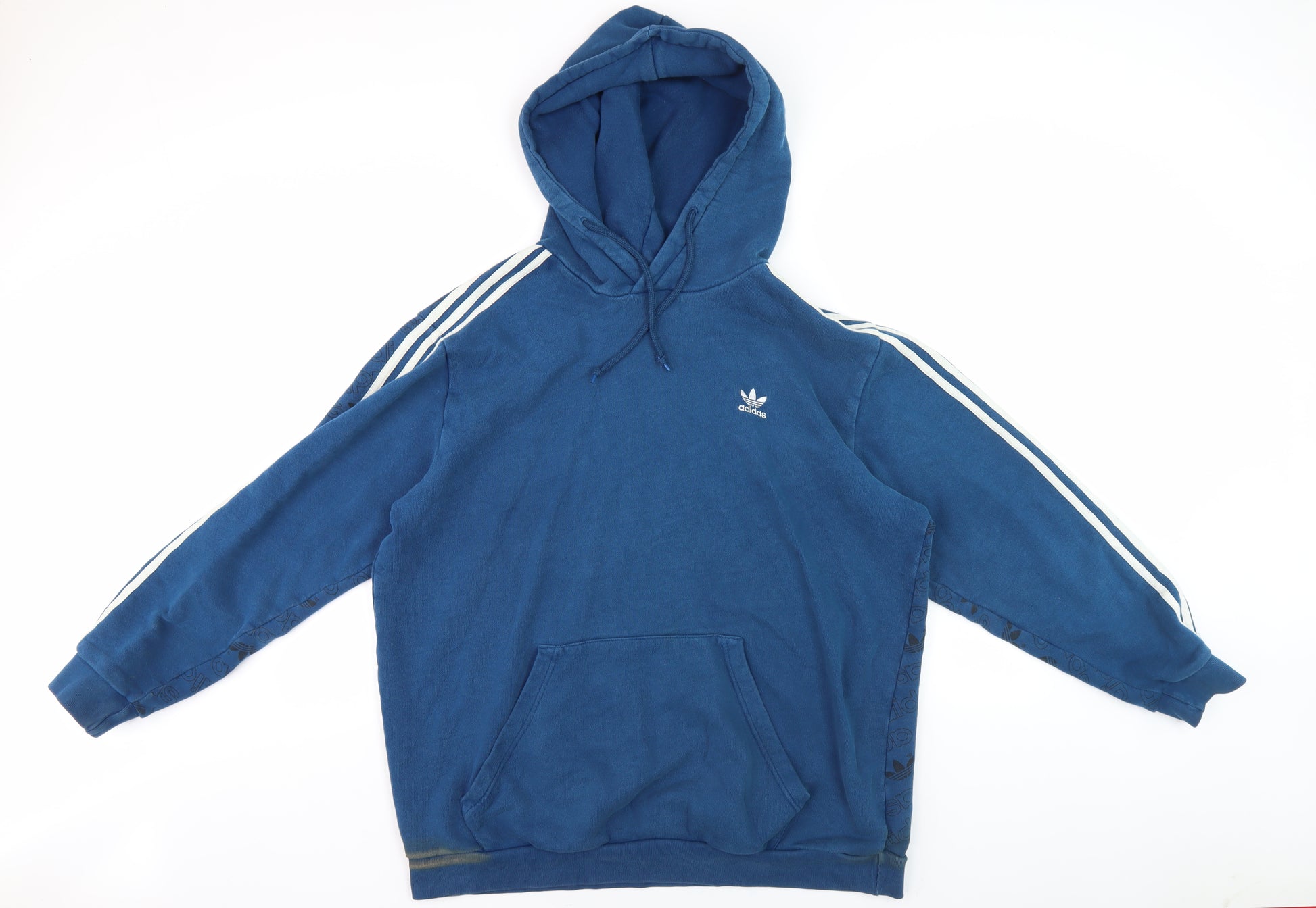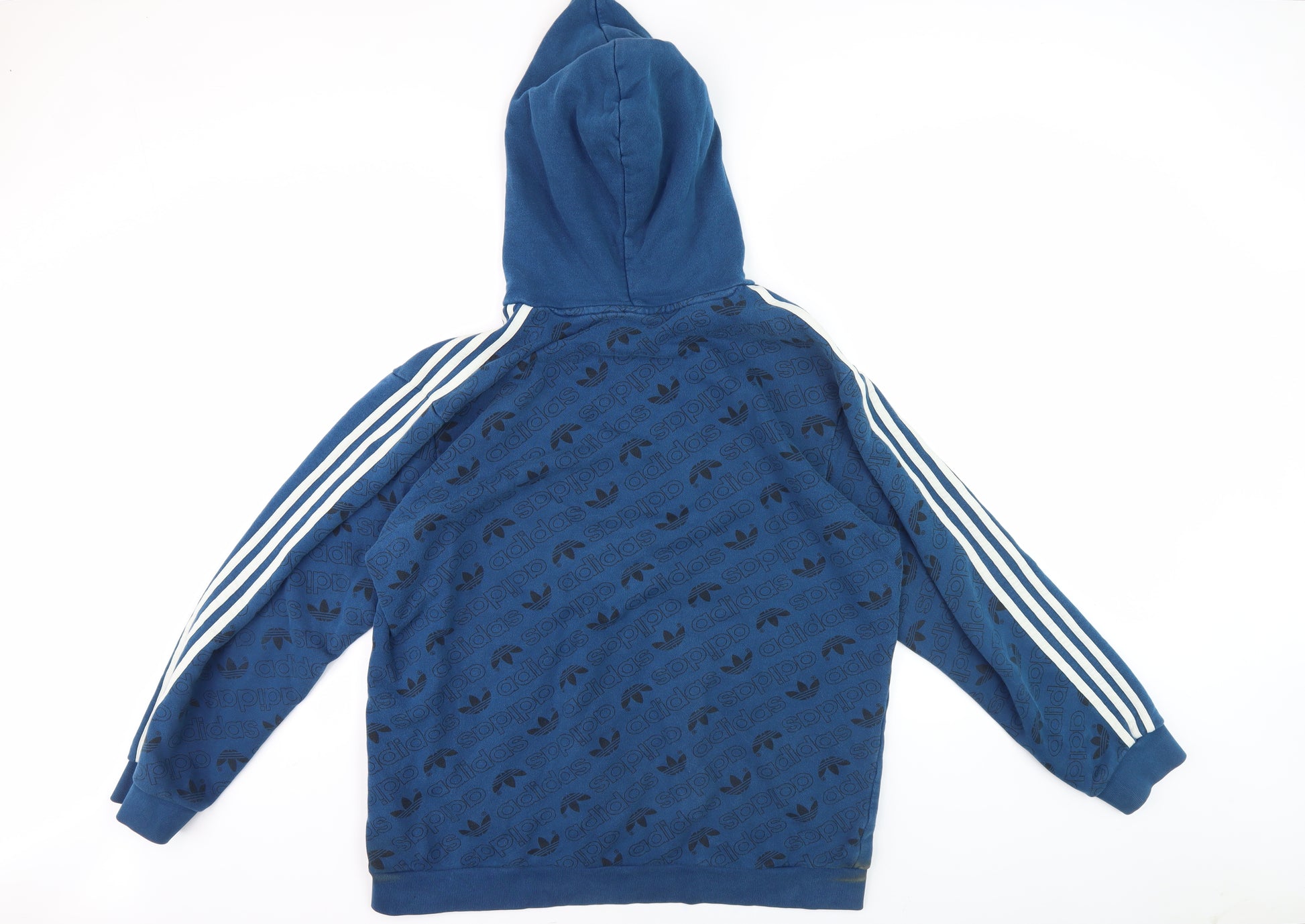 Stay comfortable and stylish with this Adidas men's blue hoodie. Designed for sports enthusiasts, this hoodie combines functionality with fashion. The pullover style and crew neck ensure a snug fit while the long sleeves provide warmth during cooler months. Accented with the iconic Adidas logo, it reflects a sporty theme that's perfect for football or gym training. Crafted from soft knit fabric, this regular-fit hoodie is both machine washable and durable for everyday wear. Though slightly worn at the cuffs, it remains in excellent condition, making it a versatile addition to your wardrobe.