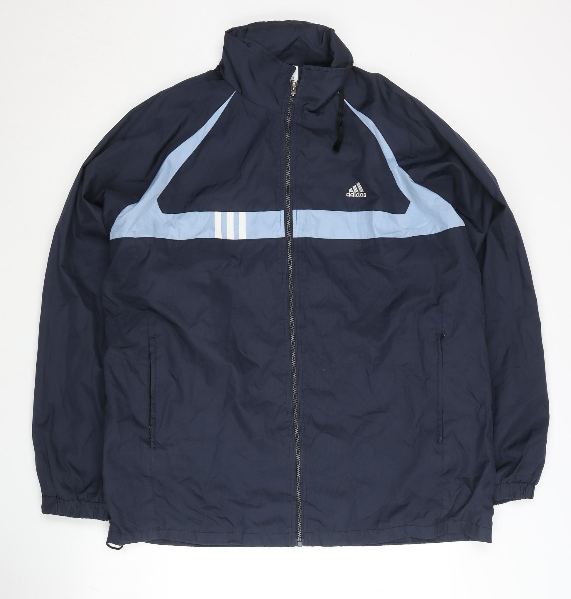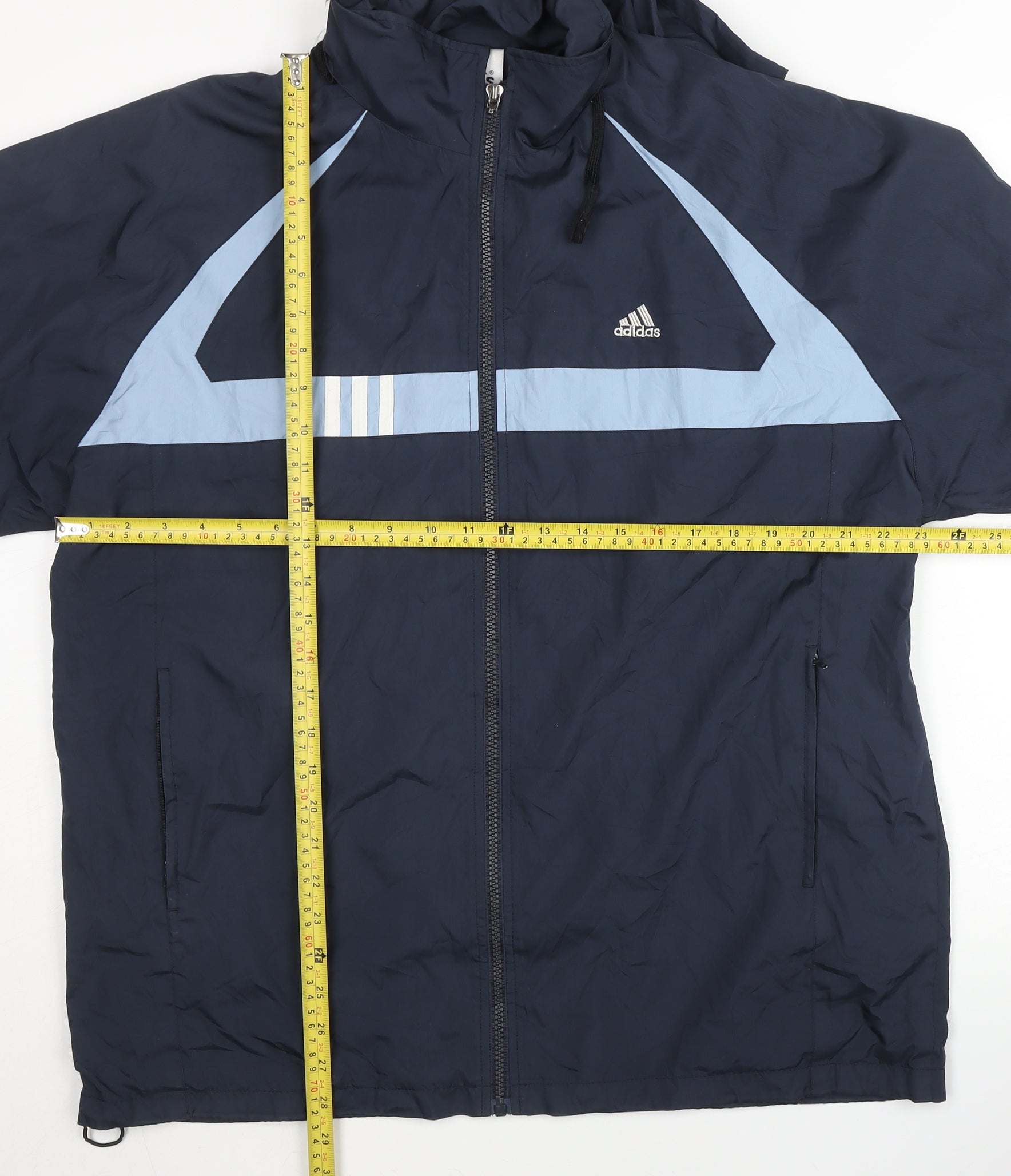 Step into your workout routine with confidence in this Adidas Men's Blue Track Jacket, tailored perfectly for comfort and performance. Designed for the active man, this jacket is an ideal companion for running, jogging, or hitting the gym. The jacket features a practical full zip closure, making it easy to adjust your warmth on those brisk morning runs. The deep blue hue is both classic and versatile, paired seamlessly with various athletic outfits.Crafted from 100% polyester in a softshell fabric, it provides resilience against harsh weather while maintaining breathability. This track jacket comes equipped with secure zipped pockets, ensuring your essentials are safely stashed away as you go about your day. Additionally, the hooded feature provides extra protection against unexpected drizzles, allowing you to continue your activities without a hitch.The jacket’s fit is regular, offering ease of movement and comfort, whether you’re lifting weights or enjoying a leisurely stroll. It's lined with polyester, ensuring a gentle feel against your skin while maintaining the jacket's lightweight attribute. Designed in a mid-length style, it delivers ample coverage without feeling cumbersome.Great for all seasons, this jacket will transition with you through diverse weather conditions, from autumn’s cool winds to spring’s milder breezes. Whether for casual wear or active outings, this versatile piece will become a staple in your wardrobe.Although it lacks original sales tags, minimal signs of wear affirm its well-preserved condition. Treat yourself to an iconic blend of style and functionality with this Adidas track jacket, priced to provide exceptional value for excellent condition.