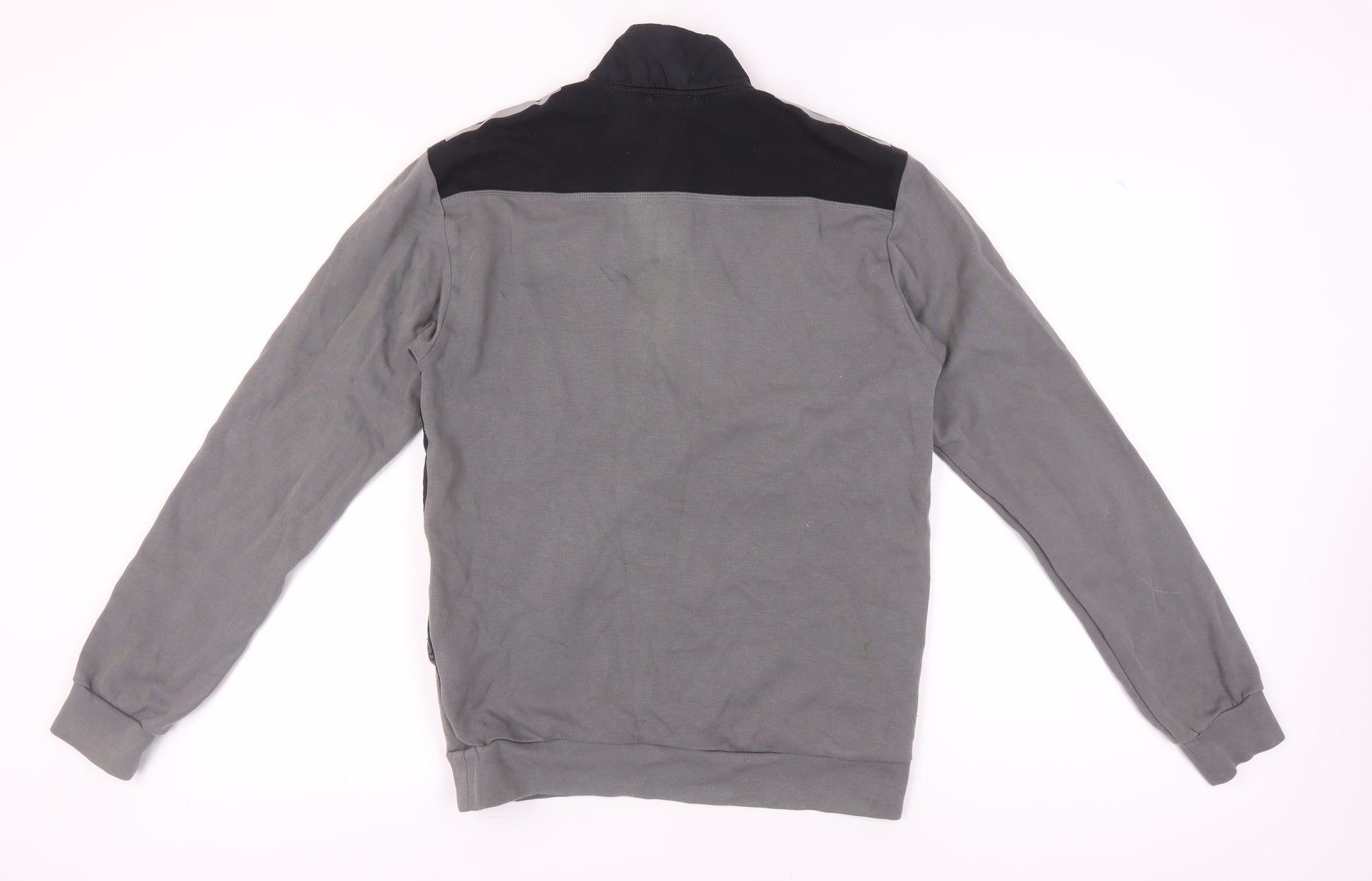 Elevate your athletic wardrobe with this Adidas Men’s 1/4 Zip Sweatshirt in a versatile grey shade. Designed for both style and function, this sweatshirt is perfect for sports enthusiasts and casual wear alike. Crafted from a comfortable blend of cotton and recycled polyester, this piece offers a regular fit with long sleeves, ensuring you stay warm and stylish during your workout sessions or leisurely activities.Featuring the iconic Adidas logo as an accent, the sweatshirt adds a touch of sports branding to your look. Its high neckline and convenient 1/4 zip closure make it easy to adjust ventilation according to your needs, while the front pockets provide practical storage for small essentials. Ideal for activities like golf and gym training, this sweatshirt is truly versatile for all seasons.Despite minor stains on the fabric, the overall condition remains good, offering durable wear for your active lifestyle. Machine washable and easy to care for, this sweatshirt is a practical addition to any men's sportswear collection.Whether for a morning jog, an afternoon on the golf course, or simply a casual day out, this Adidas sweatshirt provides the comfort and style you need.