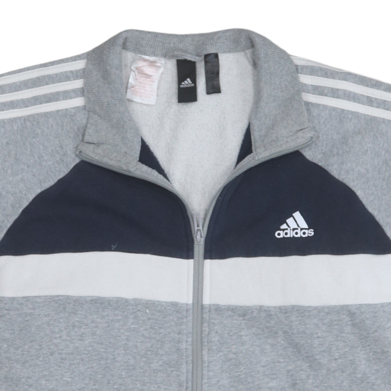 Stay active and stylish with this Adidas men’s grey and navy track jacket. Designed for everyday wear, this jacket blends classic comfort with a modern sporty edge. The full-zip front and stand-up collar provide versatile layering options, while the soft fleece fabric makes it ideal for cooler days. Constructed from a cotton and polyester blend, it’s both breathable and durable — perfect for training, running errands or casual outings. The jacket showcases Adidas’ signature three stripes along the shoulders and sleeves, with a contrasting navy chest panel and white stripe accent creating a timeless colour-block look. Designed with a regular fit, it provides unrestricted movement whether at the gym or during leisure time. The front pockets offer practical convenience, while the ribbed cuffs and hem ensure a secure fit that keeps warmth in. Ideal for gym & training, football warmups, or simply for an athleisure lifestyle, this versatile track jacket suits autumn, winter, and spring seasons alike. Finished with the classic Adidas logo for brand authenticity. In very good pre-owned condition with only minor fade and light sleeve marks noted, this jacket retains excellent wearability and appeal. Machine washable for easy care, this piece delivers classic Adidas quality. A wardrobe essential for any style-conscious active man.