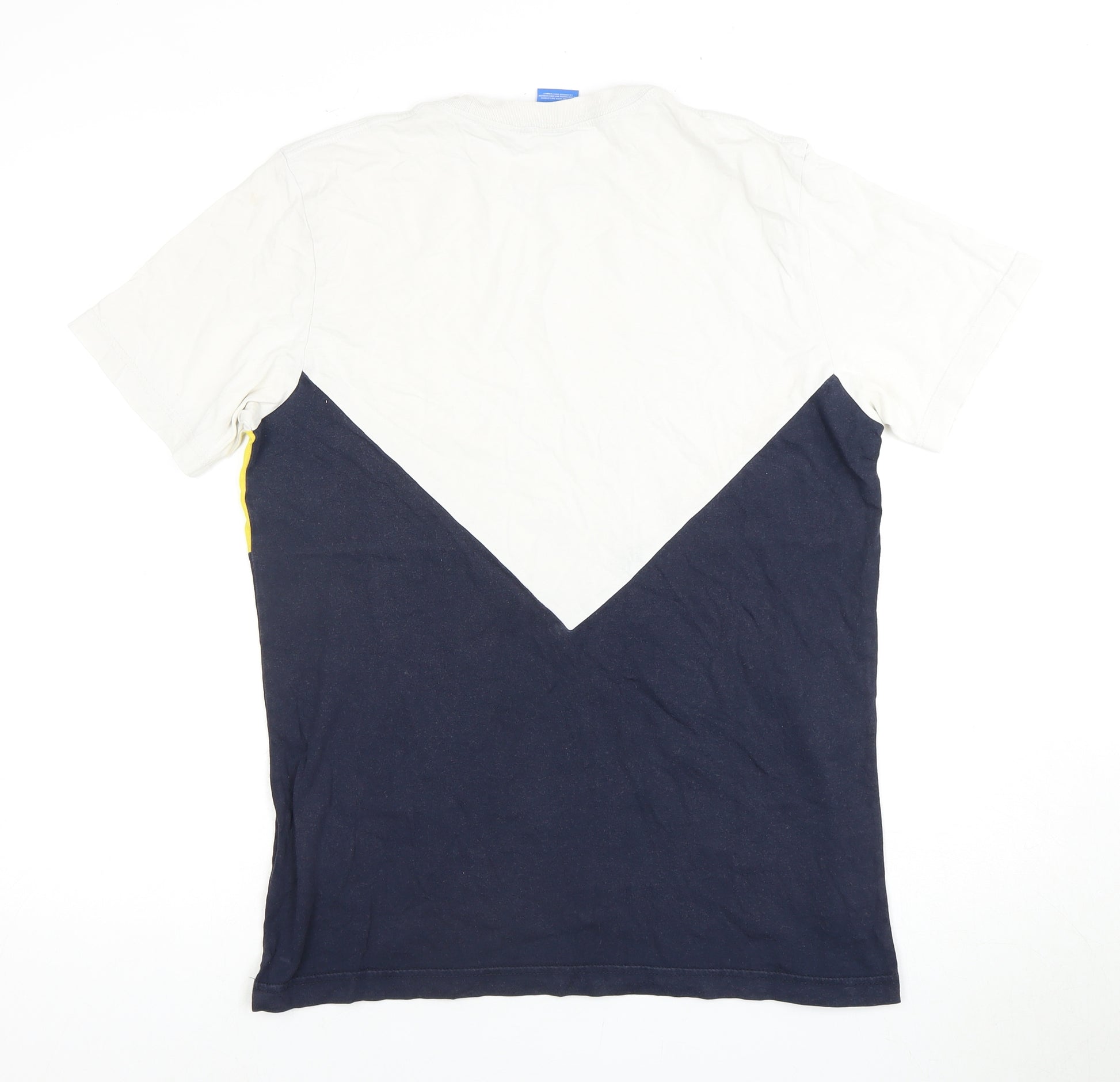 This Adidas men's T-shirt is a statement piece that combines comfort and style effortlessly. Crafted from 100% cotton, this T-shirt ensures a soft and breathable feel perfect for all-day wear. The striking colourblock pattern features a dynamic mix of multicoloured tones including white, yellow, and navy, enhanced by the iconic Adidas logo in the centre, adding a trendy touch to your casual wardrobe.Designed for the fashion-forward man, this short sleeve, crew neck T-shirt is machine washable for easy care, making it a practical yet stylish choice for everyday wear. Its versatile fit is comfortable for a wide range of body types, aligning with regular size standards for a reliable fit. Whether you're heading to a casual meetup or just relaxing at home, this T-shirt is your go-to for a relaxed, fresh look.Perfect for all seasons, this T-shirt lends itself to various styling options. Pair it with jeans for a classic look, or switch it up with shorts in warmer weather. The jersey fabric type not only promises durability but also ensures the garment holds its shape wash after wash.An excellent pre-loved piece, this T-shirt is in top-notch condition with no signs of wear, making it a unique find for Adidas enthusiasts. Elevate your wardrobe with this adaptable and stylish T-shirt that balances functionality with a dash of flair. Secure this stylish piece today and experience the blend of comfort and iconic design with Adidas.