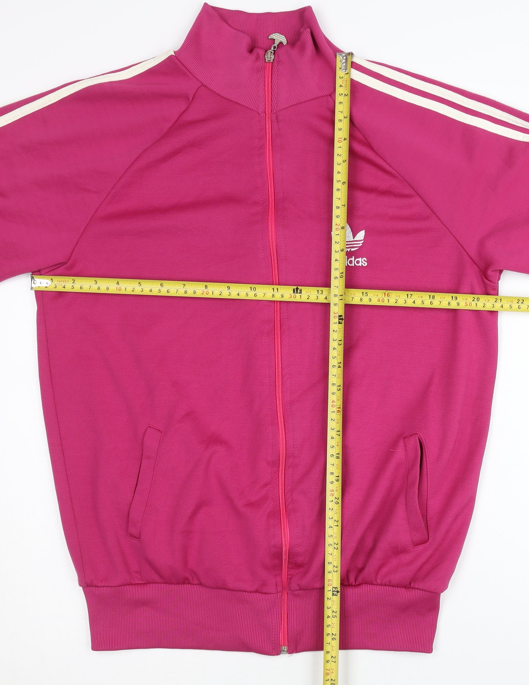 Introducing this vibrant Adidas Men's Pink Track Jacket, perfect for adding a pop of colour to your activewear collection. Designed for gym and training enthusiasts, this jacket offers a stylish blend of comfort and performance. Made from high-quality cotton with a knit fabric type, this jacket ensures breathability and longevity, making it suitable for all seasons. The full zip closure and stand-up collar provide flexibility and style, allowing you to adjust for comfort and fit during workouts or casual outings.This jacket features the iconic Adidas branding and classic stripe detailing along the sleeves, enhancing its appeal for sportswear aficionados. Its mid-length and regular fit cater to a variety of body types, offering comfort and ease of movement, essential for any fitness regime. With a sleek design and bold pink colour, this jacket is more than just functional; it's a fashion statement.Ideal for activewear occasions, this jacket supports your athletic endeavours while ensuring you look your best. Despite showing slight wear, it remains in excellent condition with no visible rips or tears, providing another layer of durability you expect from Adidas.Make a memorable impression whether you’re at the gym or on a casual day out with this eye-catching, high-performance track jacket. It's machine washable for easy care, ensuring that maintaining your style and comfort is hassle-free.