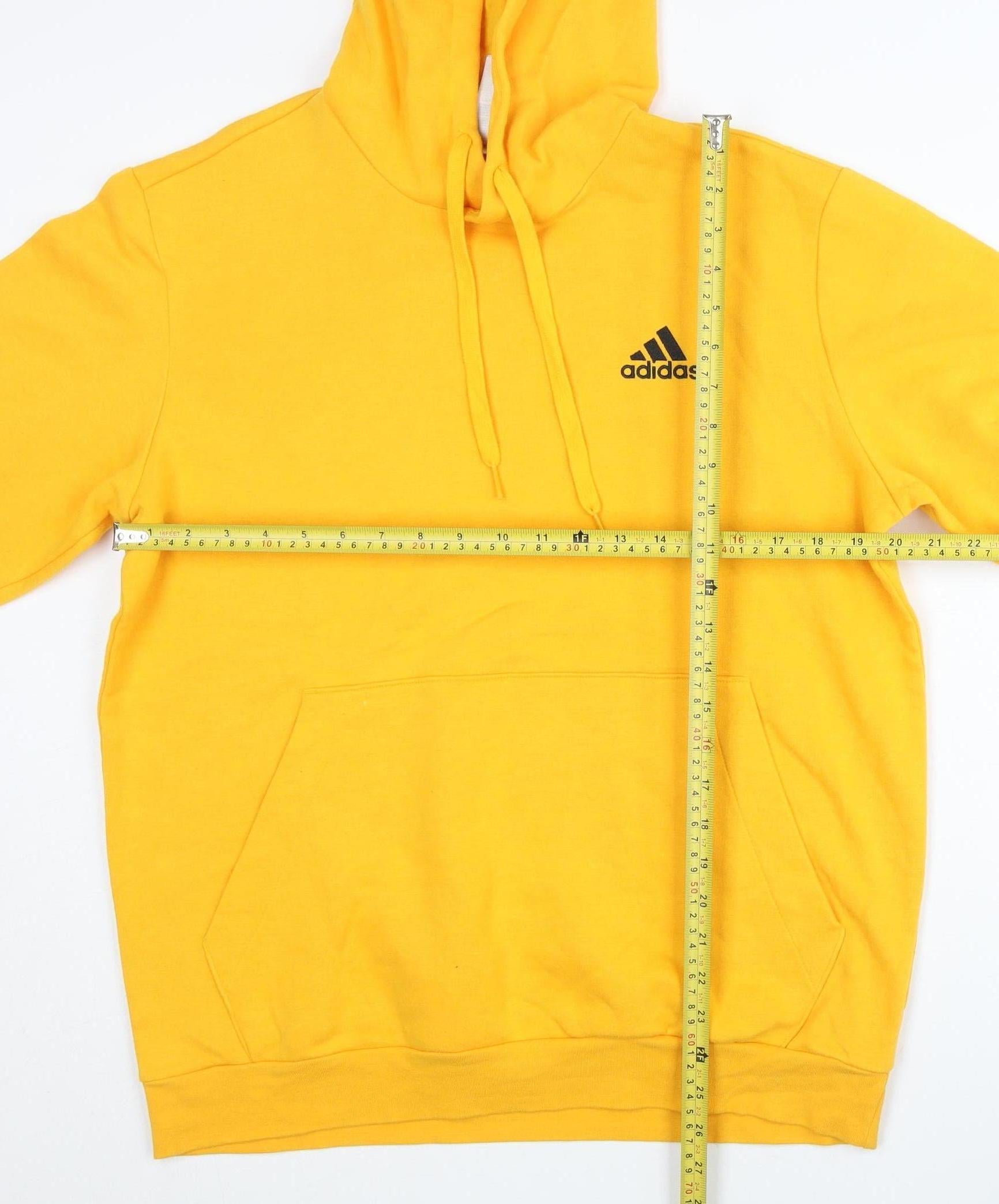 Step out in style and comfort with this vibrant yellow Adidas men's hoodie, perfect for adding a pop of colour to your casual wardrobe. Crafted from a high-quality jersey fabric blend of 70% cotton and 30% polyester, this hoodie offers a soft, breathable feel with the added durability of polyester fibres, making it ideal for all seasons. Featuring a pullover design with a drawstring-adjustable hood, it delivers both practicality and streetwear appeal, effortlessly blending fashion with function.The front showcases the iconic Adidas logo in black, giving it a sporty edge that is instantly recognisable. The spacious kangaroo pocket adds functionality, perfect for keeping your hands warm or storing essentials while on the move. Designed for a regular fit, this hoodie provides a relaxed yet flattering silhouette, making it a versatile choice for a wide range of casual occasions. The long sleeves and ribbed cuffs help retain warmth on cooler days, while the breathable cotton material ensures comfort during milder weather.In a striking yellow hue, this hoodie offers a bold statement piece that pairs easily with jeans, joggers, or shorts, making it a wardrobe staple for men who value both comfort and standout style. Whether you're heading to the gym, lounging at home, or meeting friends, this hoodie is the perfect choice for effortless everyday wear.Machine washable for easy care, this Adidas hoodie is in excellent pre-owned condition with only slight signs of wear and no major flaws. Its blend of practicality, style, and brand heritage makes it a great investment for those seeking a reliable and fashionable hoodie that can be worn all year round.Elevate your casualwear with this timeless Adidas essential and enjoy a blend of comfort, iconic branding, and bold colour that won’t go unnoticed.
