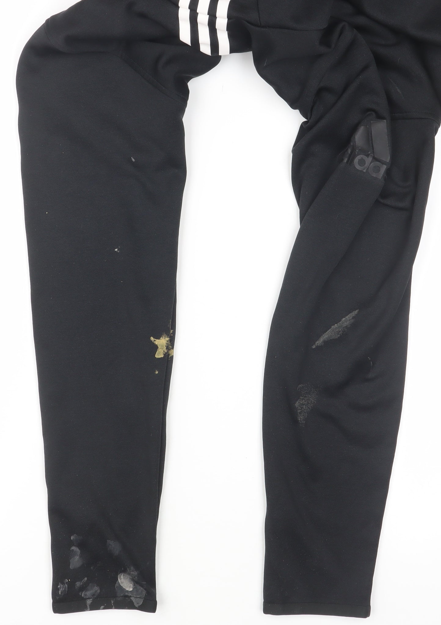 Discover comfort and style with this Adidas black track jacket, designed for unisex adults. Made from 100% polyester, this jacket offers a regular fit, perfect for running and jogging activities. Featuring a practical hood and zipped pockets, it ensures you stay protected against unpredictable weather while keeping your essentials secure. The mid-length design with a zip closure provides ease of wear, complemented by its robust jersey fabric that promises durability. Ideal for activewear and suitable for all seasons, it caters to fitness enthusiasts looking for functionality and versatility. Despite visible stains on the sleeves, it remains in good condition, ready to serve you in everyday adventures. Machine washable for easy care, this piece balances utility with the iconic style of Adidas, making it a valuable addition to your athletic wardrobe.