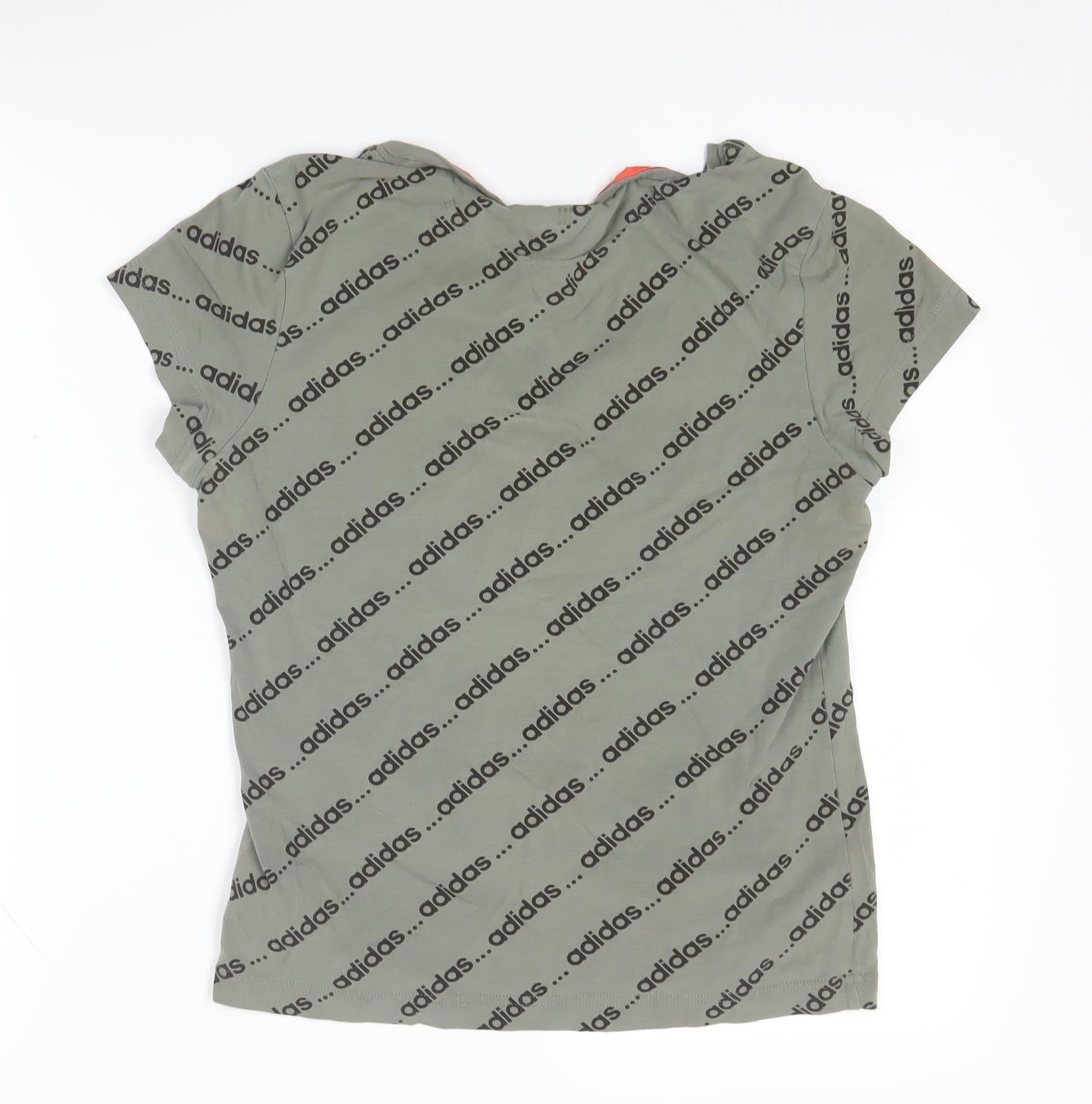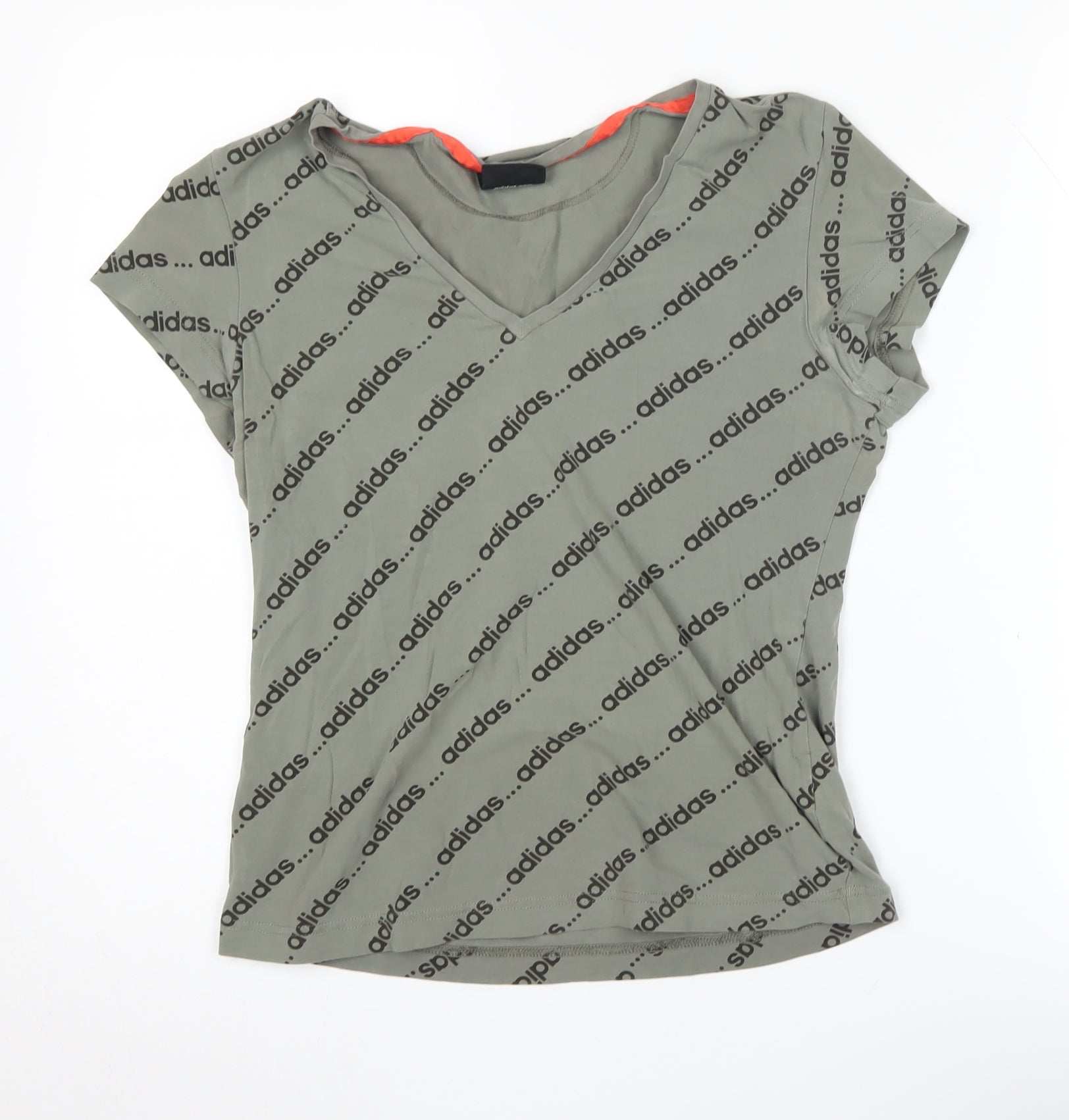 Elevate your casual wardrobe with this stylish Adidas Women's T-Shirt in a versatile green shade. Designed for the modern woman, this basic V-neck tee features a comfortable short sleeve and is crafted from a soft jersey fabric made of 95% cotton and 5% elastane, ensuring both softness and flexibility. Perfect for summer days, this t-shirt is a great addition to your casual collection. With a classic fitted sleeve and a solid pattern adorned with the iconic Adidas branding, this pullover tee offers both comfort and a touch of sporty elegance. The machine-washable fabric makes it easy to care for, while the absence of additional accents keeps it elegantly simple. Although in very good condition, there's a small hole near the seam that does not detract from the overall charm and wearability of the piece. Ideal for casual outings, this t-shirt is perfect for relaxed weekends, running errands, or a day at the park. Add a dash of sporty charm to your outfit with this must-have piece from Adidas.