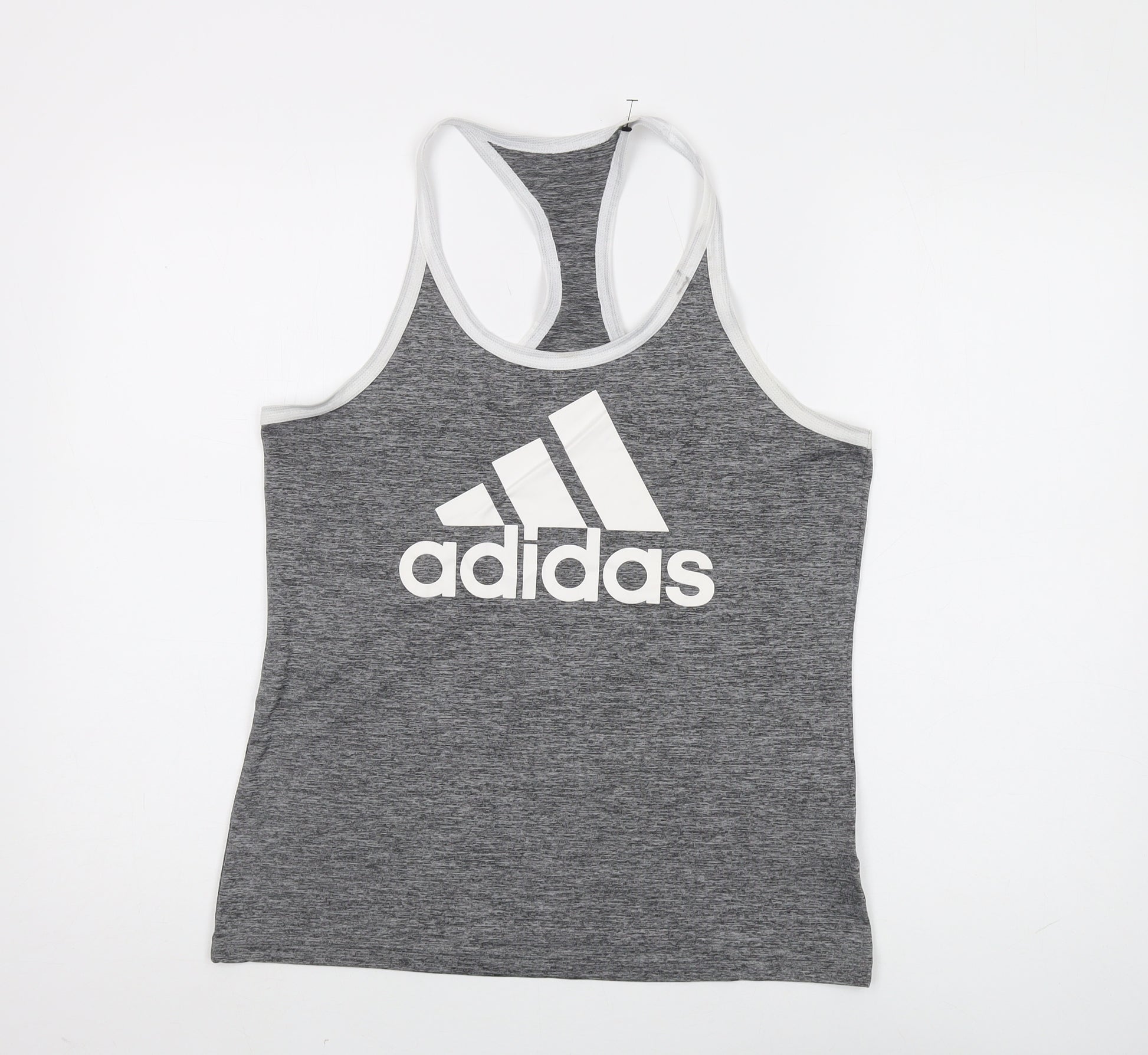 Elevate your athletic wardrobe with this Adidas women's tank top, a perfect blend of style and functionality. Designed for the active woman, this grey tank top is crafted from 100% polyester, offering a breathable and moisture-wicking experience, ideal for gym and training sessions. The regular fit and scoop neckline provide comfort and ease of movement, while the racerback strap type ensures a secure and supportive fit. With its classic and basic style, this sleeveless top is machine washable, adding convenience to its array of features. Suitable for all seasons, this top is perfect for those who demand both performance and style in their activewear. Excellent condition, with slight wear, it’s ready to complement any fitness routine at a fantastic price.