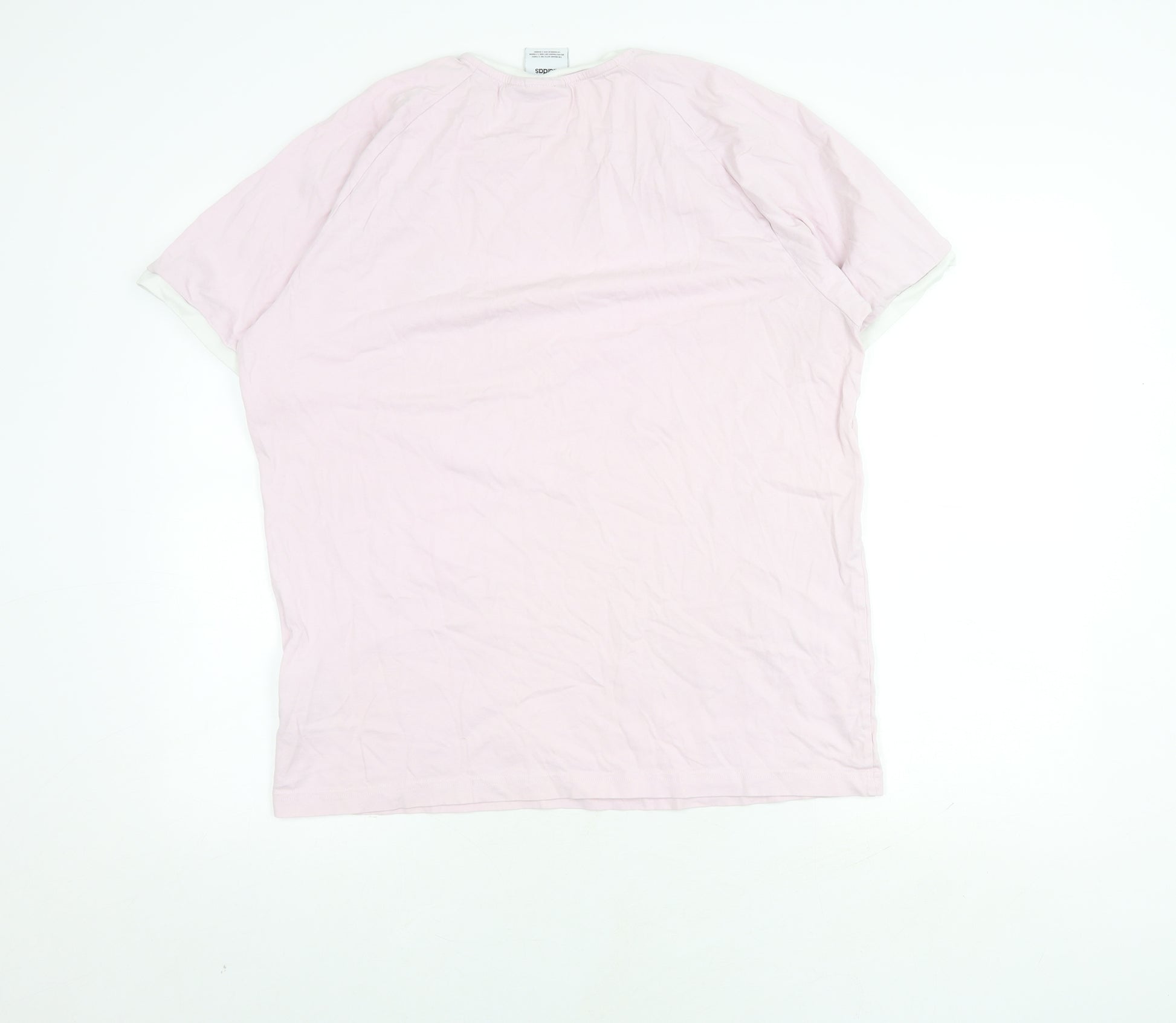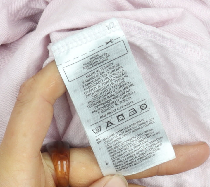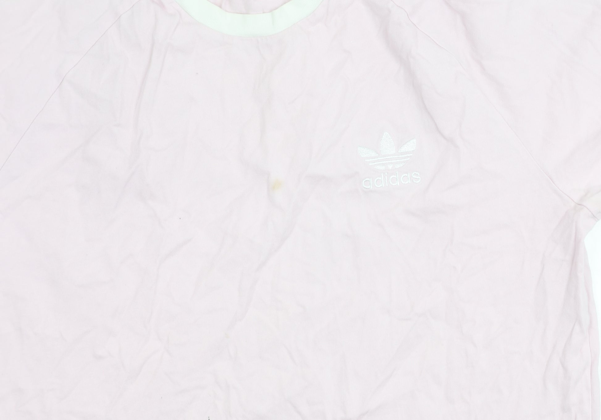 Step up your casual wardrobe with this stylish Adidas Women's Pink Ringer T-Shirt. Designed for comfort and style, this T-shirt is perfect for those warm spring and summer days. Made from a breathable jersey fabric, the T-shirt boasts a blend of 92% Cotton and 8% Elastane, offering a soft touch and a flexible fit that complements your body shape effortlessly. The short raglan sleeves provide added comfort, while the crew neckline adds to the classic look that never goes out of style.This pink T-shirt features the iconic embroidered Adidas logo on the chest, lending a touch of sporty elegance to your casual ensemble. The solid pattern and the ringer design enhance its classic aesthetic, ensuring you stay in style whether you're out for a casual stroll or hanging out with friends. Although the T-shirt is in good condition, please note a light stain on the front, which is a minor imperfection in this otherwise fantastic garment.It's an excellent choice for those who appreciate both timeless style and brand reliability. The regular fit and breathable qualities make it ideal for casual, everyday wear, and the pullover closure ensures ease of wear. Equip your wardrobe with this Adidas essential and experience a blend of style, comfort, and quality in one garment.