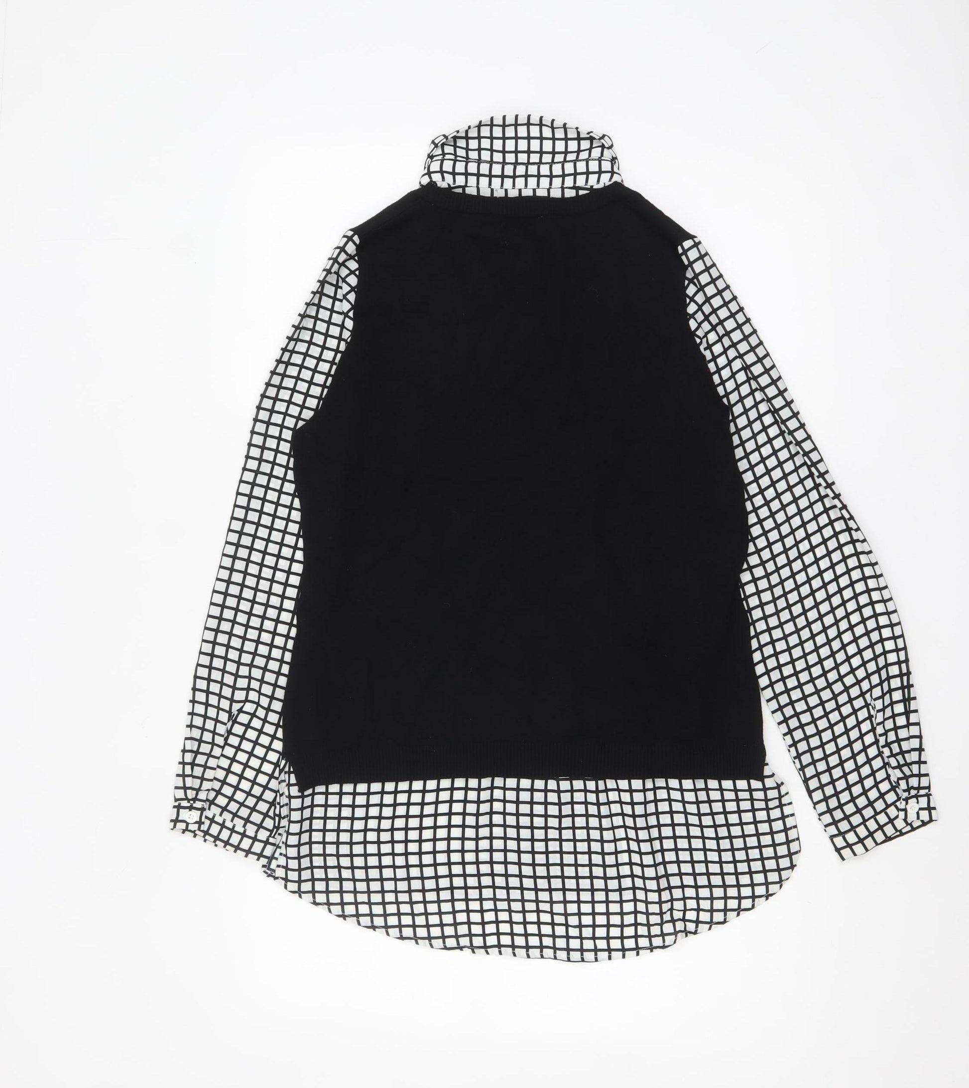 This Adrianna Papell layered blouse beautifully combines modern style with timeless elegance. Designed for women who appreciate polished, versatile fashion, it features a chic monochrome check pattern that delivers a sophisticated statement suitable for workwear or smart-casual occasions. The shirt’s innovative layered design creates a faux two-piece look, with a soft black knit overlay paired with a classic collared check blouse detail underneath. This thoughtful detail gives the appearance of effortless layering without the added bulk, making it both stylish and comfortable.Constructed from a blend of premium viscose, nylon, and polyester, the fabric feels lightweight and breathable while maintaining a flattering drape. The collared neckline adds a professional touch, while the long fitted sleeves finish with buttoned cuffs for a smart silhouette. The regular fit ensures comfort and ease of movement, making this an ideal piece for all-day wear. Suitable for autumn and spring seasons, this top can easily be worn under a blazer for a business-ready look or paired with jeans for a relaxed, weekend vibe.In excellent condition, this blouse shows minimal signs of previous wear, retaining its shape and crisp pattern throughout. Its refined design speaks to Adrianna Papell’s signature style—sophisticated, modern, and wearable. A timeless wardrobe staple that blends the formality of a button-up with the comfort of a knitwear layer, this piece transitions seamlessly from desk to dinner with the right accessories. Perfect for women seeking a balance of contemporary fashion and classic charm. A great addition to any wardrobe, this blouse will quickly become a go-to favourite for work and beyond.