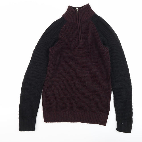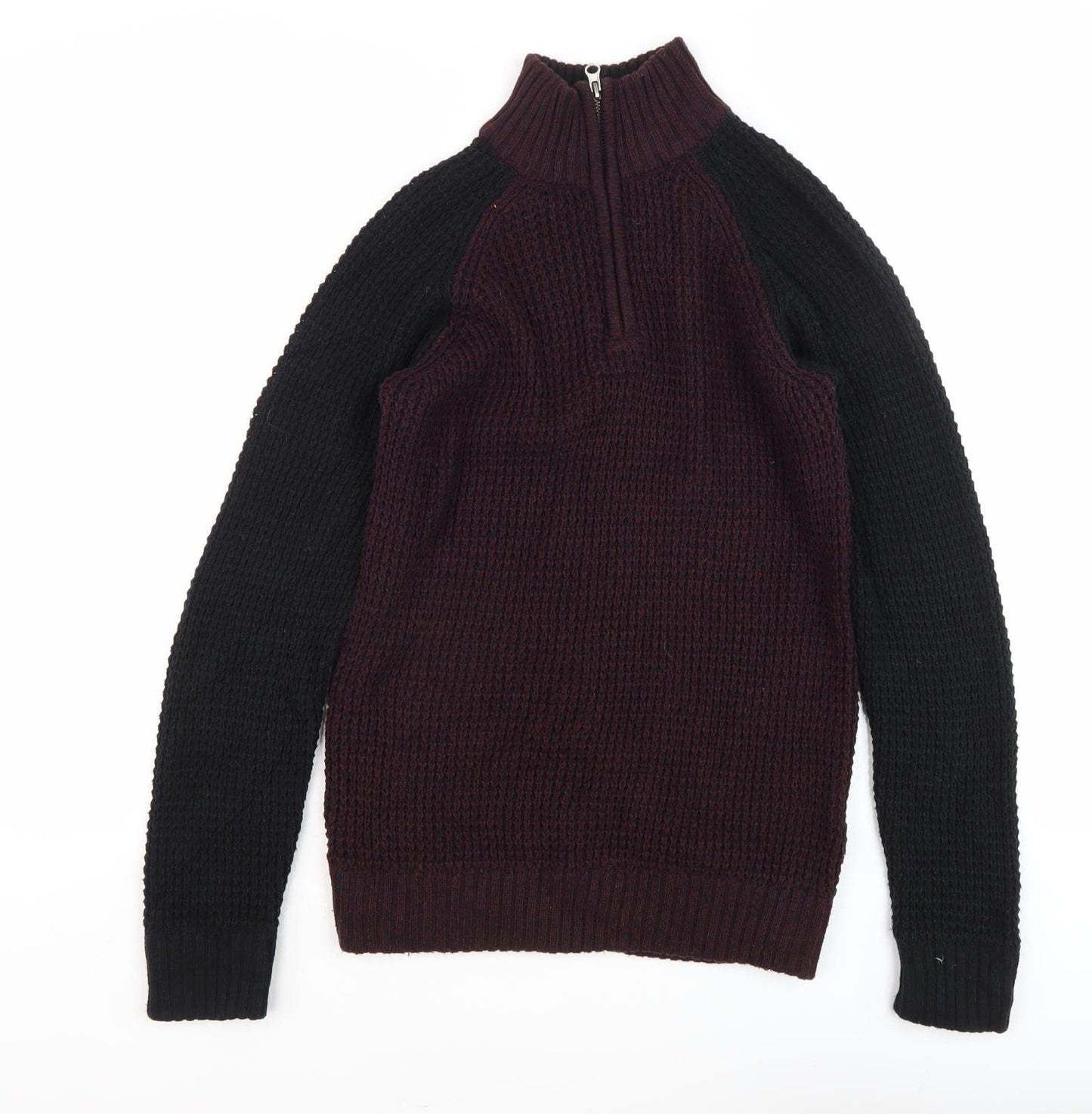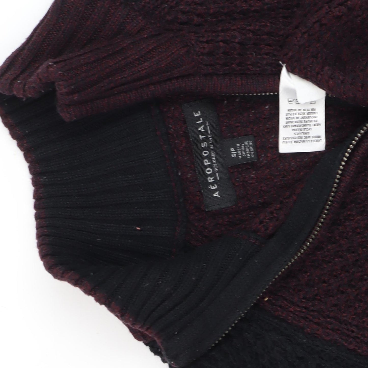 Step into style with this Aéropostale full zip men's jumper, perfect for the autumn and winter seasons. Elegantly crafted from a durable polyester and wool blend, this chunky-knit sweater provides both warmth and comfort. Sized as 'S', it's a versatile addition to any wardrobe, designed with a high neckline that compliments its casual, yet sophisticated aesthetic. In classic black and rich burgundy, this piece effortlessly combines fashion and functionality. The full zip feature allows for easy wear, while the long sleeves ensure you stay cosy. Whether you're dressing for a casual day out or a relaxed evening indoors, this jumper is your go-to choice. Machine washable for convenience, it’s in excellent condition with only minor wear, making it a reliable staple for the modern man.