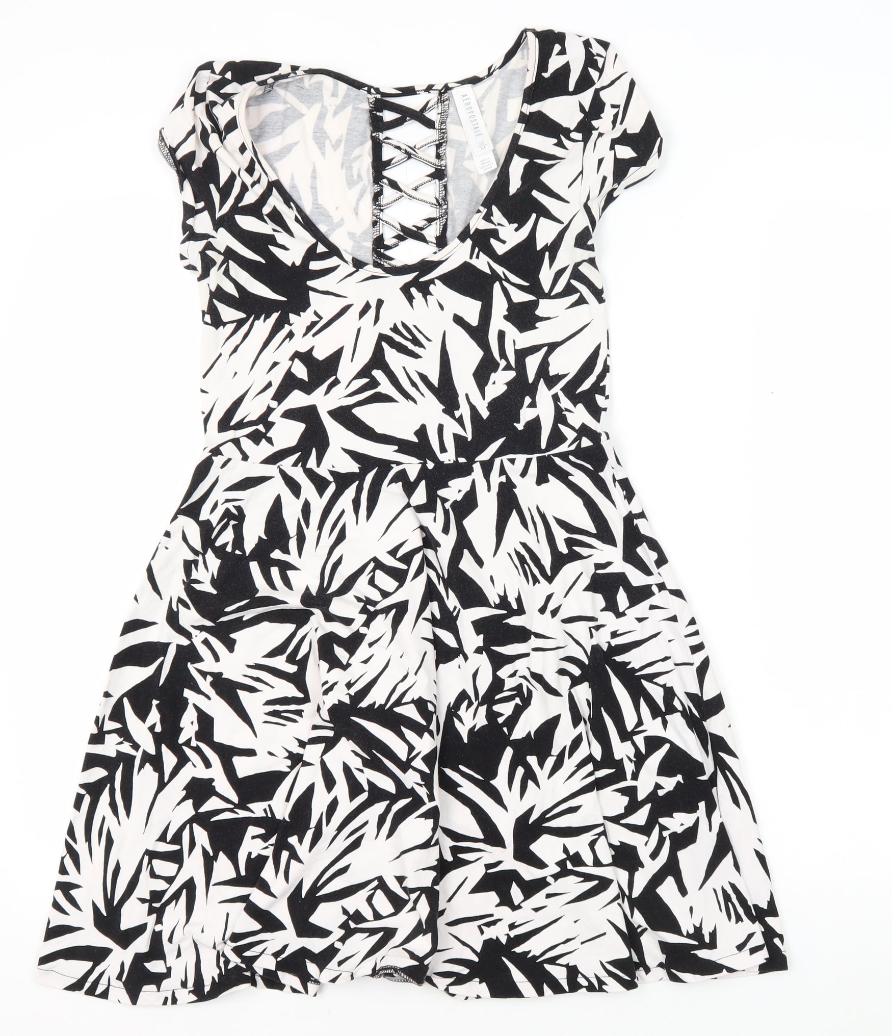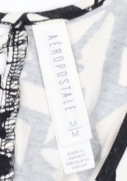 Embrace a bold and contemporary style with this Aeropostale Women's Dress in a striking black and white geometric pattern. The dress features short sleeves and a classic round neckline, providing a timeless look perfect for everyday wear or casual occasions. Crafted from a comfortable jersey fabric, this dress is a blend of cotton and elastane, ensuring a soft feel and a slight stretch to fit your body comfortably. Its lace-up detail at the back adds an extra touch of uniqueness to the overall design, making it a standout piece in any wardrobe. Suitable for autumn and spring, it's the ideal choice for transitioning between seasons. Lightly used, it is in excellent condition with no visible damage. This medium-sized dress is a great pick for women who appreciate a mix of comfort and style. Perfect for casual outings or pairing with your favourite accessories for a statement look, this dress is both versatile and chic. Don't miss your chance to own a dress that combines functionality with fashion-forward design. Add this unique piece to your collection today.