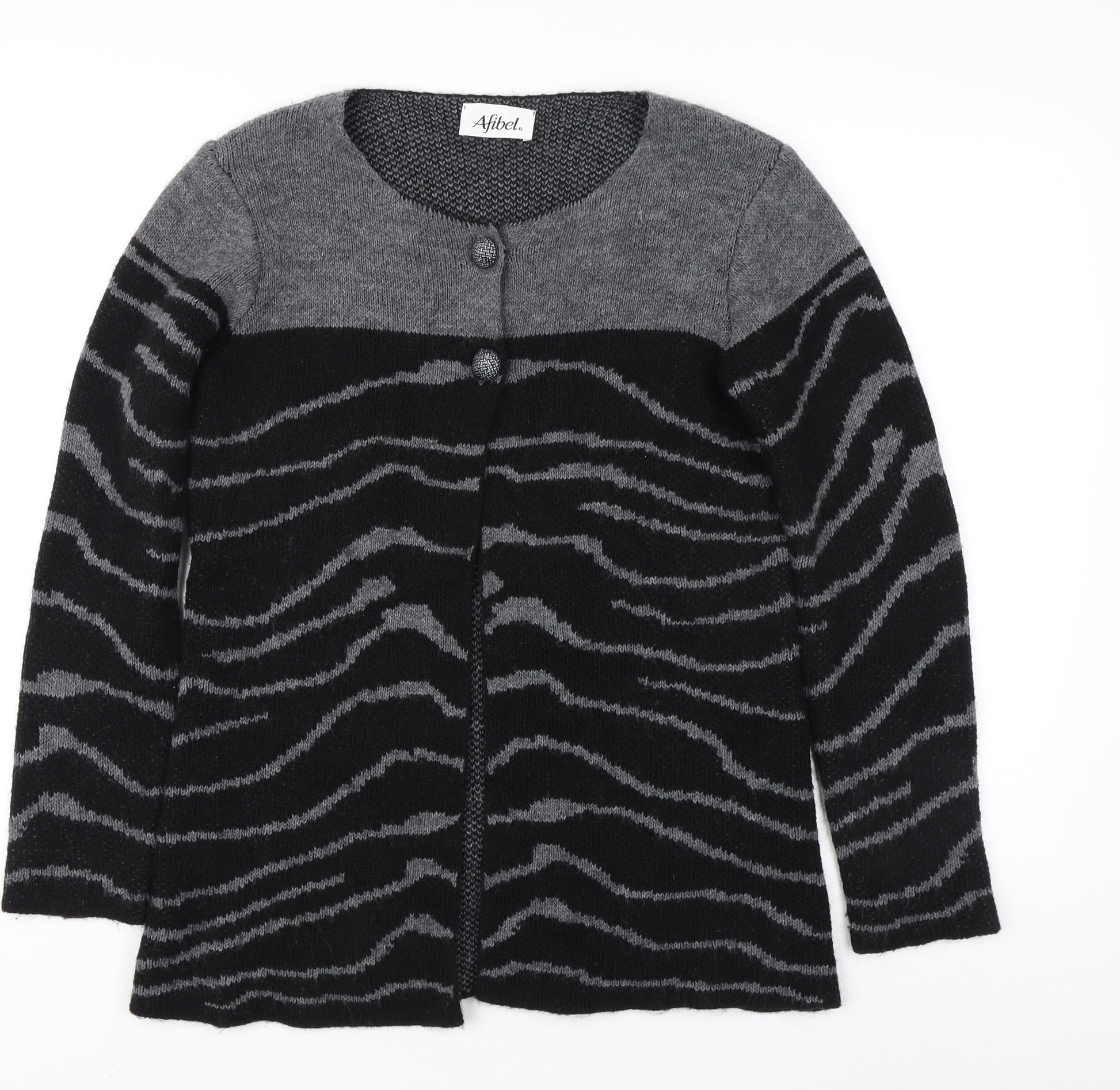Chic and versatile, this Afibel Women's Cardigan in stylish grey and black is a wardrobe essential. Crafted from a comfortable blend of acrylic, wool, viscose, and alpaca, it provides a perfect combination of warmth and softness. The round neckline complements the long sleeves, making it ideal for layering over your favourite tops. With its eye-catching animal print, this cardigan adds a touch of elegant wildness to any outfit. Accented with classic button details, it offers a simple yet sophisticated closure. Ideal for casual days or dressier occasions, this cardigan adapts seamlessly to your needs. Suitable for UK size 6/S, it provides a flattering fit for a variety of body types. Gently used and in excellent condition, it promises to deliver enduring style and comfort. Upgrade your knitwear collection with this chic piece, perfect for enhancing both casual and semi-formal looks.