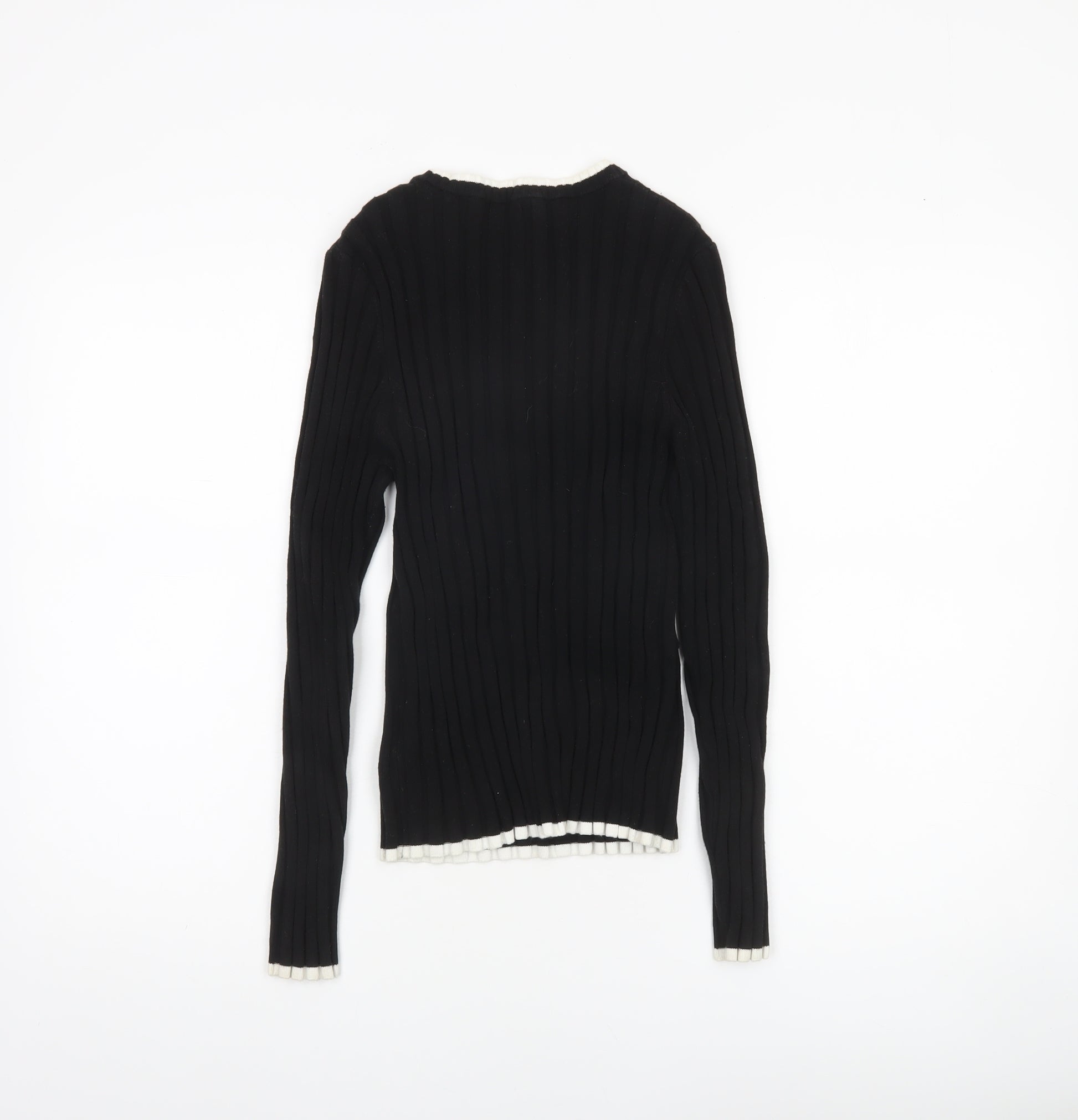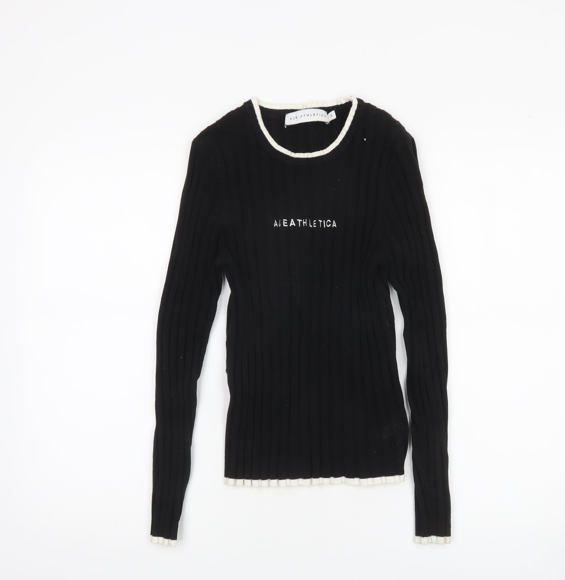 Elevate your casual wardrobe with this sleek and modern black jumper from Aje Athletica, crafted for comfort, movement, and minimalist style. Designed for the modern woman, this slim-fit knit pullover is both flattering and versatile, making it a perfect piece for layering or wearing on its own. The jumper features a classic crew neckline trimmed in contrasting white, adding a stylish edge to a timeless design. Made from a premium blend of viscose, cotton, and elastane, it combines the breathability of natural fibres with a gentle stretch that enhances everyday comfort and ensures a flattering silhouette. The ribbed knit texture adds depth and a refined feel while maintaining a lightweight and flexible wear—ideal for the transition between seasons or as a chic winter layering staple. The subtle AJE ATHLETICA logo across the chest lends a designer touch without overpowering the minimalist aesthetic. Designed for comfort, this jumper is suitable for year-round wear, pairing effortlessly with jeans for casual outings or with tailored trousers for a smart, relaxed look. Experience the soft hand feel and durable finish of quality knitwear that retains its shape while keeping you comfortably warm. Whether you’re heading out for a weekend brunch, a light workout, or travelling in style, this piece is easy to care for and wear, ensuring it remains a wardrobe essential for seasons to come. With a luxurious feel and understated design, this jumper brings practical elegance to modern casualwear. In excellent pre-loved condition with only minimal signs of wear, it’s ready to join your wardrobe at a great value compared to new retail prices. Perfect for women who appreciate understated luxury and effortless style.