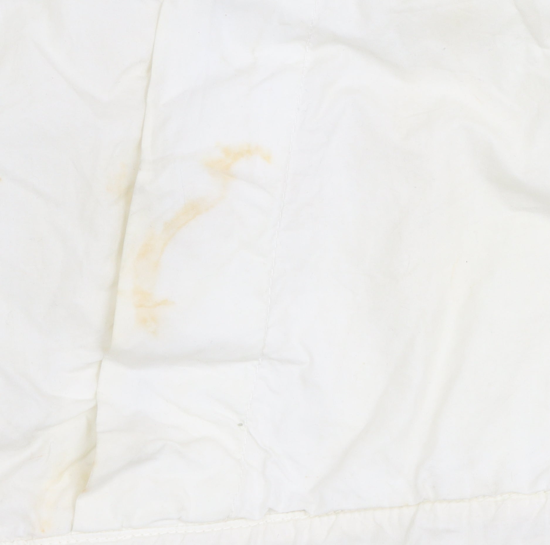 Introducing the versatile Albam Men's White Windbreaker Jacket, a stylish and functional piece perfect for easy layering in mild weather. This lightweight jacket is made from 100% cotton, ensuring breathability and comfort throughout the day. Designed for the modern man, it sports a clean, no-pattern look, ideal for casual occasions. The mid-length cut provides just enough coverage, whether you're out for a walk or hiking. Additional features like a hood and zipped pockets add practicality, enabling you to carry essentials securely. Despite showing some light stains, the jacket remains in good condition, offering a blend of fashion and function. Enjoy style and protection with this Albam classic.