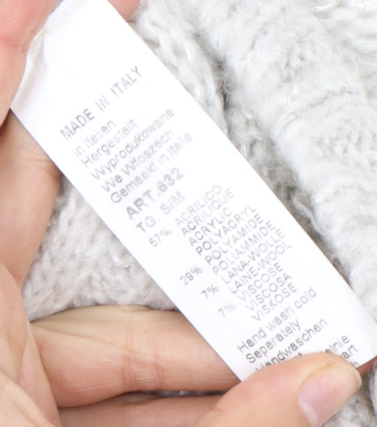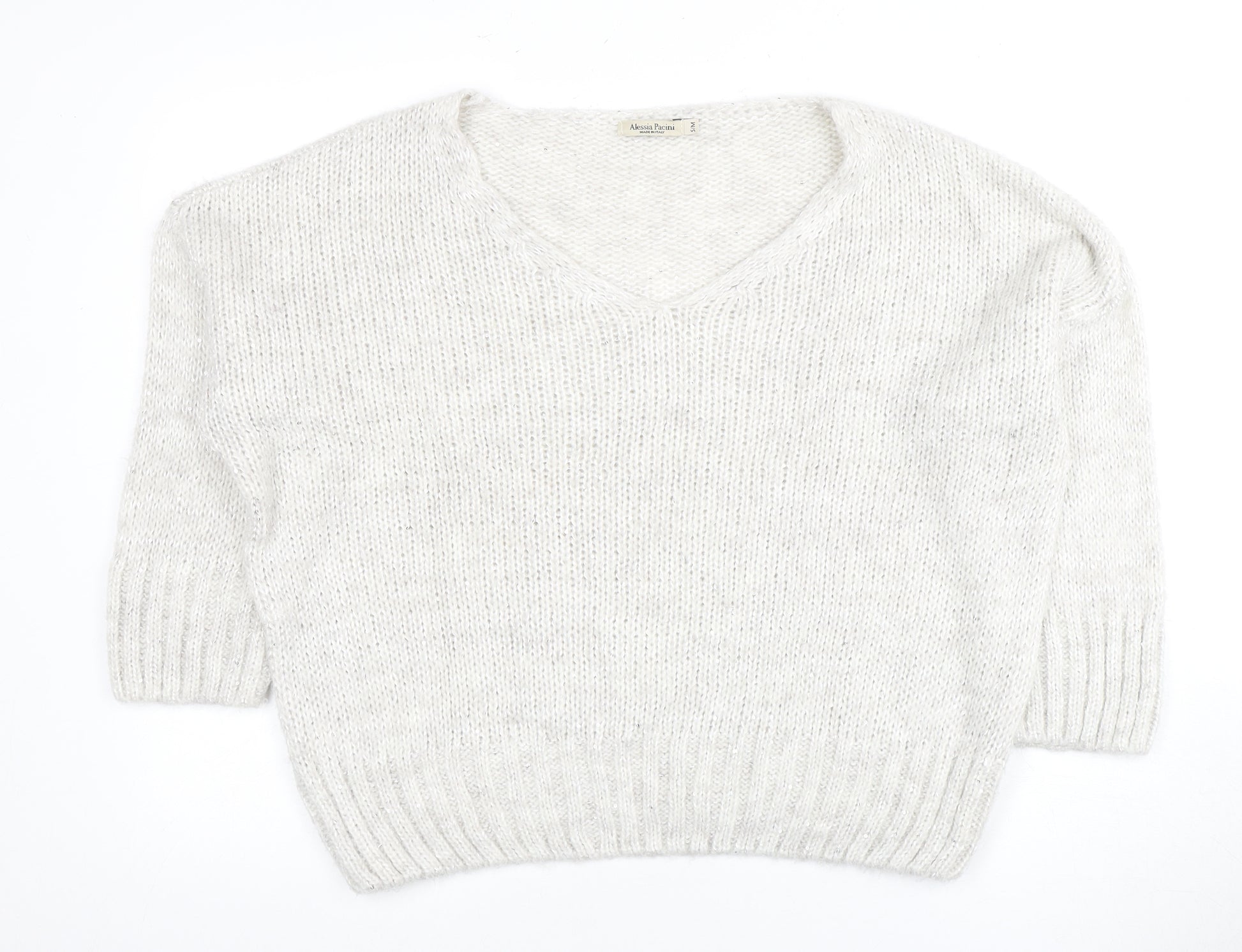 Embrace elegance with the Alessia Pacini Women's Knit Pullover Jumper in a soft ivory hue, perfect for both autumn and winter wear. This jumper features a sophisticated V-neckline and 3/4 sleeves, ensuring a relaxed yet stylish look suitable for any casual occasion. Crafted in Italy, it blends 57% acrylic, 29% wool, and 7% viscose, providing warmth and comfort with a lightweight feel. The chunky-knit fabric adds texture, while its classic pullover style ensures a timeless appeal. Ideal for pairing with jeans or skirts, this regular fit jumper promises to complement various outfits seamlessly. Its hand wash care ensures durability and maintains its pristine condition. Despite being pre-loved, it remains in excellent condition with no visible defects, making it a prized addition to your wardrobe.