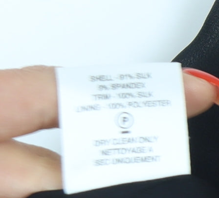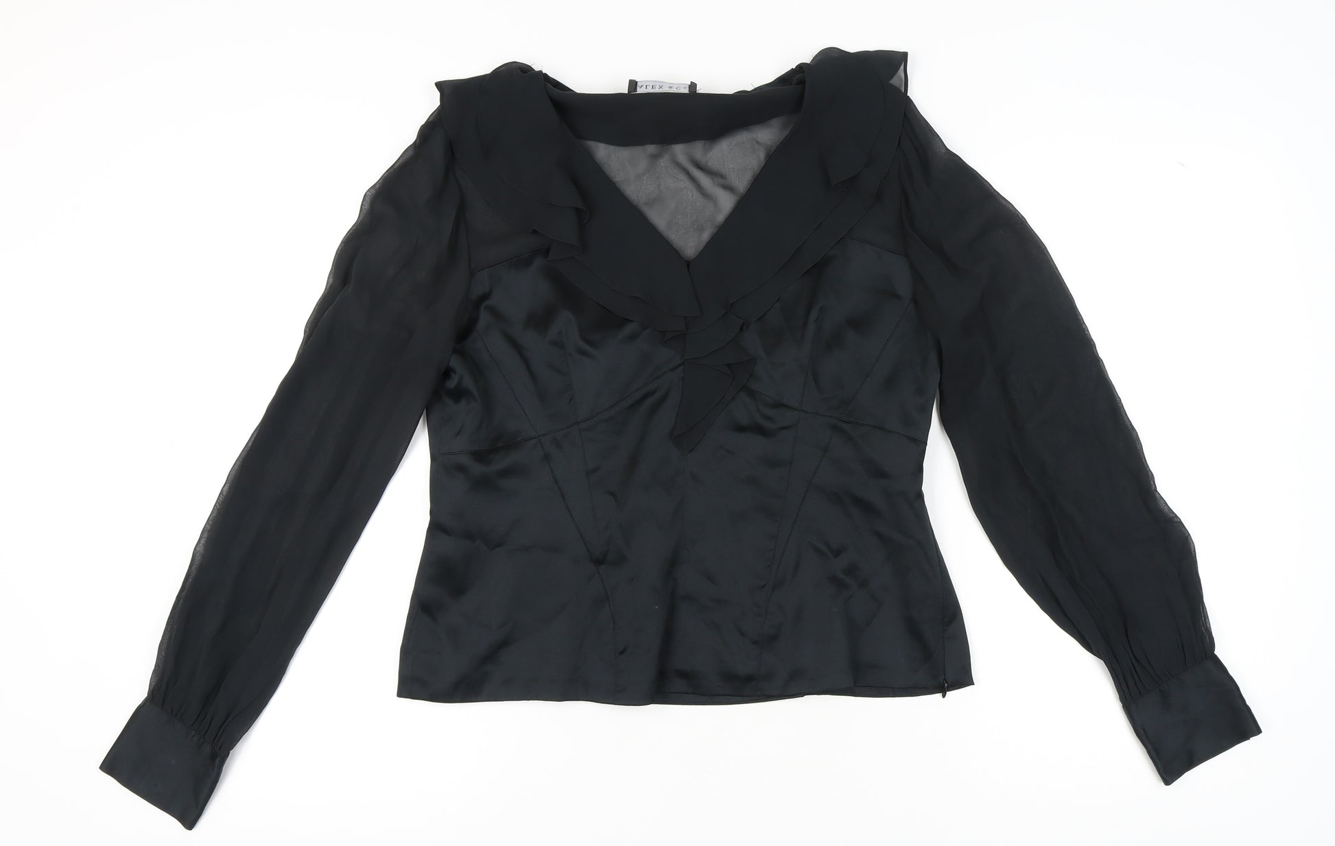 Elevate your formal wardrobe with this elegant Alex & Co. blouse, crafted in a luxurious black silk blend with a touch of elastane for added comfort. This women's blouse features a sophisticated V-neckline and delicate ruffle accents, exuding a timeless charm perfect for formal occasions. The classic long sleeves and fitted silhouette offer a flattering and graceful look, making it a stylish choice for any evening event. Designed in a solid black colour, it easily pairs with various bottoms, from tailored trousers to sleek skirts. The blouse is lined to ensure a smooth fit and features a convenient side zip closure. It's crafted for the modern woman who appreciates a blend of quality materials and chic design. Although displaying minor wear on the fabric, it's in excellent condition, promising style and elegance with every wear.