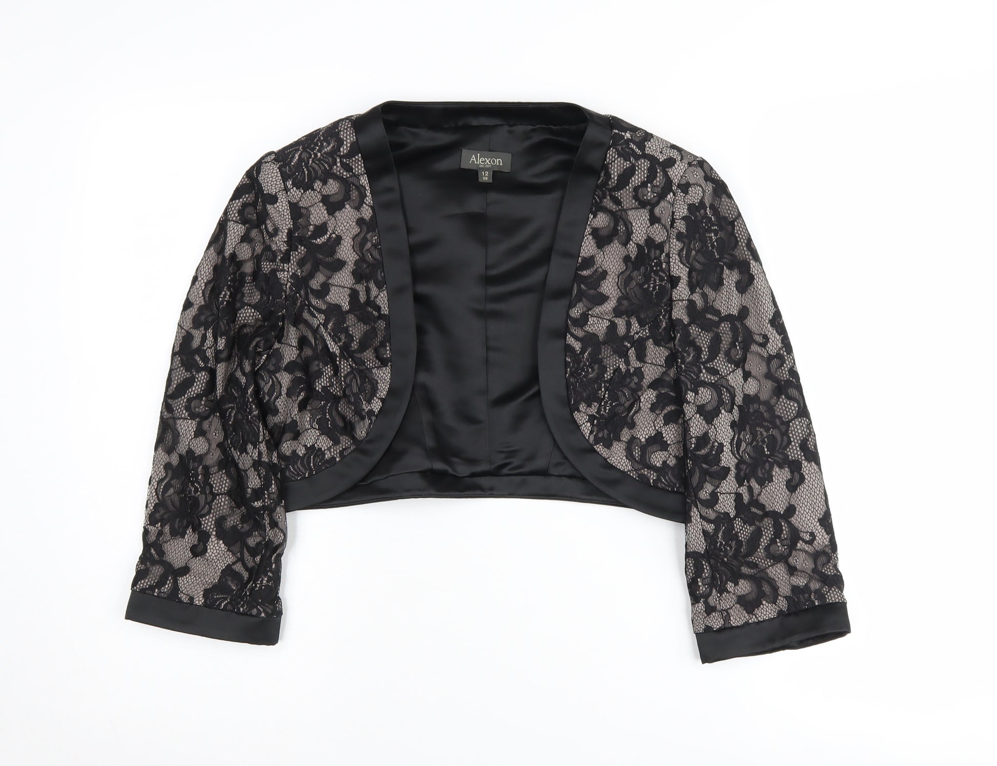 Elevate your wardrobe with this exquisite Alexon women's black lace shrug in a size 12. This elegant piece offers a sophisticated touch with its delicate lace design, perfect for adding a layer of style to any outfit. The shrug features a classic silhouette with comfortable 3/4 sleeves, making it an ideal choice for both formal and casual occasions. Crafted from quality polyester and polyamide, this piece ensures a lightweight and breathable fit, providing both comfort and a flattering look. Whether you're attending a party, wedding, or simply stepping out for a casual dinner, this shrug promises to enhance your ensemble effortlessly. Its timeless black color means it pairs seamlessly with a variety of outfits, while the soft lace fabric adds a touch of femininity and grace. This Alexon shrug is in excellent pre-owned condition, showing minimal signs of wear, allowing you to purchase with confidence. A versatile addition to your collection, it's a must-have for anyone looking to add sophistication and elegance to their everyday style.
