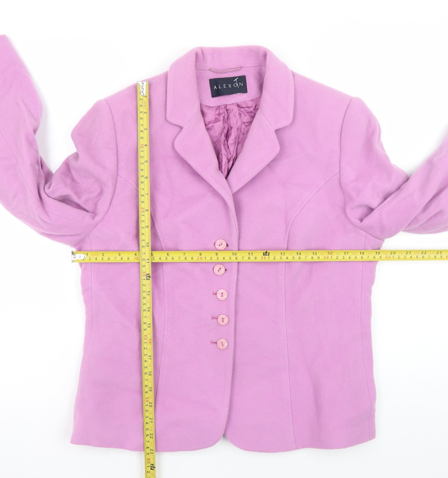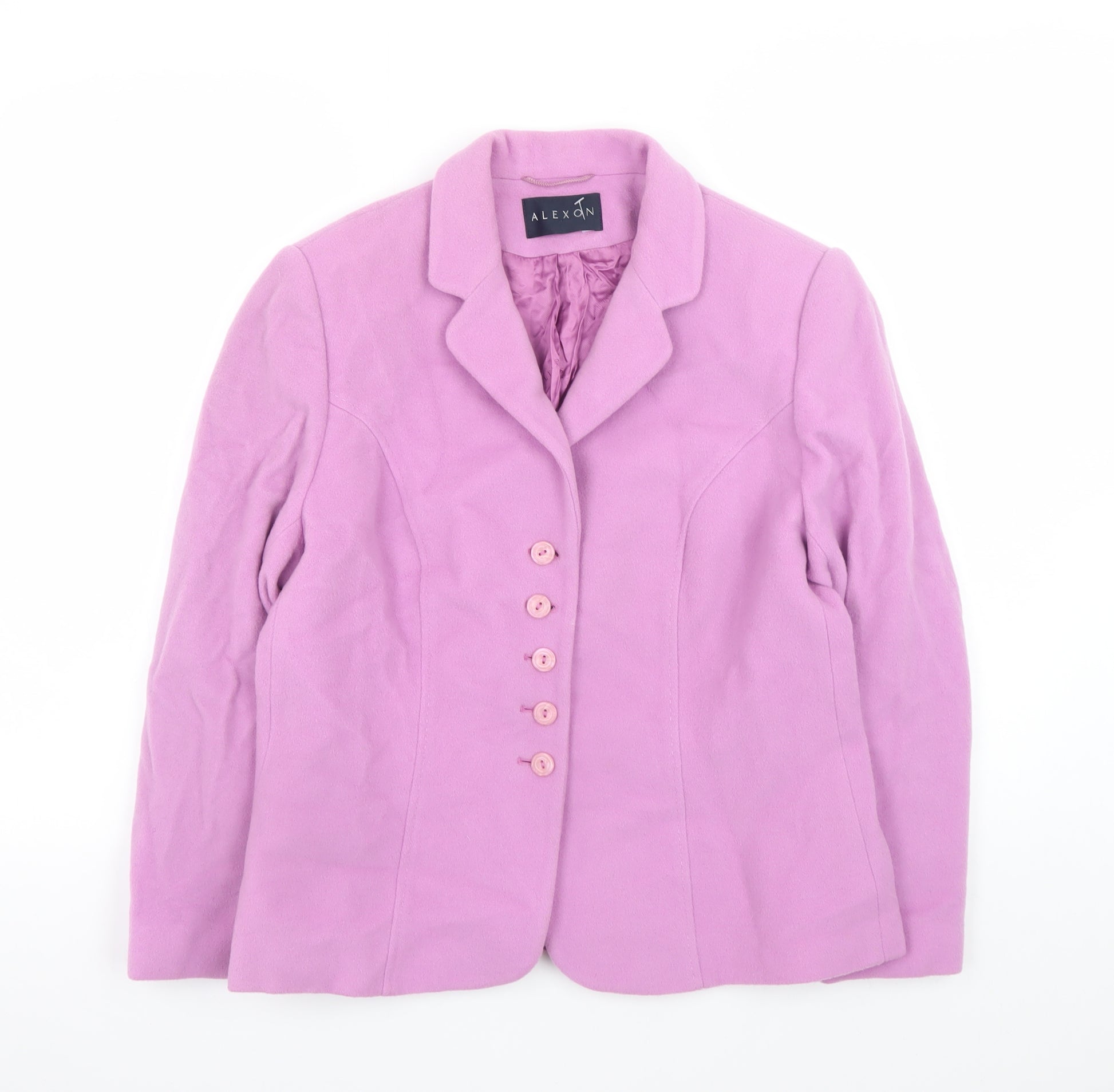 Elevate your wardrobe with this elegant pink blazer from Alexon. Crafted for the modern woman, this beautifully tailored jacket embodies timeless sophistication and refined style. Made from a premium blend of 85% wool and 15% cashmere, the outer shell offers warmth, durability, and a touch of luxury, perfect for the cooler autumn and winter seasons. The fully lined interior features soft viscose, ensuring a comfortable and smooth fit against the skin while maintaining the garment’s shape and structure. This classic single-breasted blazer fastens with coordinating pink buttons, adding a subtle touch of femininity to its structured silhouette. The collared neckline creates a polished appearance, making it a versatile choice for both business and formal occasions. Pair it effortlessly with tailored trousers or a pencil skirt for an office-ready look, or dress it down with jeans for a chic and casual ensemble. Designed for a regular fit, this mid-length jacket flatters the figure without feeling restrictive. The craftsmanship and attention to detail reflect Alexon’s long-standing reputation for creating high-quality, elegant womenswear. Its timeless design and superior fabric composition ensure that it remains a lasting staple piece in your wardrobe. The piece is in excellent pre-owned condition, showing only minimal signs of wear such as light creasing, yet remains beautifully maintained and ready to wear. Given its luxurious materials and classic design, this Alexon blazer presents a superb balance of comfort, quality, and elegance at an excellent value. Ideal for adding a refined touch to your professional or dress wear collection, this jacket is both stylish and practical — a piece that embodies confidence and understated sophistication.