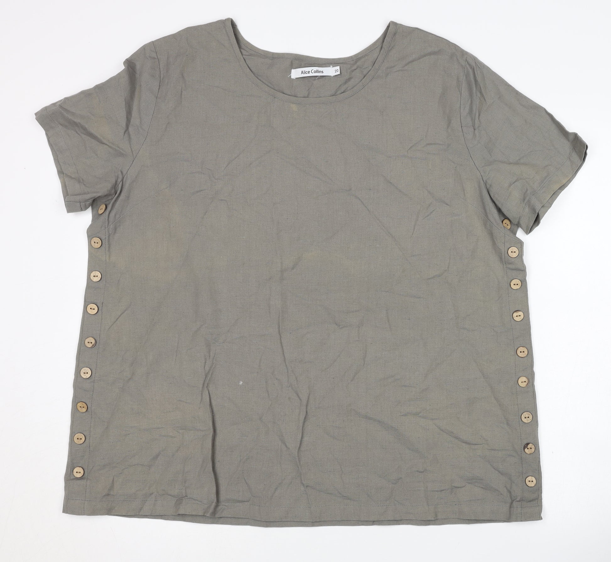 This Alice Collins women's top in size 20 offers a relaxed fit in a stylish shade of grey. Crafted from a comfortable blend of 70% cotton and 30% linen, this short sleeve top is perfect for casual outings. Featuring a classic round neck design and accented with trendy button detailing on the sides, it brings a unique touch to any wardrobe. The solid pattern and high-quality fabric ensure durability, while its breathable material promises comfort throughout the day. Ideal for layering or wearing on its own, this piece offers versatility across different seasons. The machine washable fabric makes it easy to care for, and its casual design is perfect for everyday wear. Despite a slightly wrinkled texture, the top maintains its charm and style. Perfect for those looking to add a touch of elegance and simplicity to their collection.