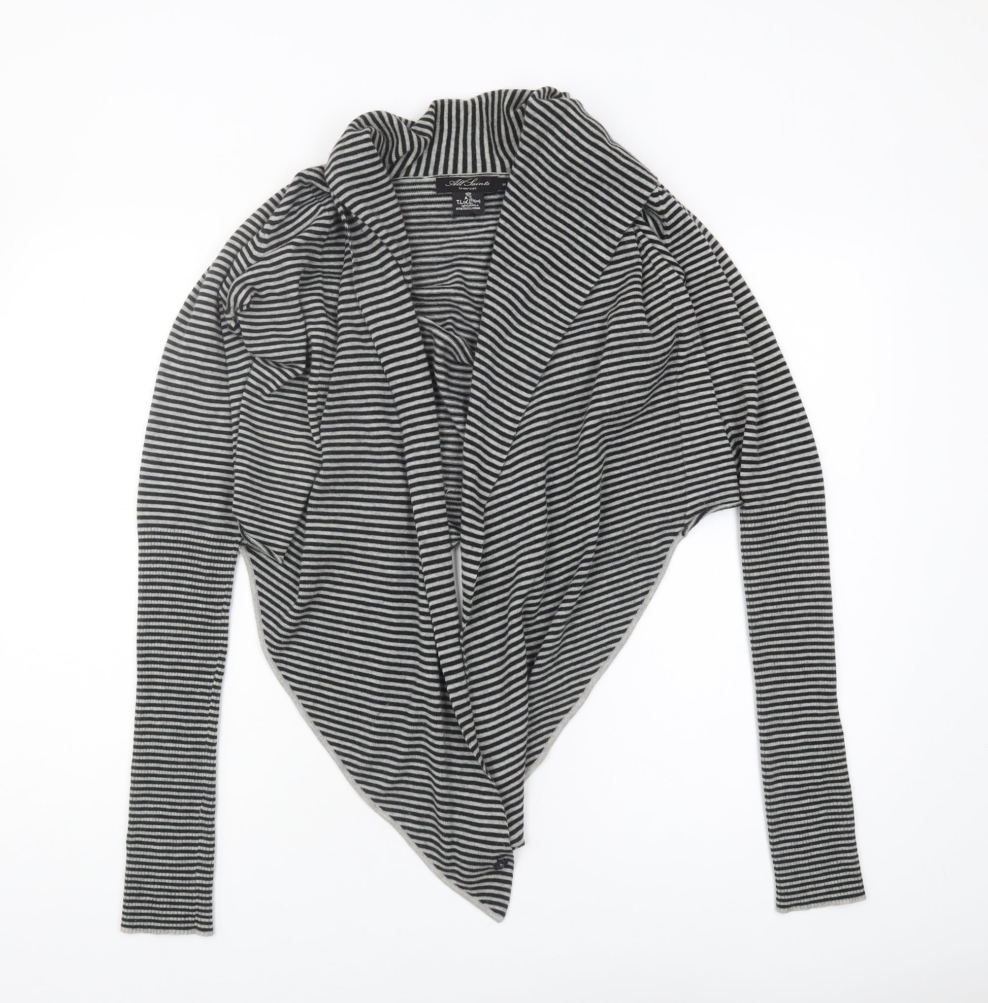 Experience effortless style with this sophisticated All Saints cardigan, perfect for the autumn and winter seasons. This women's cardigan, crafted from a luxurious blend of wool and silk, offers not only a stylish look but also superior comfort and warmth. The timeless black stripe pattern adds a touch of classic elegance to any wardrobe, ensuring versatility and style in equal measure. The cardigan features long sleeves and a relaxed fit, making it ideal for layering over your favourite tops and dresses. The durable knit fabric provides a soft feel against the skin, making it a cosy choice for cooler days. Whether you're dressing for a casual outing or a day at the office, this cardigan adapts beautifully, complementing both relaxed and polished looks. Despite being gently used, the cardigan maintains its excellent condition, with no visible signs of wear, allowing you to enjoy a high-quality garment at an attractive price point. Pair it with jeans for a laid-back appeal or wear it over a dress for a more sophisticated ensemble. With All Saints' renowned craftsmanship and stylish design, this cardigan is a must-have addition to your wardrobe. Don't miss out on the chance to own a stylish and versatile piece that promises to deliver style and comfort in every wear.