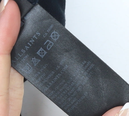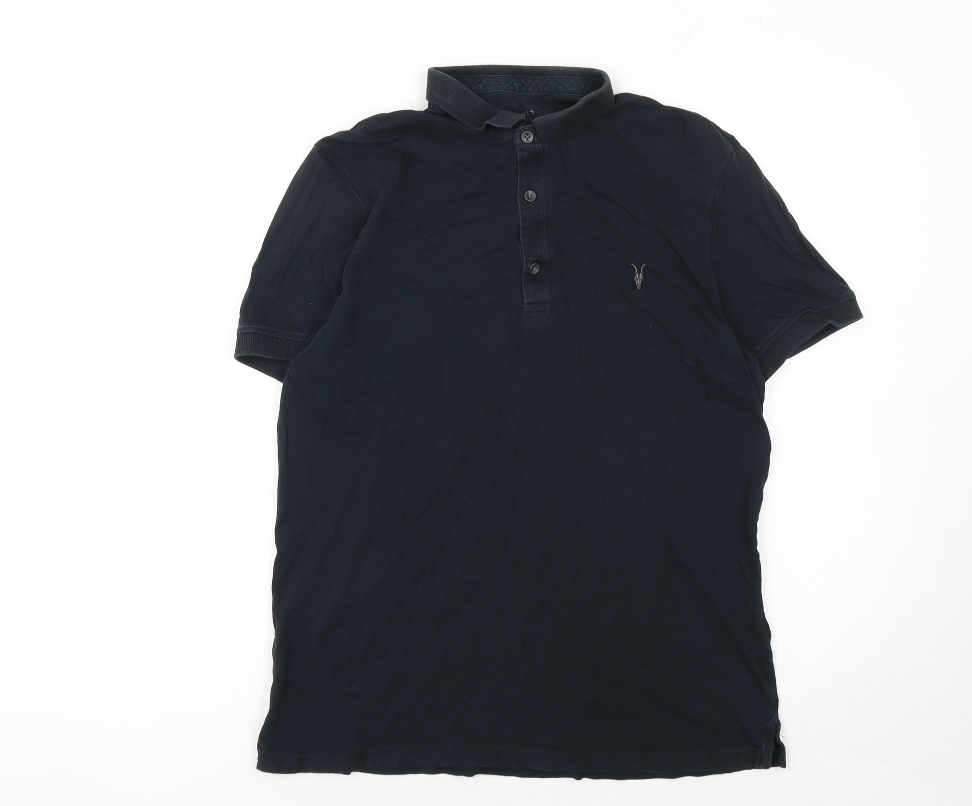 This AllSaints men’s black slim fit polo shirt is a timeless addition to any wardrobe, perfect for casual wear and easy to pair with jeans, chinos, or shorts. Crafted from 100% cotton, it offers a breathable and lightweight feel, ensuring lasting comfort through warmer months or layered looks in transitional weather. The simple collared neckline and classic three-button fastening create a clean silhouette with a contemporary edge, while the discreet embroidered AllSaints logo on the chest adds a premium finishing touch. Designed in a regular length with a tailored slim fit, this polo provides a flattering yet comfortable profile suited to modern styling. The solid black tone keeps it versatile and easy to coordinate with a range of outfits, offering effortless sophistication whether you're heading to a weekend brunch, a relaxed office setting, or an evening out. With its soft jersey cotton fabric, this polo shirt feels smooth against the skin, making it an ideal choice for everyday comfort and understated style. Its short sleeves and button-down collar reflect traditional menswear design updated with AllSaints’ urban aesthetic. The shirt is in very good pre-owned condition with light signs of gentle wear and slight creasing only, showing no significant flaws or damage. Machine washable for easy care, this polo is practical and durable for repeated wear. Featuring quality stitching, a structured collar, and subtle branding, it exemplifies AllSaints’ signature blend of minimalism and premium construction. A seasonal favourite for spring, summer, and autumn, this black AllSaints polo offers effortless appeal for any casual or smart-casual occasion, balancing relaxed style with refined detailing. Ideal for men looking for a classic yet contemporary piece to refresh their everyday wardrobe.