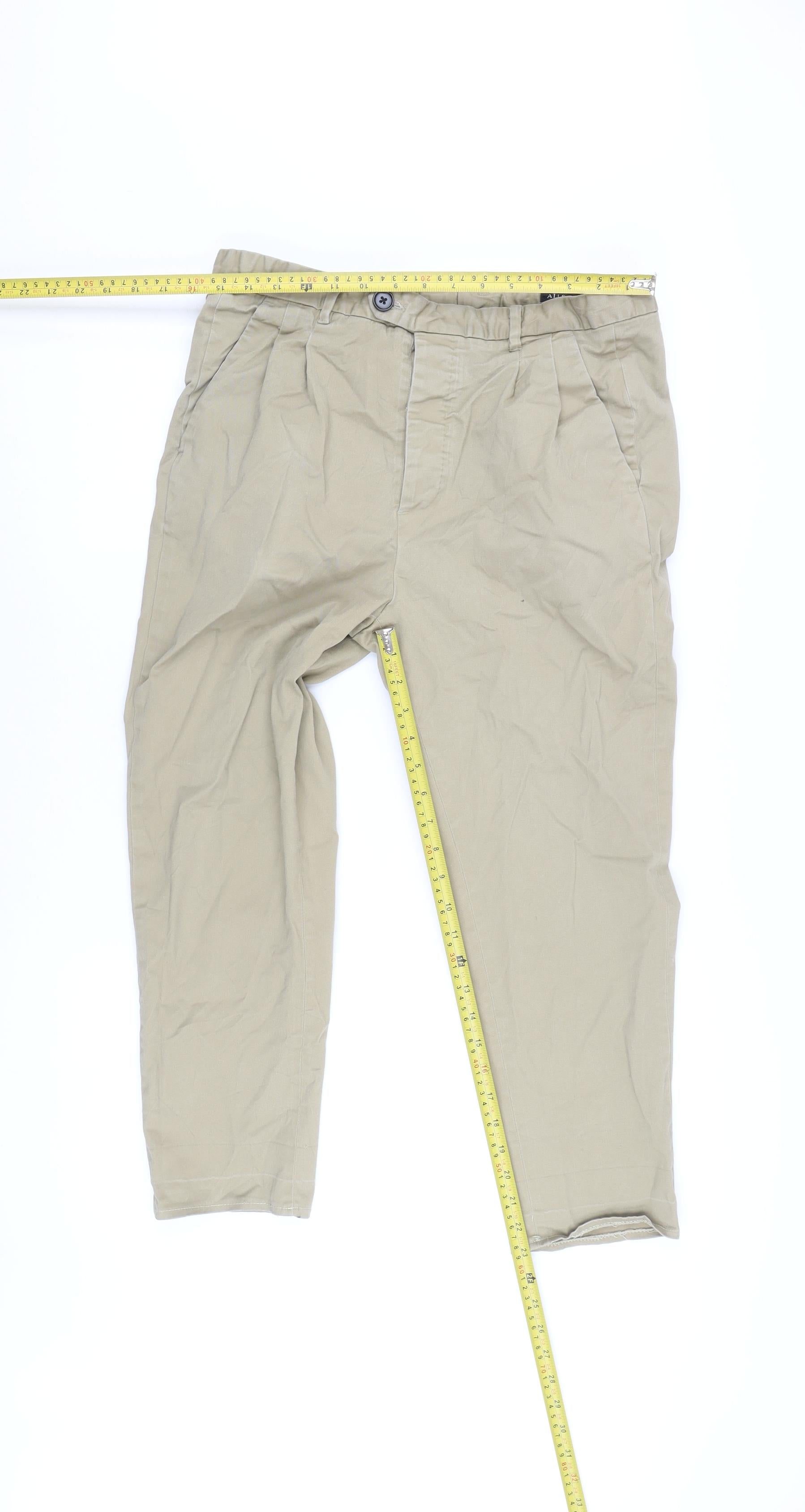 Elevate your casual wardrobe with these stylish beige cropped trousers by AllSaints, crafted for men who appreciate a blend of form and function. Designed with a regular fit and a mid-rise, these trousers offer a comfortable yet modern shape that aligns perfectly with spring, summer, and autumn seasons. The pleated front adds a touch of sophistication and structure to the relaxed feel, making these trousers a versatile piece for various occasions.Made from quality cotton with a twill fabric type, they provide a soft touch and breathable comfort, ideal for all-day wear. The trousers are adorned with practical pockets and secure with a classic button closure, enhancing their everyday utility without sacrificing style.Perfect for casual outings or relaxed work environments, these trousers come in a straightforward, no-pattern format, making them easy to pair with a variety of tops and shoes. Despite being pre-owned, they are in excellent condition with a slight wrinkle from storage but no significant signs of wear or stains. Please note, the trousers come without original sales tags.These AllSaints trousers reflect a seamless blend of contemporary design and timeless appeal, ensuring you look effortlessly chic. Whether you are heading to a casual meet-up or a leisurely stroll through the park, this piece will serve as a dependable addition to your ensemble. Enjoy the subtle luxury and understated elegance these trousers bring to your casual days.