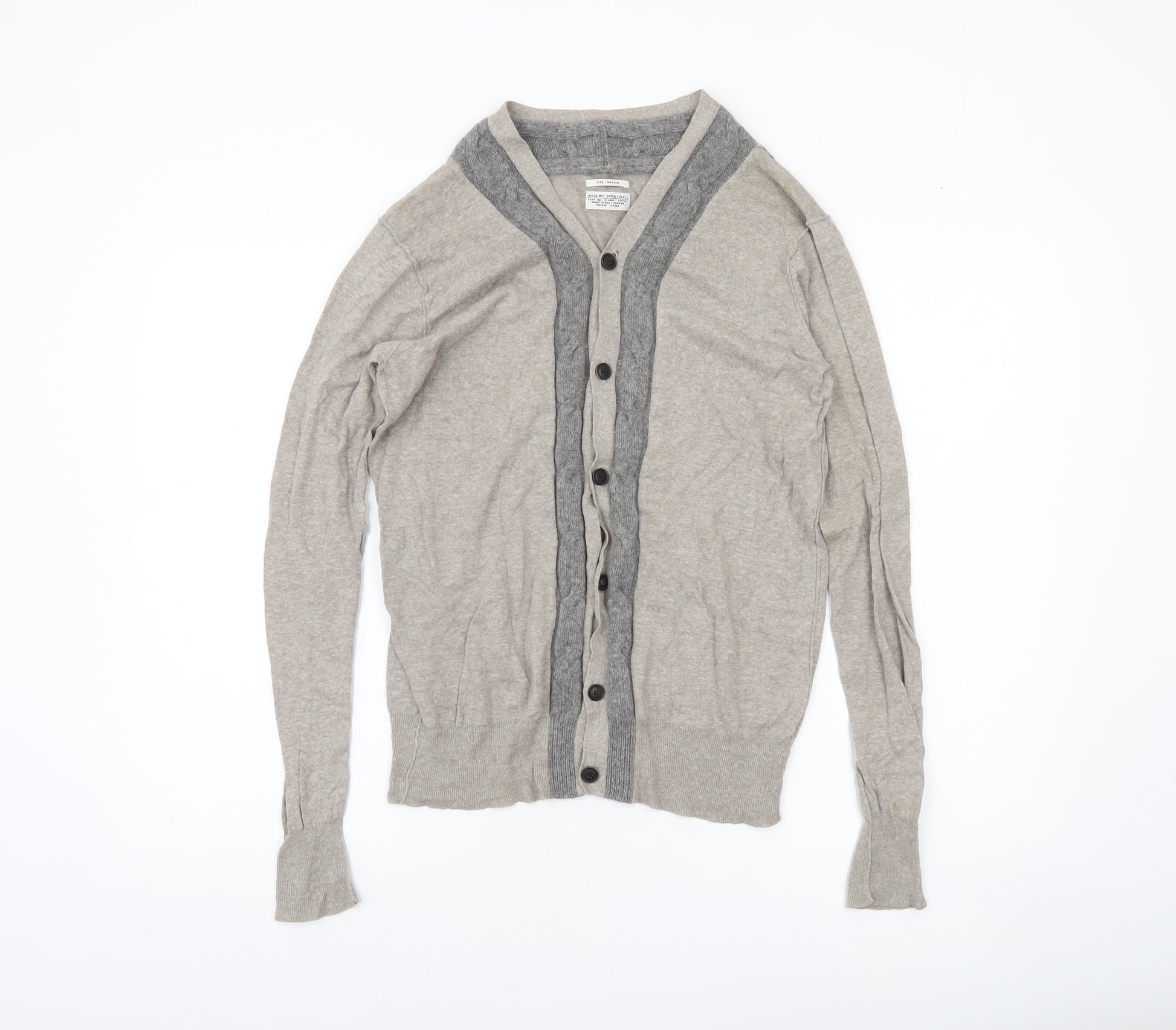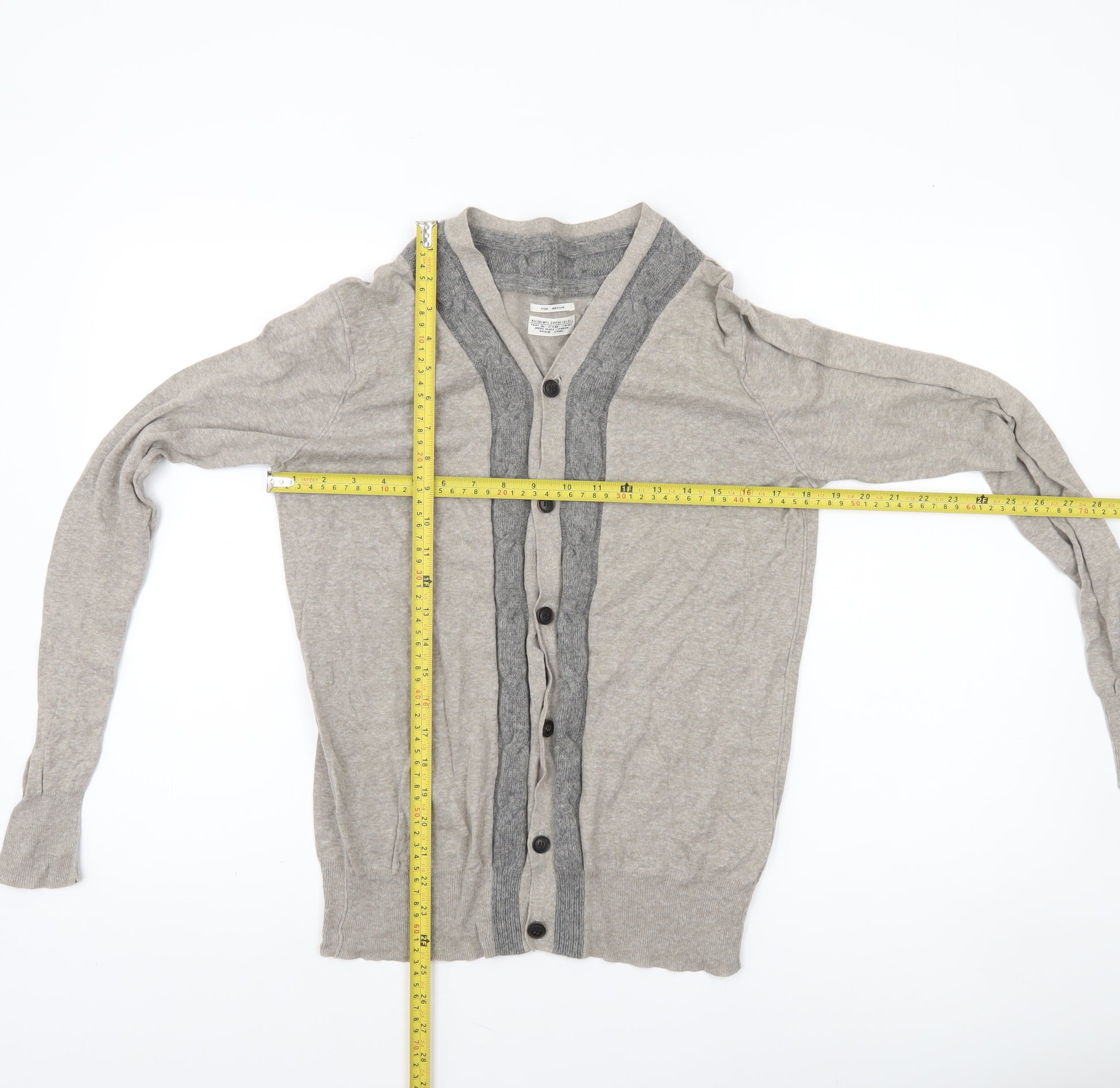 This AllSaints men's beige cardigan delivers the brand’s signature minimalist aesthetic with exceptional attention to detail and craftsmanship. Constructed from a premium blend of 45% linen, 44% cotton, and 11% wool, it offers a breathable yet softly insulating fabric that’s perfect for layering in the cooler months of spring and autumn. The lightweight knit style and linen-rich composition create a naturally comfortable, relaxed drape that feels effortless yet refined. Featuring a slim fit cut that flatters the torso, this cardigan is shaped to maintain a modern silhouette without sacrificing ease of wear. The contrast grey ribbed trims along the V-neckline and placket add a refined visual texture, while the black button fastening brings stylish simplicity to the design. The neutral beige colour ensures versatility — it pairs easily with jeans, chinos, or smart trousers, making it suitable for both casual and smart-casual occasions. Whether layered over a crisp shirt for a clean everyday office look or teamed with a plain tee for relaxed weekends, this AllSaints cardigan adapts seamlessly to your wardrobe. The craftsmanship seen in the ribbed cuffs, hem detailing, and refined knit composition underscores the quality expected from AllSaints' Spitalfields line. The overall garment condition is very good, showing minimal signs of previous wear, limited only to slight bobbling consistent with natural fabric texture. Designed for men who appreciate understated luxury and effortless British style, this cardigan captures a perfect balance of comfort and sophistication. It’s a timeless investment piece from a brand synonymous with modern urban design, making it an ideal choice for transitional dressing or casual layering across seasons. With its blend of natural fibres and refined construction, it offers breathable comfort and long-lasting wearability that promises both quality and understated confidence.