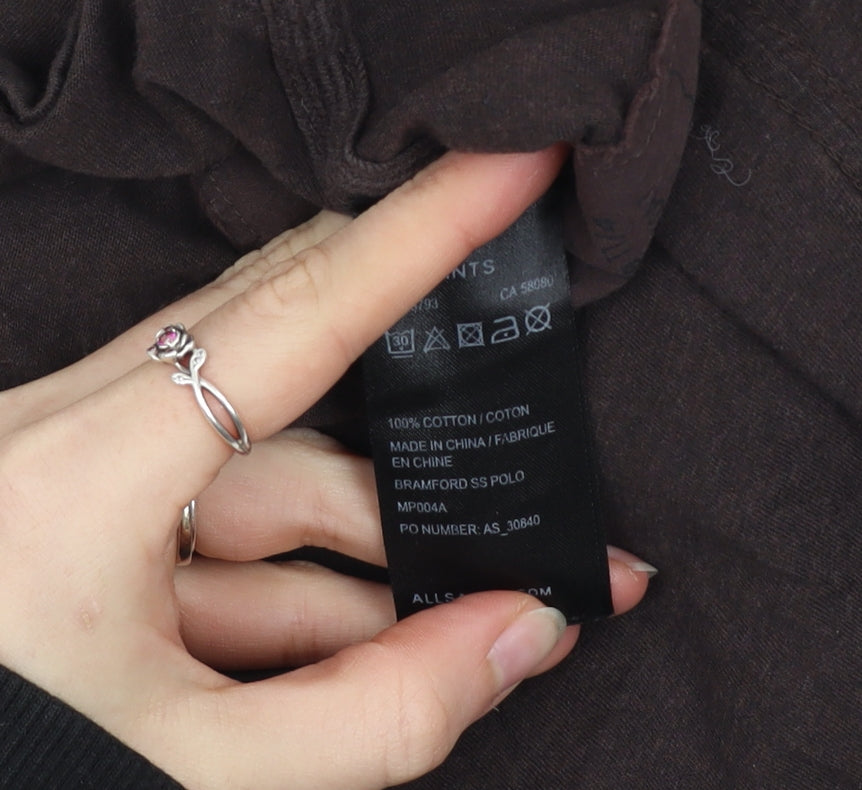 This AllSaints men’s Bramford short sleeve polo shirt in rich brown offers a timeless, effortlessly cool look perfect for casual and smart-casual settings. Crafted from 100% cotton jersey, it provides exceptional comfort and breathability, making it ideal for year-round wear, particularly in the spring, summer, and autumn seasons. The soft, natural texture of the cotton ensures all-day ease while maintaining AllSaints’ signature refined aesthetic.The polo features a classic collared neckline with a three-button placket, subtly accented with the iconic embroidered logo on the chest, ensuring a touch of understated branding. The regular fit design drapes naturally on the body, giving a relaxed yet contemporary silhouette suitable for layering or wearing solo. Versatile and easy to pair, this piece works seamlessly with jeans, chinos, or shorts, making it a wardrobe staple for the modern man.In very good pre-owned condition, it shows light, natural signs of wear consistent with gentle use, including minor fading that adds a lived-in look without detracting from overall appeal. The breathable 100% cotton fabrication ensures long-lasting comfort, while its machine washable care makes maintenance simple and convenient.Perfect for everyday wear, this AllSaints polo transitions smoothly from weekend outings to casual socials or even a laid-back office environment. Its minimalist design, muted brown tone, and premium quality sum up the brand’s effortless urban style. Offering a refined yet relaxed finish, this piece would make a versatile addition to any fashion-forward wardrobe.Whether styled buttoned up for a sleek look or open-necked for a more casual vibe, the AllSaints Bramford Polo delivers timeless sophistication and reliable comfort. A must-have for those who appreciate both style and substance in their smart-casual collection.