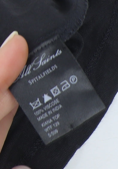 Elevate your everyday wardrobe with this stunning black tunic blouse from AllSaints Spitalfields. Expertly crafted from 100% viscose, this top offers a beautifully soft and lightweight feel, making it an ideal choice for warmer days or layering under a jacket for cooler evenings. Designed in a flattering tunic silhouette, the piece features a scoop neckline and stylish sleeveless design that allows for effortless comfort and style. The standout detail of this AllSaints top lies in its shimmering gold and black sequin embellishment that cascades across the neckline, instantly adding a touch of contemporary glamour to any look. Perfect for both casual days out and dressier occasions, this versatile top pairs effortlessly with jeans, leggings, or a sleek skirt for an elevated, modern ensemble. In very good pre-owned condition, showing only light signs of gentle wear with minor creasing from storage, this piece maintains the premium craftsmanship and edgy aesthetic expected from AllSaints. Ideal for parties, cocktails, or city-inspired styling, this tunic blouse embodies a balance between laid-back luxury and distinctive modern design. Whether dressed up with heels and a clutch or styled down with ankle boots and a leather jacket, this top ensures instant sophistication and standout presence. Make this AllSaints sequin-embellished tunic top a staple in your wardrobe for years to come—effortless, timeless, and chic, it perfectly reflects the AllSaints spirit of understated edge with elegant appeal.