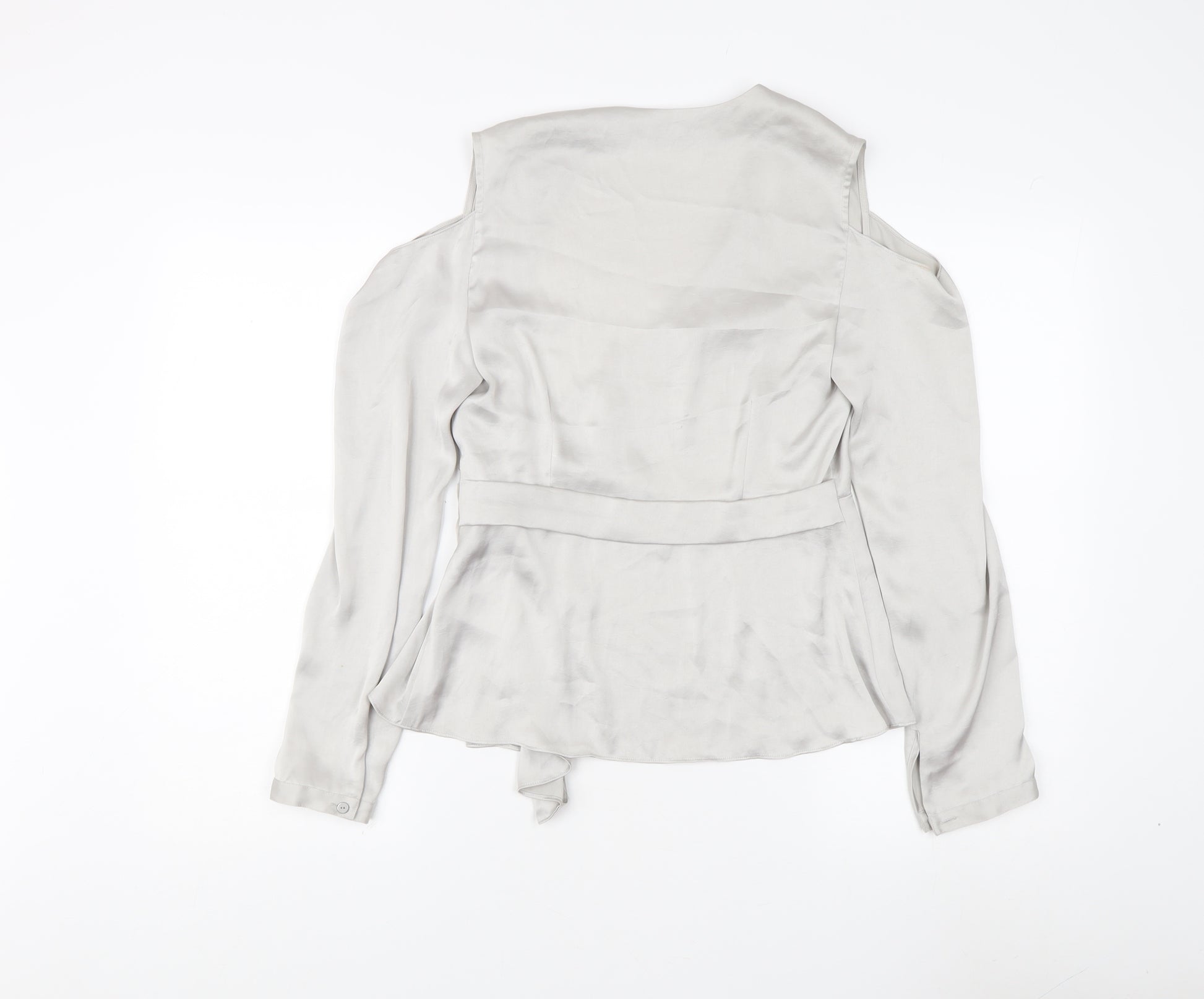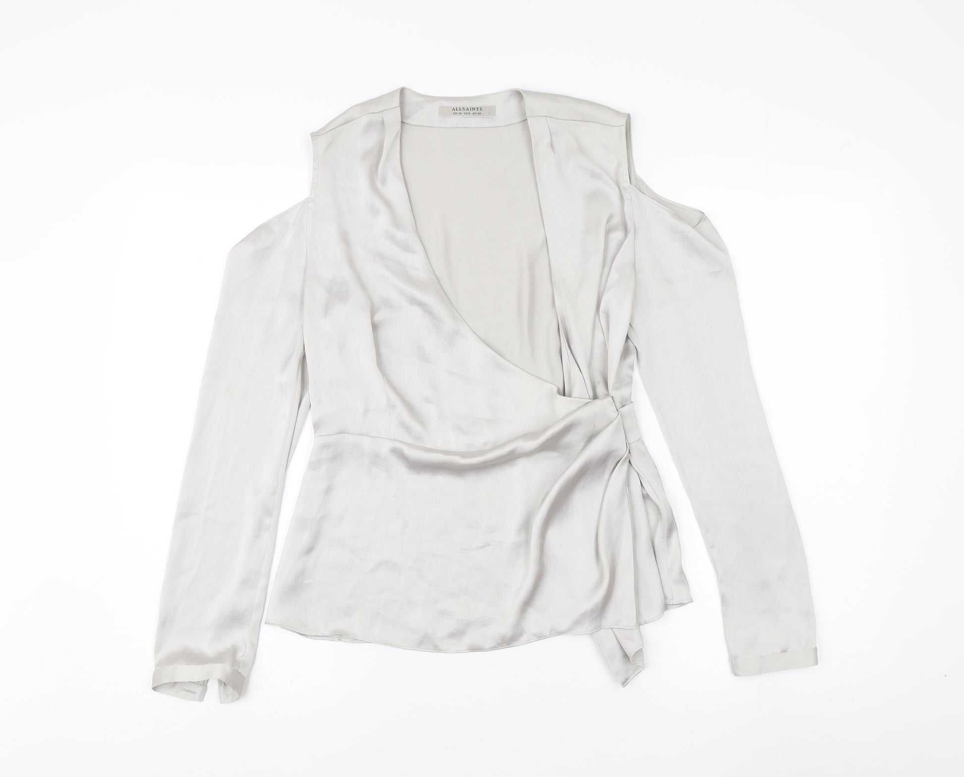Step out in style with this elegant AllSaints wrap blouse, perfect for women seeking a blend of sophistication and comfort. Crafted thoughtfully from 100% polyester, this grey blouse ensures a lightweight and smooth feel against the skin. The V-neckline and cold shoulder sleeve design add a touch of modern appeal, making it a chic choice for any casual or cocktail occasion. Featuring a versatile long sleeve style, the blouse aligns perfectly with spring, summer, and autumn seasons, ensuring you stay fashionable year-round. Designed in a regular fit, it flatters the silhouette while offering ease of movement, ideal for a relaxed yet stylish ensemble. With a convenient wrap and tie closure, achieve a customized fit effortlessly. The grey solid pattern complements various accessories, providing endless styling possibilities. Dry clean only for maintaining its refined appearance. Embrace the allure of this AllSaints piece, promising unmatched versatility and elegance within your wardrobe.