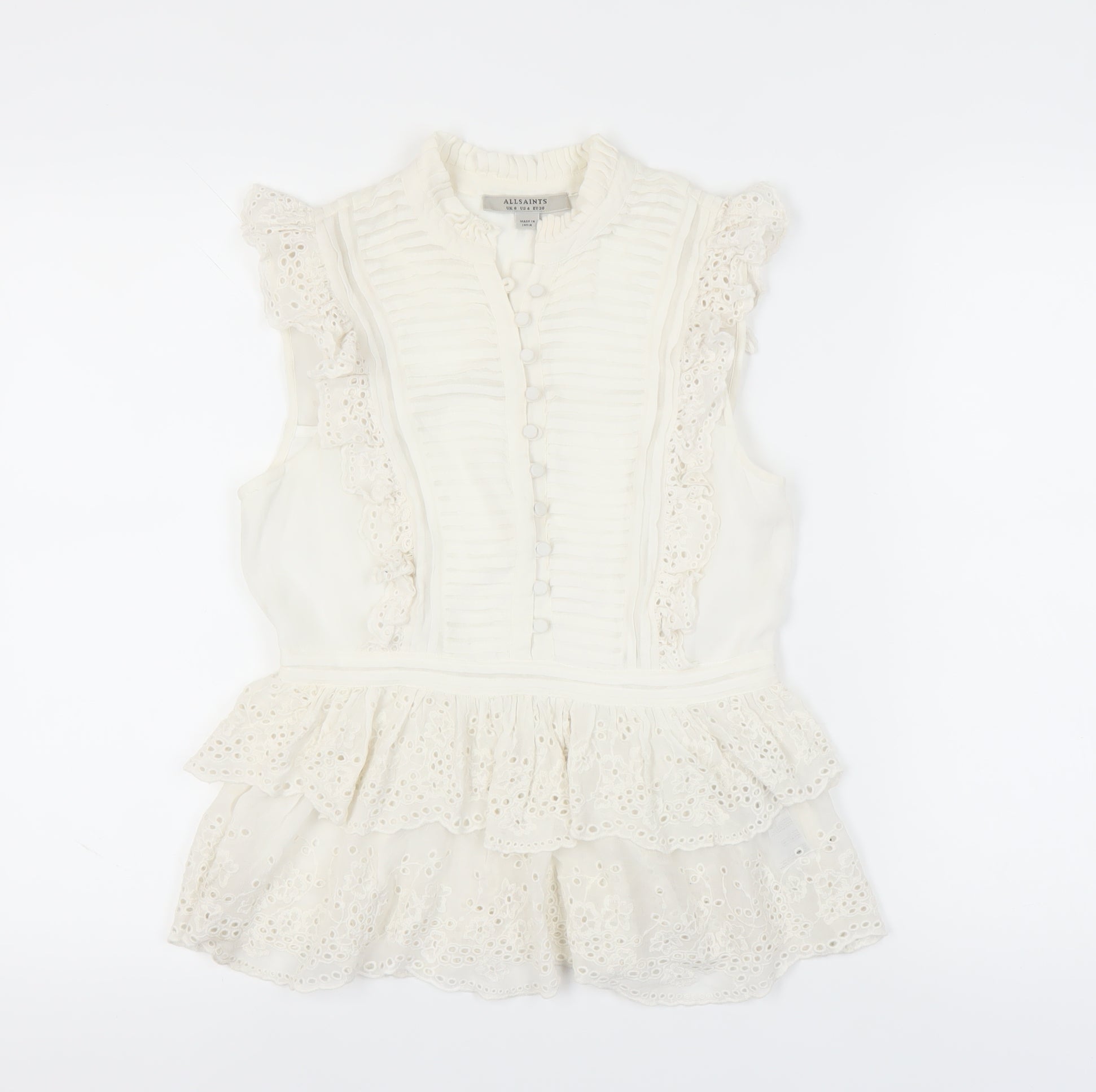 Elevate your wardrobe with this exquisite AllSaints women's blouse in a delicate ivory shade, perfect for both casual outings and chic cocktail gatherings. Crafted from a soft blend of cotton and silk, this blouse provides a luxurious feel while ensuring breathability, making it ideal for spring and summer wear. The sleeveless design is complemented by elegant ruffle accents and a high neckline, offering a classic bohemian aesthetic. Lightweight and effortlessly stylish, this blouse features intricate lace detailing and a secure button closure for added sophistication. Whether you pair it with jeans for a relaxed look or style it with a skirt for a refined touch, this AllSaints blouse promises to be a versatile addition to your collection. Sized at UK 8 and tailored for a regular fit, it caters to a range of body types while maintaining a flattering silhouette. Experience timeless elegance with this must-have piece.