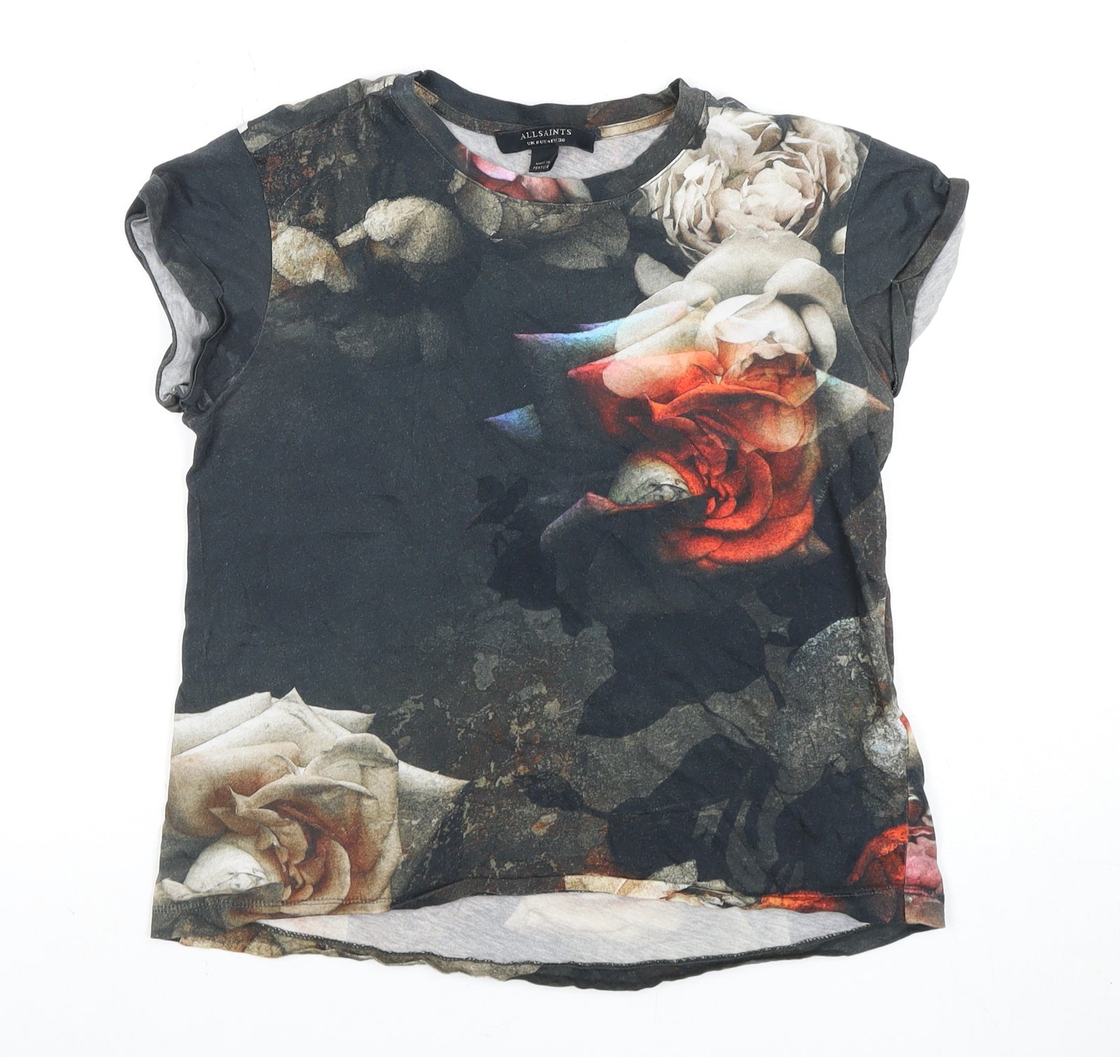 Enhance your wardrobe with this stunning AllSaints women's T-shirt, perfect for casual occasions. Adorned with a beautiful multicoloured floral pattern, this short-sleeved T-shirt offers a blend of style and comfort. Crafted from 100% cotton in a soft jersey fabric, it provides an effortlessly chic look while maintaining superior comfort. The crew neck design adds a classic touch, making it ideal for pairing with jeans or skirts. Despite slight wear, the vibrant floral print remains intact, adding a splash of colour to your ensemble. Suitable for the warmer months of spring and summer, its regular fit offers a flattering silhouette for size 8 wearers. Easy to care for with its machine washable feature, this T-shirt combines practicality with elegance. The AllSaints brand ensures quality and trend-setting design, making this T-shirt a must-have piece. Priced reasonably, it presents a great opportunity to add a touch of floral elegance to your collection.