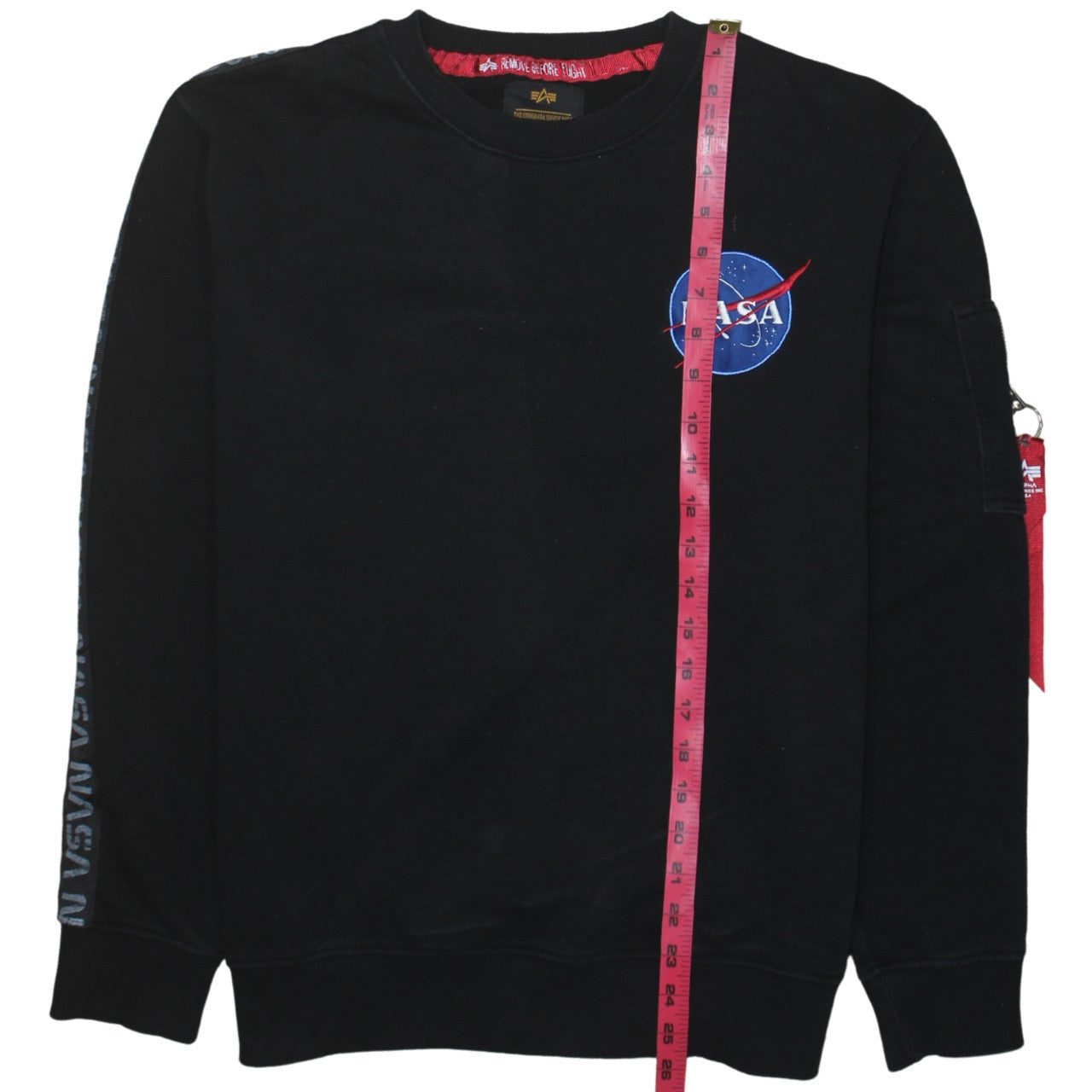 This Alpha Industries Men's Black NASA Crew Neck Sweatshirt in size M combines authentic military-inspired design with everyday comfort. Featuring the iconic NASA logo embroidered on the chest and detailed sleeve panel branding, the sweatshirt instantly stands out with its bold, space-themed aesthetic. Crafted from a soft, durable jersey blend of 80% cotton and 20% polyester, it provides warmth and breathability, perfect for year-round wear. The crew neckline, ribbed cuffs, and hem ensure a classic fit that maintains its shape throughout frequent use. A signature zip pocket on the sleeve adds a practical and stylish touch, finished with the brand’s signature 'Remove Before Flight' tag for an authentic aviation-inspired accent. Designed for casual yet distinctive wear, this sweatshirt pairs effortlessly with jeans or joggers for an off-duty, contemporary look. Ideal for cooler days or layering under jackets in autumn and winter, it combines the comfort of a premium pullover with the striking appeal of Alpha Industries' renowned craftsmanship. The black cotton blend fabrication makes it easy to maintain and machine washable while retaining its deep colour and structure. Subtle lining ensures long-lasting comfort against the skin. With a fusion of functional detailing, heritage branding, and timeless streetwear styling, this Alpha Industries NASA sweatshirt is a must-have for fans of space exploration and bold fashion statements alike. In excellent used condition with minimal signs of wear, this piece delivers quality, authenticity, and iconic style in one versatile garment.