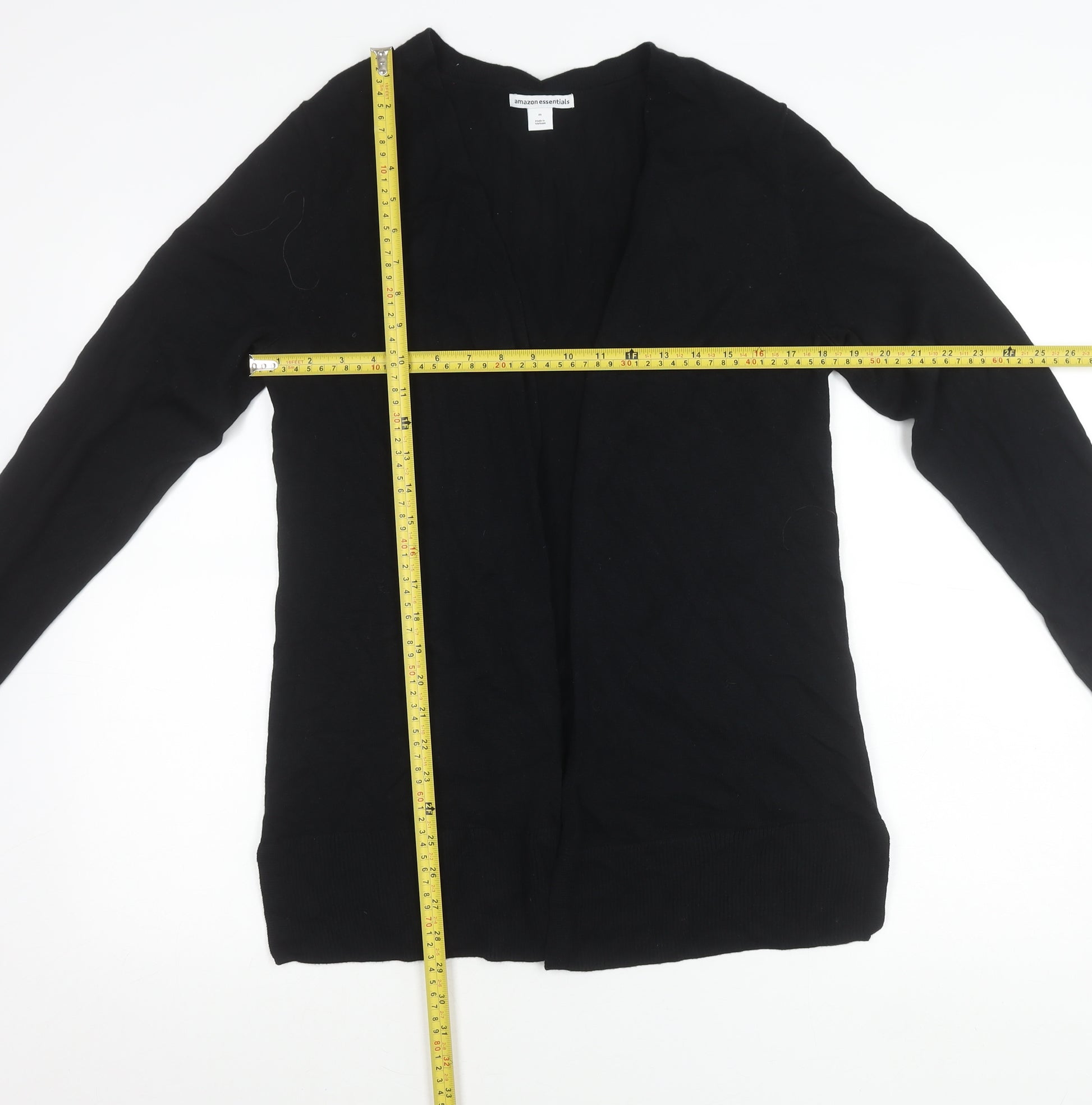 This Amazon Essentials women’s cardigan offers a timeless and versatile wardrobe staple, designed to provide both comfort and style. Crafted in a sleek black finish, this medium-sized cardigan is perfect for layering in cooler seasons while still being lightweight enough for springtime wear. Made from a soft knit cotton blend, it provides a breathable and cosy feel, ideal for everyday use whether at work, casual outings, or at home.The cardigan features a flattering V-neckline with an open front design, giving you the flexibility to style it over blouses, t-shirts, or dresses. The long sleeves make it a practical choice for year-round wear, while its regular fit ensures a comfortable and relaxed silhouette without being too oversized. The knit construction provides durability and shape retention, while the minimalist no-pattern design allows it to easily complement a wide variety of outfits.Its simple and elegant design makes this cardigan a versatile layering piece. During cooler months, it works beautifully under coats or jackets, while in transitional seasons such as spring and autumn, it acts as a lightweight outer layer. The soft and breathable fabric ensures you stay comfortable from day to night, making it a truly functional wardrobe essential.Perfect for casual and workwear occasions, this cardigan is both practical and stylish. Easy garment care with machine washability means it’s low-maintenance, allowing for everyday wear without worry. The condition of this piece is very good, with only light signs of wear visible, ensuring it still looks stylish and neat while being offered at an affordable reused price point.Whether paired with jeans for a casual look or dressed up with tailored trousers and a blouse for work, this versatile black cardigan is a must-have layering essential that can be styled in multiple ways. Affordable, practical, and timeless, it’s an excellent choice for any wardrobe.