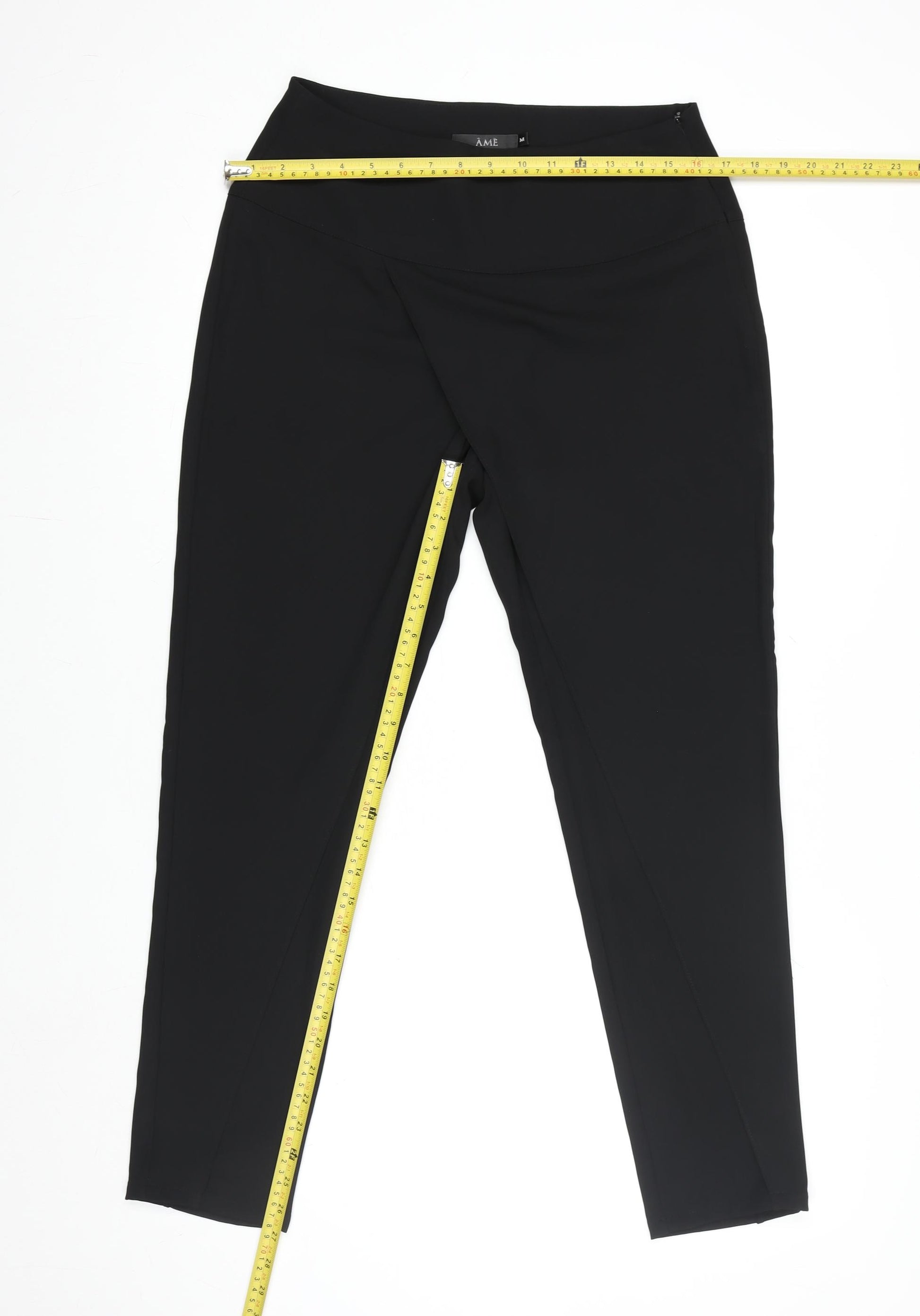 These elegant black leggings by ÂME offer a sleek and comfortable choice for everyday wear. Crafted from 100% polyester, they feature a soft and flexible jersey fabric that feels smooth against the skin while maintaining structure and durability. Designed in a flattering slim fit style, these leggings contour the body for a streamlined silhouette, making them versatile enough for both casual outings and smart-casual occasions. Their elasticated waist ensures a comfortable and secure fit, while the lightweight, breathable fabric makes them suitable for year‑round wear including autumn, spring, summer, and winter seasons. The mid‑rise waist enhances a flattering shape, while the simple flat front gives them a modern and minimalistic edge. With a smooth matte finish, these trousers maintain a polished look that can easily transition from daywear to more refined evening looks with the right pairing. Ideal for women who value both comfort and sophistication, these ÂME leggings are perfect for travel, work‑from‑home days, or relaxed social events. The absence of visible closures and patterns contributes to a sleek silhouette, while features such as stretch, lightweight comfort, and easy‑care machine washability make them practical and low‑maintenance. These trousers remain in excellent used condition with no visible flaws or damage detected, showing only minimal signs of gentle wear. Whether worn with a longline blouse or a structured blazer, they will add effortless polish to any outfit. A must‑have versatile piece for any contemporary wardrobe, blending comfort, quality, and timeless minimalist style.