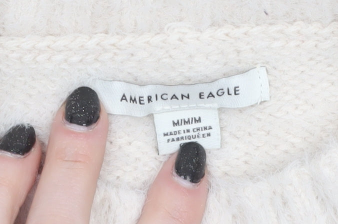 Stay warm and stylish in this cosy ivory jumper from American Eagle. Designed for women, this medium-sized pullover features a relaxed fit and a soft knit texture crafted from a quality blend of nylon and acrylic. The fabric feels plush and smooth on the skin, offering a flattering drape while keeping you comfortable in cooler temperatures. Its ribbed crew neckline, cuffs, and hem add subtle structure, while the clean ivory shade makes it a versatile wardrobe essential that complements any outfit effortlessly. Ideal for casual wear or layering on chilly autumn and winter days, this jumper can be paired with jeans for a relaxed weekend look or dressed up with trousers and accessories for a smart-casual style. The tight-knit construction helps retain warmth without adding bulk, giving it a cosy yet stylish silhouette. Machine washable for easy care, this American Eagle jumper is perfect for those who appreciate understated comfort and timeless design. It comes in excellent condition with no visible flaws, ready to become a favourite piece in your knitwear collection. Whether you are lounging at home, heading out with friends, or braving brisk weather, this soft and lightweight jumper ensures you’ll look effortlessly chic. Add this versatile knit to your wardrobe for an effortlessly casual yet refined appearance that combines comfort, durability, and modern simplicity.