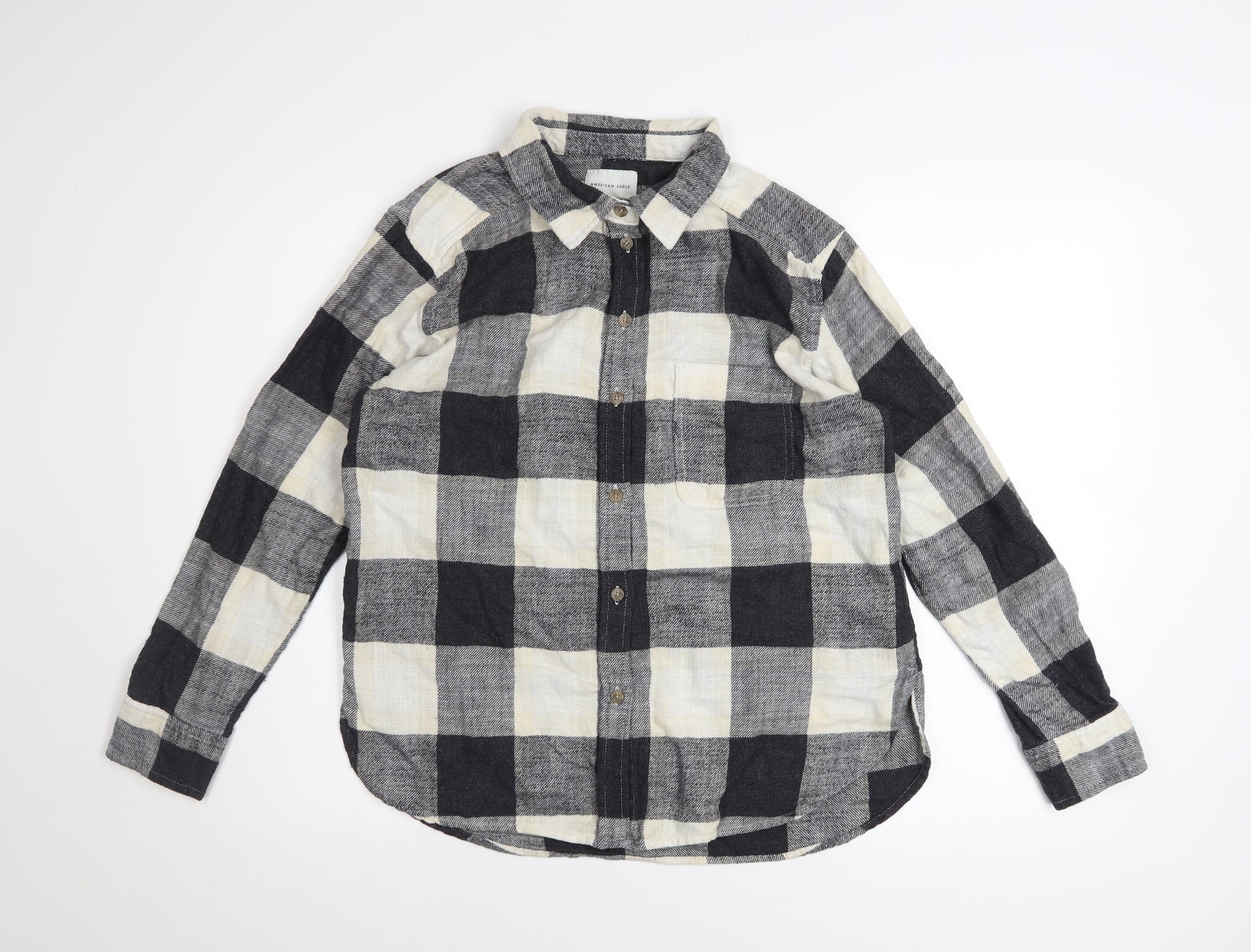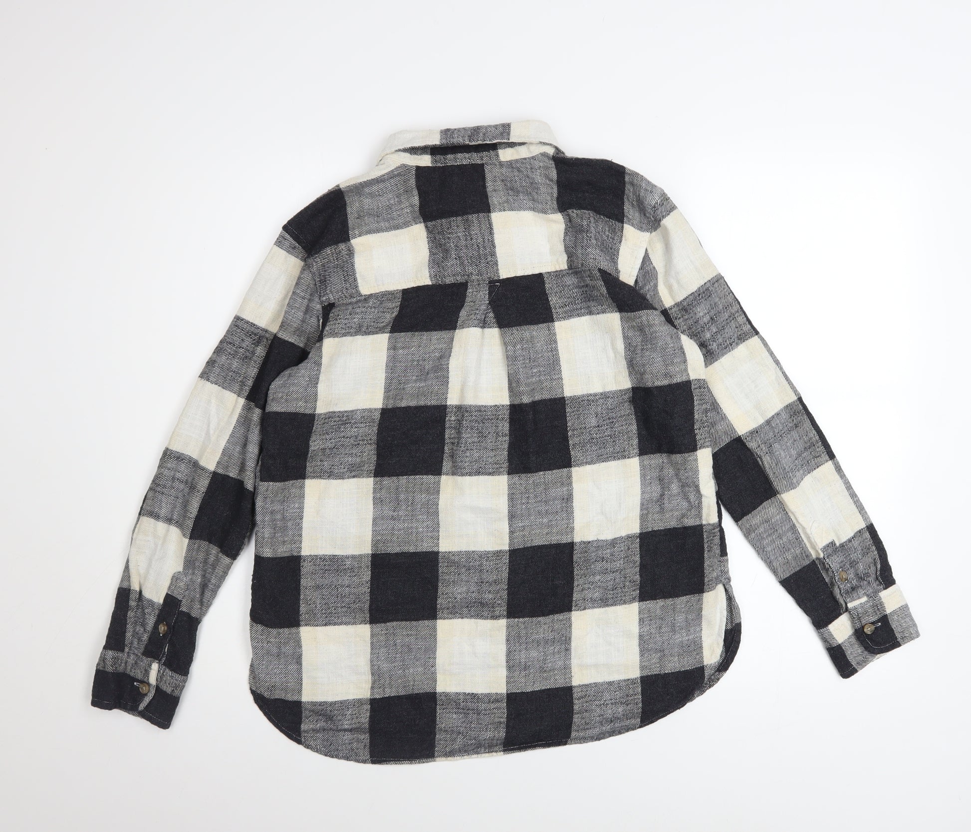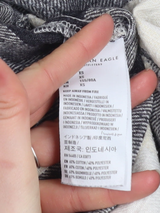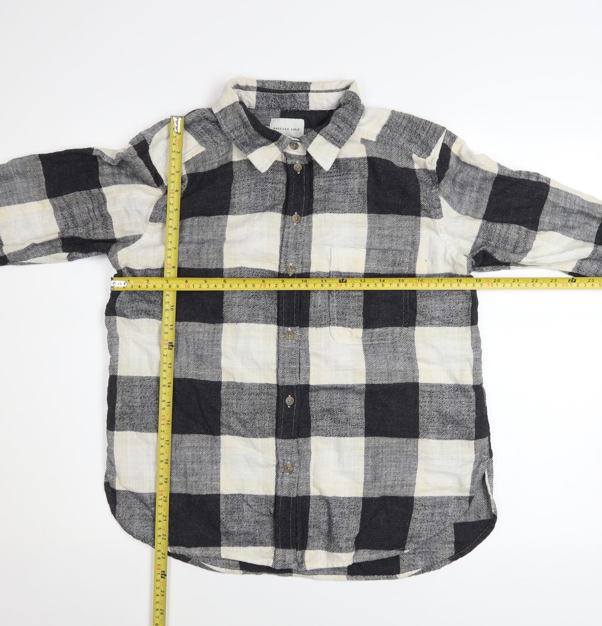 Step into effortless casual style with this American Eagle women's button-up shirt. Designed in a classic black and ivory large check pattern, this shirt offers timeless appeal that fits seamlessly into any wardrobe. Crafted from a soft, breathable cotton and polyester blend (60% Cotton, 40% Polyester), it provides lightweight comfort ideal for layering or wearing on its own during the cooler months.The relaxed 'Boyfriend Fit' silhouette gives it a laid-back charm, perfect for achieving that easy, off-duty look. Featuring a collared neckline, long sleeves with button cuffs, and a convenient chest pocket, this shirt delivers both form and function. Its button fastening ensures versatility — wear it open over a tee for a relaxed vibe or buttoned up with jeans for a more polished finish.Made to last, this flannel-style shirt feels cozy yet durable, making it an ideal choice for autumn, winter, and early spring wear. Because of its classic design, it pairs effortlessly with everything from denim to skirts, allowing for countless styling options. The breathable and lightweight fabric keeps you comfortable all day, whether you're dressing for a casual outing, a weekend getaway, or a relaxed workday.This piece is in excellent pre-owned condition with no visible flaws or marks, retaining its original softness and shape. The black and cream checked design adds an iconic, rustic charm suitable for layering under coats or wearing loosely on warmer days. Machine washable and easy to care for, this shirt makes a practical yet stylish addition to any wardrobe.Ideal for women who value comfort and casual sophistication, this American Eagle flannel button-up shirt is a wardrobe essential that brings together timeless design, quality craftsmanship, and everyday versatility. Add this to your collection for that perfect blend of comfort and effortless style.