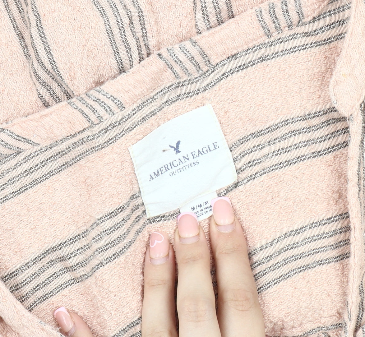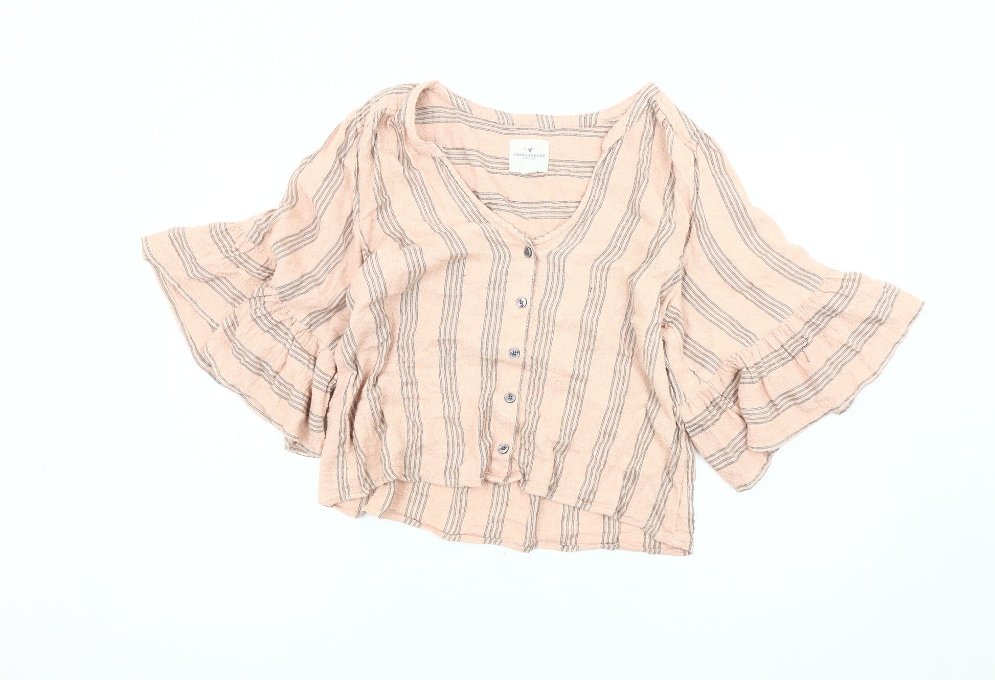 Embrace casual elegance with this American Eagle women's blouse, featuring a stylish pink striped pattern and a flattering V-neckline. Made from soft cotton, it offers comfort and breathability, making it ideal for a relaxed day out or a casual occasion. The blouse's flared sleeves add a touch of flair, while the button closure ensures a classic look. Perfect for pairing with jeans or skirts, this medium-sized piece will effortlessly become a staple in your wardrobe. Despite slight wear, its excellent condition guarantees long-lasting wear. Add this unique piece to your collection today and enjoy its versatile charm.