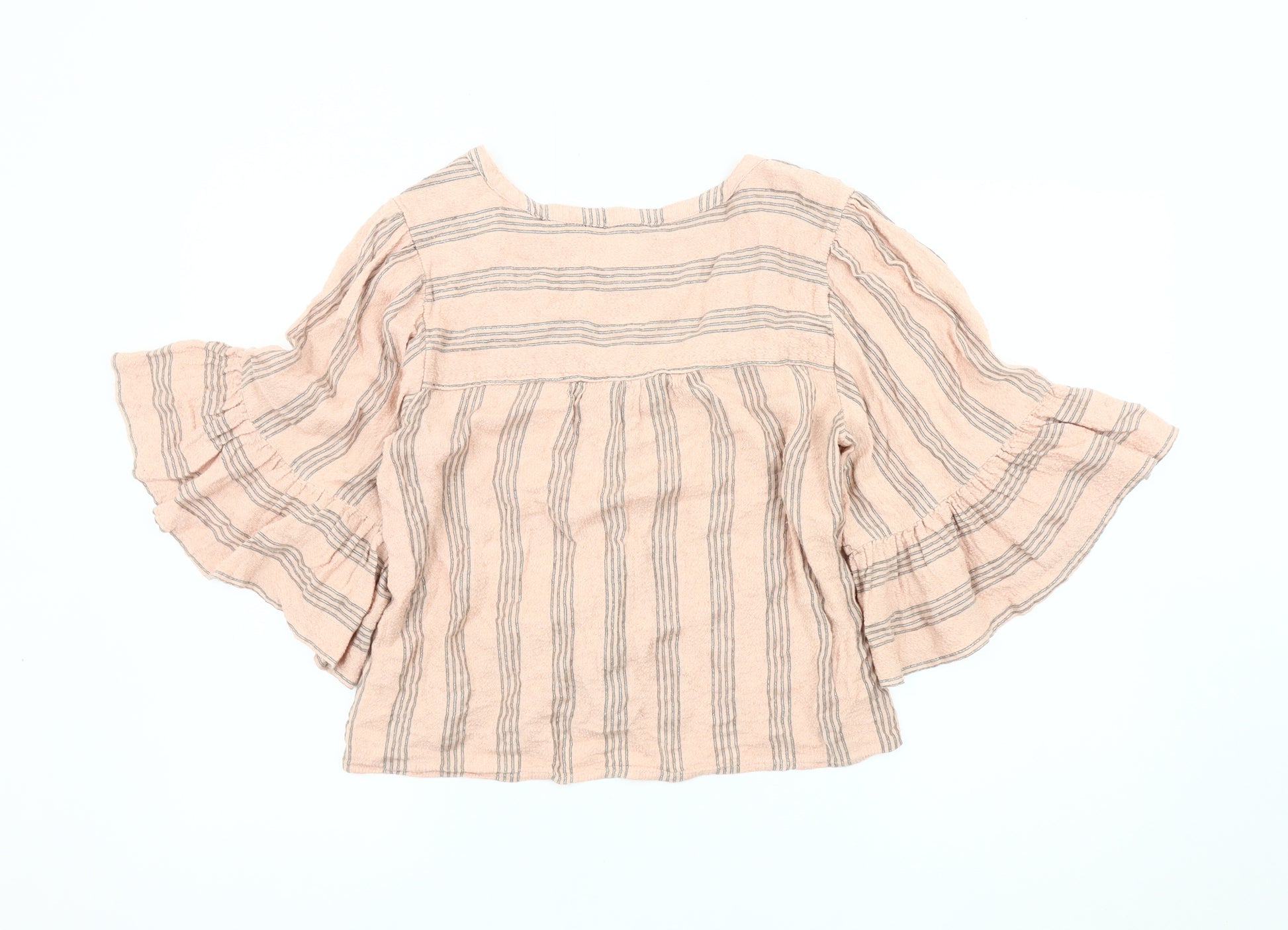 Womens Pink Striped Blouse, M, V-Neck, Flared Sleeve