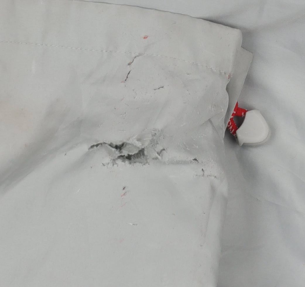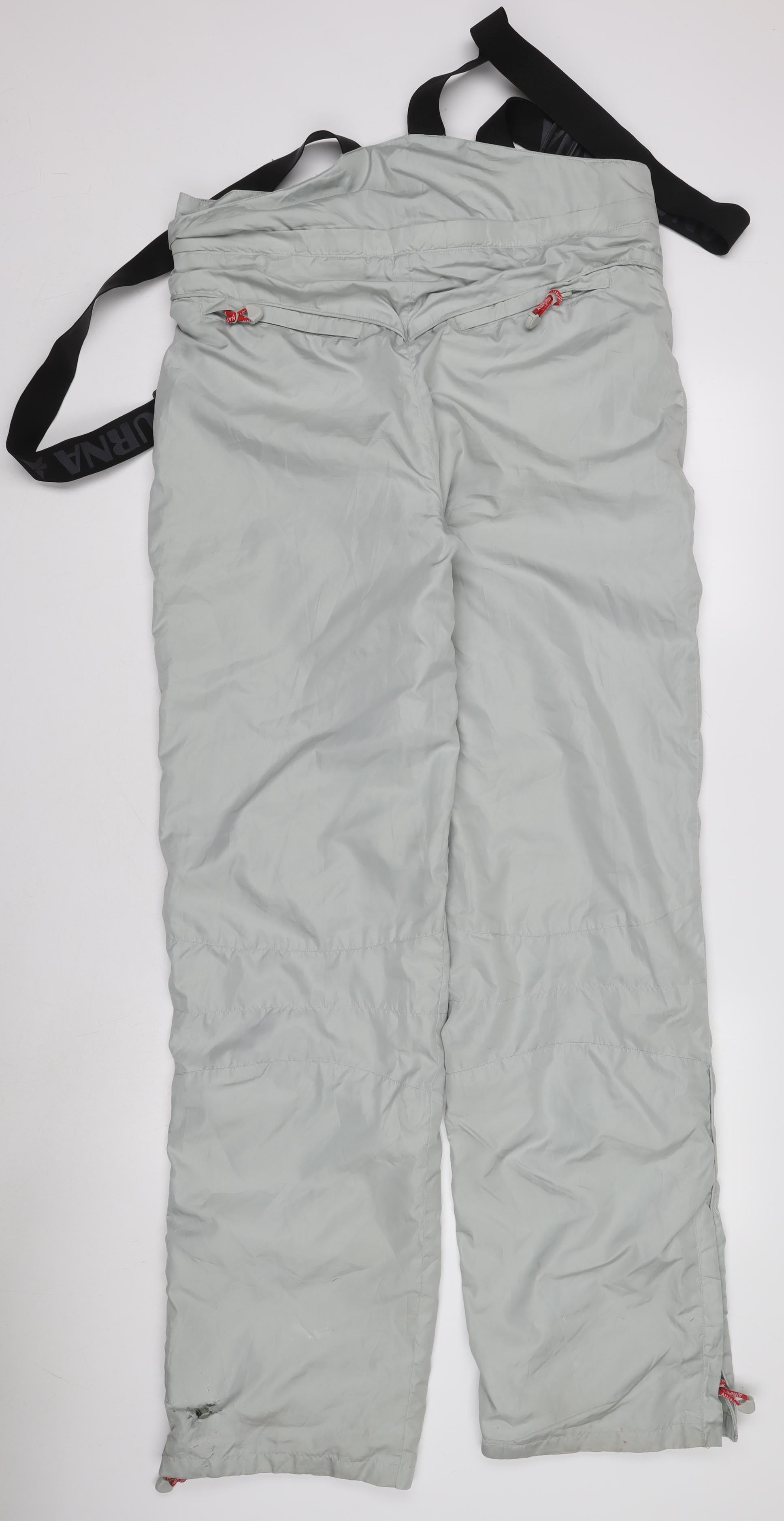 Stay warm, dry, and comfortable in these Anapurna men's grey snow pants, purpose-built for winter sports and outdoor activities. Designed with a durable woven polyester shell, these trousers provide lightweight insulation and water resistance, keeping you protected from snow and moisture during skiing, hiking, or walking in wintry conditions. The sleek light grey colourway gives them a modern, minimal look that’s easy to match with any outdoor jacket or base layer, while the practical design ensures maximum functionality when adventuring outdoors.The trousers feature a secure button and zip fastening at the front, coupled with an adjustable and partially elasticated waist to ensure a comfortable, tailored fit. Built-in black branded suspenders help keep the trousers in place, ideal for vigorous activity in cold environments. Handy side pockets provide space for small essentials, while the reinforced seams and insulated construction deliver both durability and warmth. Crafted entirely from polyester, they’re machine washable for easy care, ensuring consistent performance season after season.Perfect for winter escapes, ski trips, or simply keeping out the chill on frosty walks, these trousers are both practical and versatile. Their clean look and technical build make them a reliable addition to any active wardrobe. Although used and showing a small tear near the lower hem, they remain in good wearable condition with plenty of life left for future adventures. Offering dependable warmth and water resistance, they’re a smart, affordable choice for anyone who enjoys outdoor activities in cold weather.With Anapurna’s trusted quality and technical outdoor focus, these snow trousers combine weather protection, comfort, and style at a great value — ready for anything the season brings.