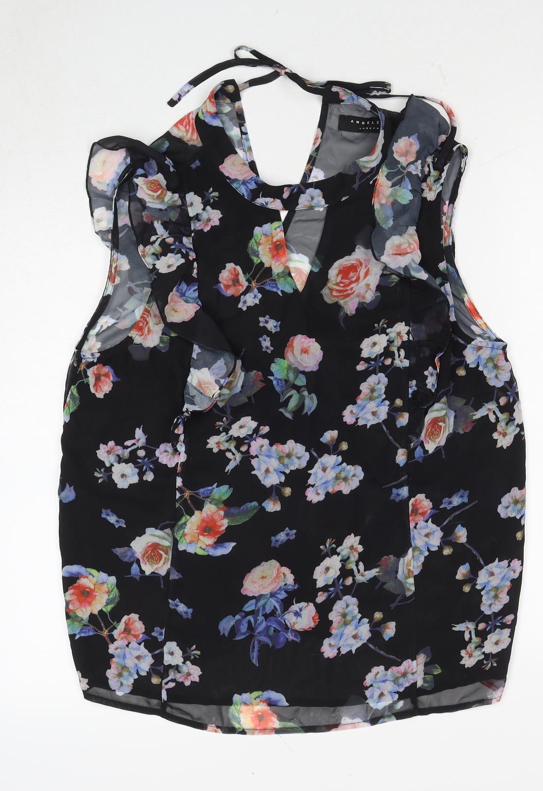 Womens Black Floral Polyester Basic Blouse Size 14 Round Neck