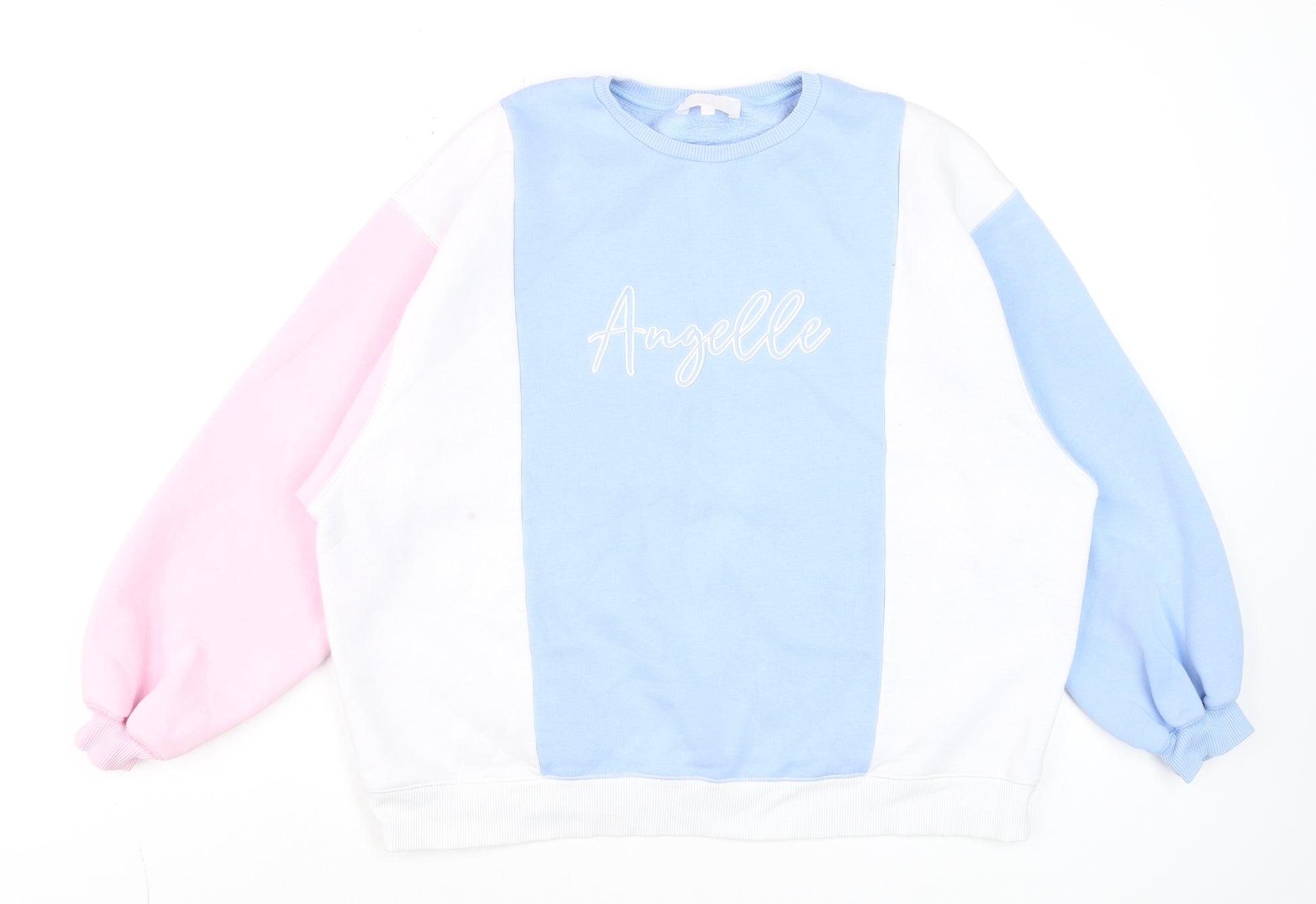 Elevate your casual wardrobe with this stylish Angelle women’s pullover sweatshirt. Designed in a charming multicolour palette of pastel blue, pink and white, this sweatshirt offers a refreshing, modern aesthetic while maintaining cosy comfort. Crafted from a soft cotton-polyester blend, it provides a smooth and breathable feel against the skin with just the right amount of durability for everyday wear. The classic crew neckline and relaxed, long-sleeve design make it an easy, versatile choice for all seasons. The ‘Angelle’ logo detailing across the chest lends this sweatshirt a chic branded edge without being too bold. Perfect for pairing with jeans, joggers or leggings, this piece offers both style and comfort for women seeking effortless layering options. Suitable for casual outings, lounging at home or light outdoor activities, it delivers a flattering relaxed fit enhanced by ribbed cuffs and hem to maintain shape. This garment is machine washable for easy care, ensuring it remains a staple in your collection for years to come. Slight minor mark present on the front panel, reflected in the price and condition grade. A lovely, comfy addition for everyday fashion lovers seeking soft hues and gentle style in their loungewear edit.