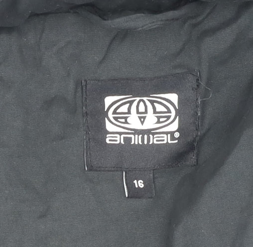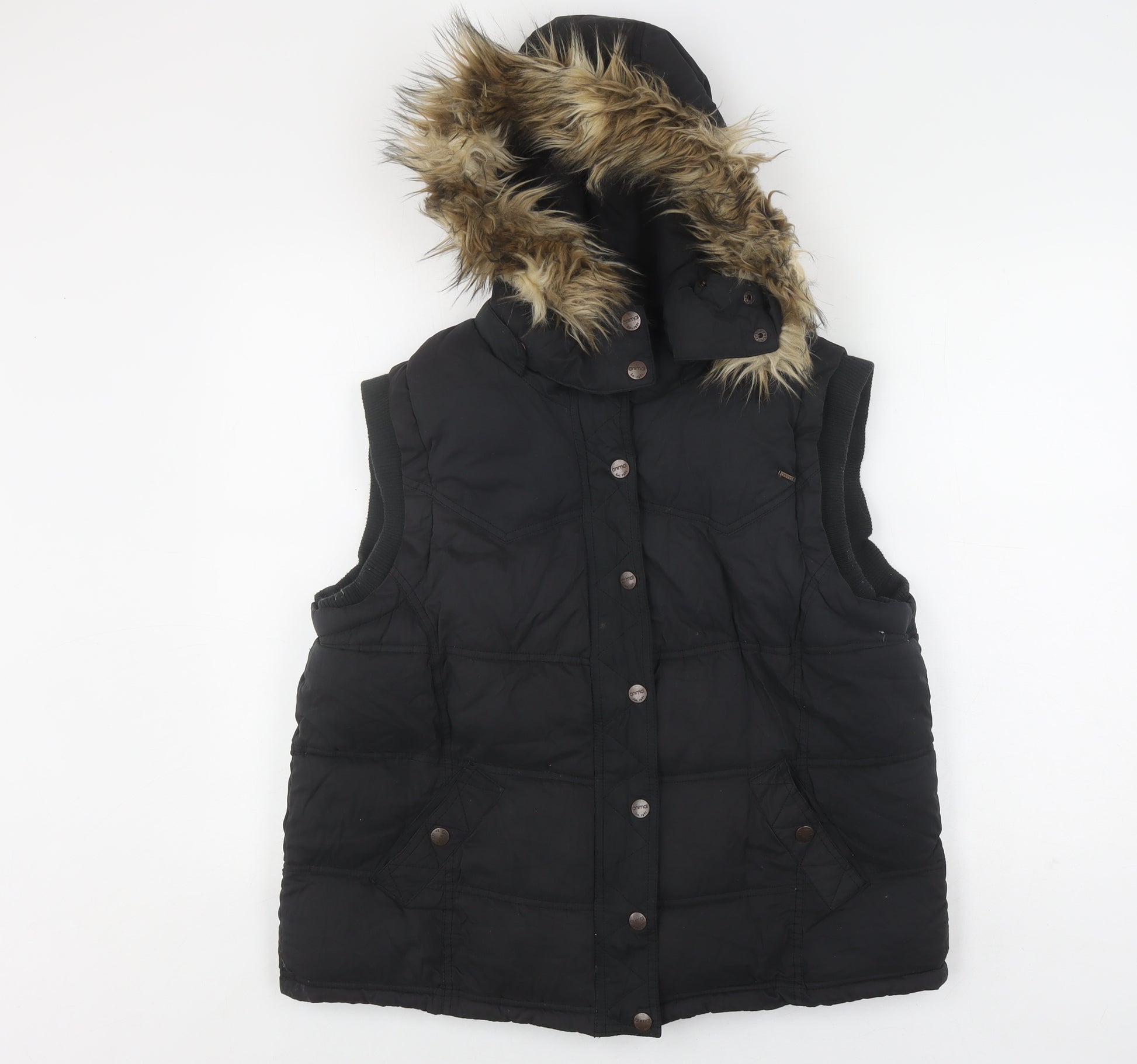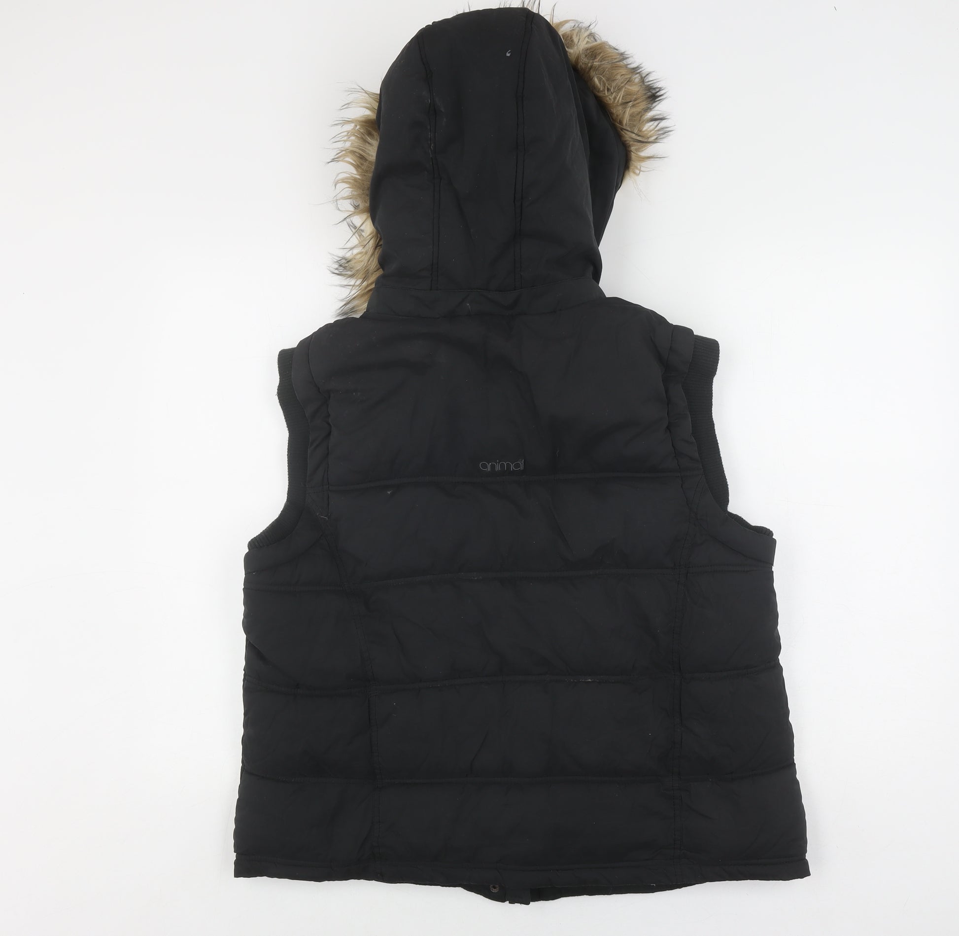 Elevate your winter wardrobe with this stylish Women's Puffer Waistcoat by Animal. Designed in a sleek black hue, this waistcoat is perfect for the modern woman who appreciates both comfort and fashion. Crafted from durable polyester material, the outer shell ensures lasting wear while providing a chic look perfect for casual outings or outdoor adventures. This mid-length waistcoat features a softshell fabric, offering a snug fit without compromising mobility. The down insulation keeps you warm during the chilly autumn and winter months. It includes practical features such as a cosy hood with a trendy fur trim, ample pockets for your essentials, and secure button closure for easy wearing. Its sleeveless design enhances layering versatility, allowing you to pair it effortlessly with long-sleeved tops or jumpers. This waistcoat retains a classic puffer style while nodding to a casual and outdoorsy theme, making it suitable for various occasions. With its regular fit and sleek lines, it's a great addition for anyone looking to stay fashionable and warm. Despite being used, it remains in very good condition with only minor lint and wear. Achieve that perfect balance of function and style with this Animal Women's Puffer Waistcoat.