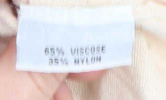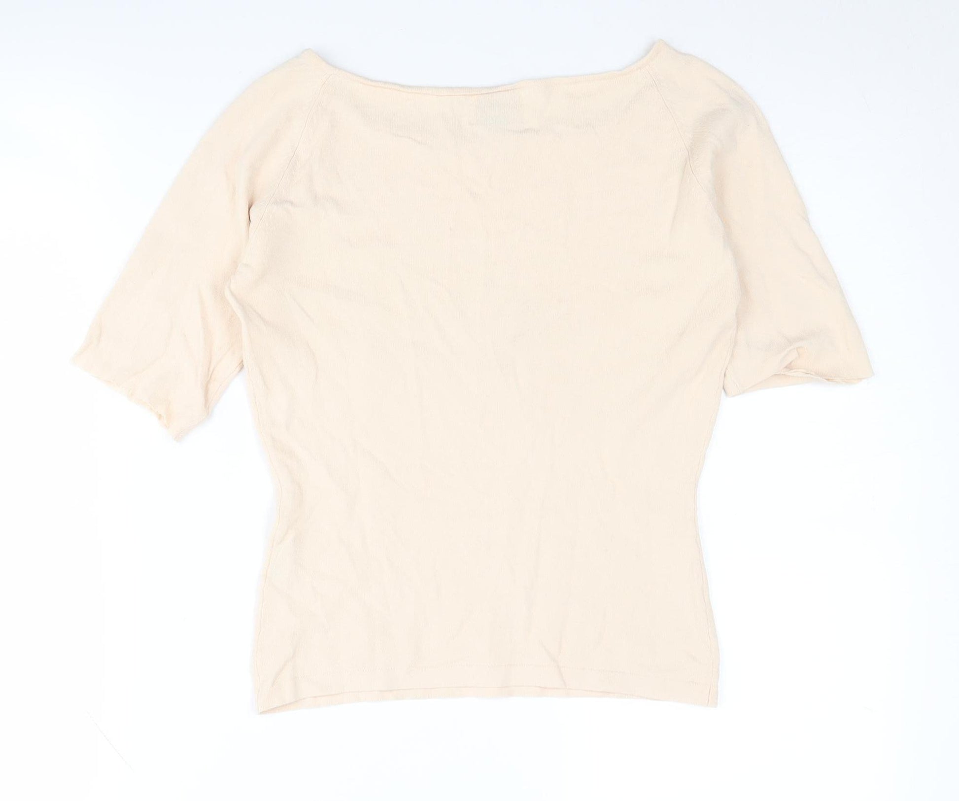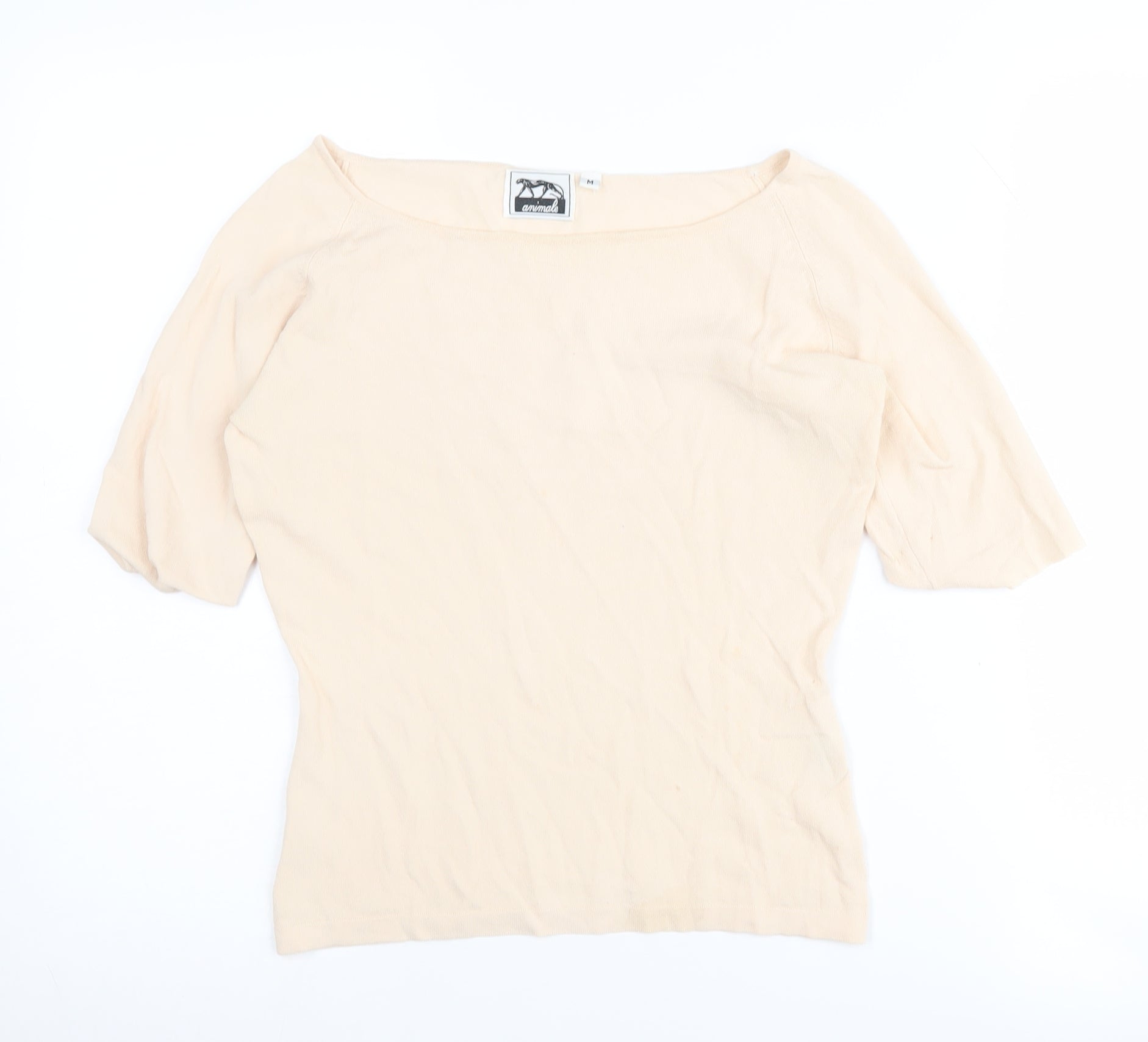 Elevate your casual wardrobe with this elegant beige top from Animale, designed for women seeking style and comfort. This knit garment is crafted from a high-quality blend of viscose and nylon, which provides a soft and luxurious feel against your skin. Featuring a classic boat neckline and fitted three-quarter sleeves, this top adds a sophisticated touch to your everyday look. The simple solid pattern and regular fit make it a versatile piece that pairs beautifully with both jeans for a relaxed outing or a smart skirt for an evening gather. Its lightweight design ensures it's perfect for all seasons, allowing you to layer or wear it as a standalone piece. While primarily tailored for a casual occasion, its understated elegance also fits well in various settings, whether you’re heading to a meeting or enjoying a casual day out. This top offers the convenience of being machine washable, ensuring easy care and maintenance. Despite minor signs of wear, its condition remains excellent, making it a fantastic addition to your wardrobe at an affordable price. Embrace timeless fashion with this Animale top and enjoy the effortless charm it brings to your style.