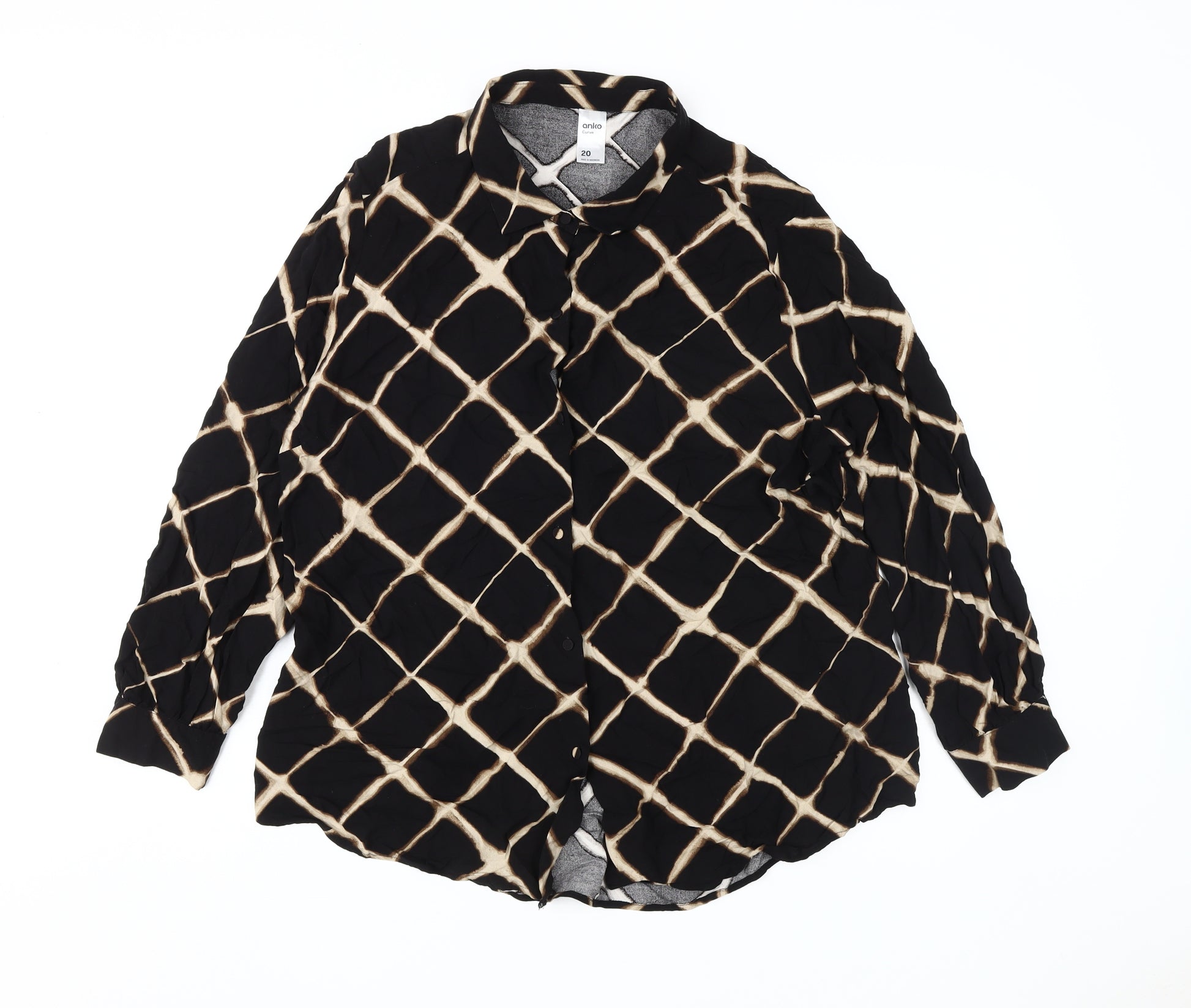 Elevate your wardrobe with this stylish Anko Women's Plus Size Button-Up Blouse, perfectly designed for both comfort and elegance. In a classic black colour, this blouse showcases a striking geometric pattern that adds a contemporary edge to your ensemble. Crafted from 100% viscose, the fabric provides a soft and comfortable feel, making it ideal for all seasons. The collared neckline and long sleeves give it a sophisticated touch, perfect for casual occasions when you want to look effortlessly chic. This blouse is part of the Anko Curve collection, catering to plus-size women, ensuring a flattering fit and style. The button-up closure adds functionality and ease, while the machine washable feature ensures hassle-free care and maintenance. Made in Indonesia, this blouse exemplifies quality craftsmanship. With its excellent condition, you can enjoy the designer look without compromising on quality. Pair this versatile blouse with your favorite jeans for a laid-back day out or style it with trousers for a semi-formal occasion. Its timeless design and high-quality material make it a must-have addition to your fashion collection. Step out in style and confidence with this Anko Women's Blouse, tailored to enhance your look for any event.