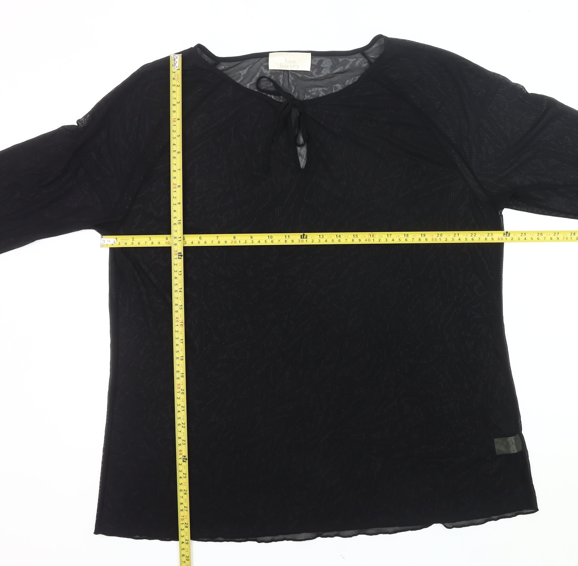 This stylish Ann Harvey women’s blouse offers a chic and versatile addition to any wardrobe. Designed in a flattering plus size UK 22, this lightweight tunic blouse is perfect for layering or wearing alone, bringing both comfort and elegance to your look. Crafted from a high-quality fabric blend of 96% nylon and 4% elastane, it provides a subtle stretch and a breathable, sheer finish that drapes beautifully over the body. The soft sheer mesh fabric creates a delicate and feminine appearance, making it an ideal choice for both casual daytime wear and evening get-togethers.The blouse features a scoop neckline enhanced with a keyhole tie detail, adding a stylish accent that elevates its simple silhouette. With full-length sleeves and a relaxed regular fit, it flatters the figure while ensuring ease of movement. The tunic style gives extra coverage, making it perfect to combine with trousers, skirts or even layered over fitted tops for a trendy look. Finished in timeless black, this blouse’s solid colour provides endless styling opportunities and works season after season. Its sheer, lightweight and stretch features make it especially practical for spring, summer and autumn wear. Pair it with smart trousers for business casual outfits, or with jeans and accessories for a more relaxed party-ready touch. The elegance of the design also means it can be easily adapted for semi-formal events or evening occasions.The garment is machine washable, ensuring effortless care and lasting wear. In excellent pre-loved condition, it has been very gently worn and remains free of flaws. This makes it a wonderful affordable option for those seeking stylish plus-size fashion from a highly regarded brand. Whether you’re updating your everyday wardrobe or looking for a standout piece to take you from day to night, this Ann Harvey tunic blouse is a versatile option that promises both sophistication and comfort without compromise.