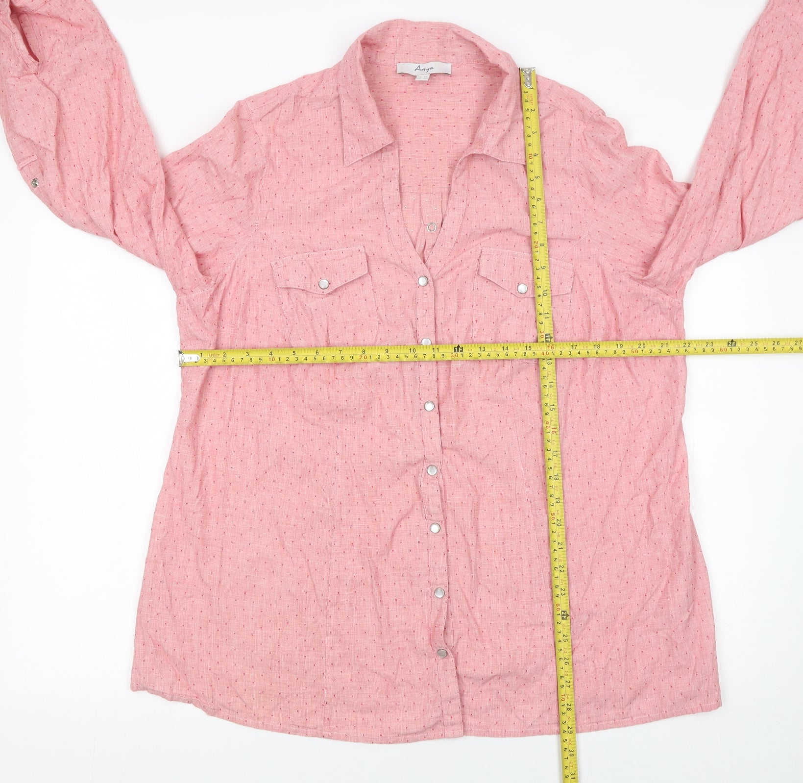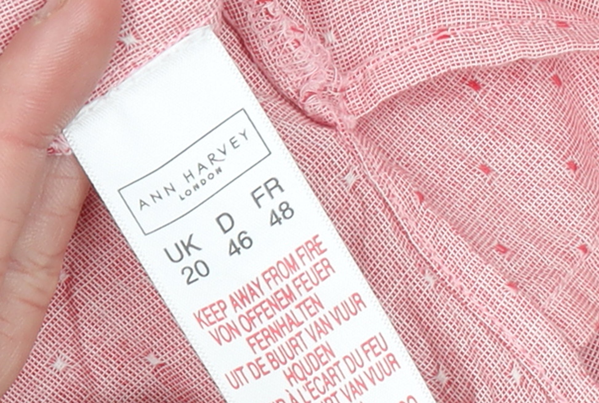 This Ann Harvey womens button-up shirt offers a perfect combination of style, comfort, and easy wear for everyday looks. Designed in a lovely pink hue, the shirt provides a refreshing, feminine touch ideal for the warmer months. Made from 100% cotton, it’s lightweight and breathable, ensuring all-day comfort whether you're out running errands, at work, or relaxing over the weekend.The shirt features a collared neckline and a button-up front, lending a polished yet relaxed appearance. Its long sleeves with classic cuffs and button detailing add subtle structure, while the soft woven cotton fabric gives a gently textured finish that enhances breathability. The regular fit and plus-size cut make it a flattering and comfortable choice for a variety of body types. It’s versatile for layering under knitwear or pairing with jeans or tailored trousers for smart-casual appeal.Ideal for both spring and summer seasons, this pink cotton shirt showcases Ann Harvey’s commitment to creating timeless pieces with attention to fabric quality and wearability. The lightweight construction and breathable cotton fabric make it a great go-to for warmer days without compromising on style. Easy to maintain with machine washable care, the shirt is designed to retain its shape and fresh look wash after wash.This pre-loved item remains in excellent condition, showing only very light signs of wear with no visible damage, stains, or snags. Its timeless style and superior cotton fabrication make it a reliable wardrobe essential for modern women who appreciate comfortable sophistication. Whether styled open over a camisole, tucked into trousers, or worn untucked for casual elegance, this Ann Harvey pink shirt offers effortless charm and versatility for everyday wear.